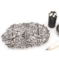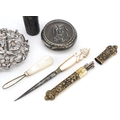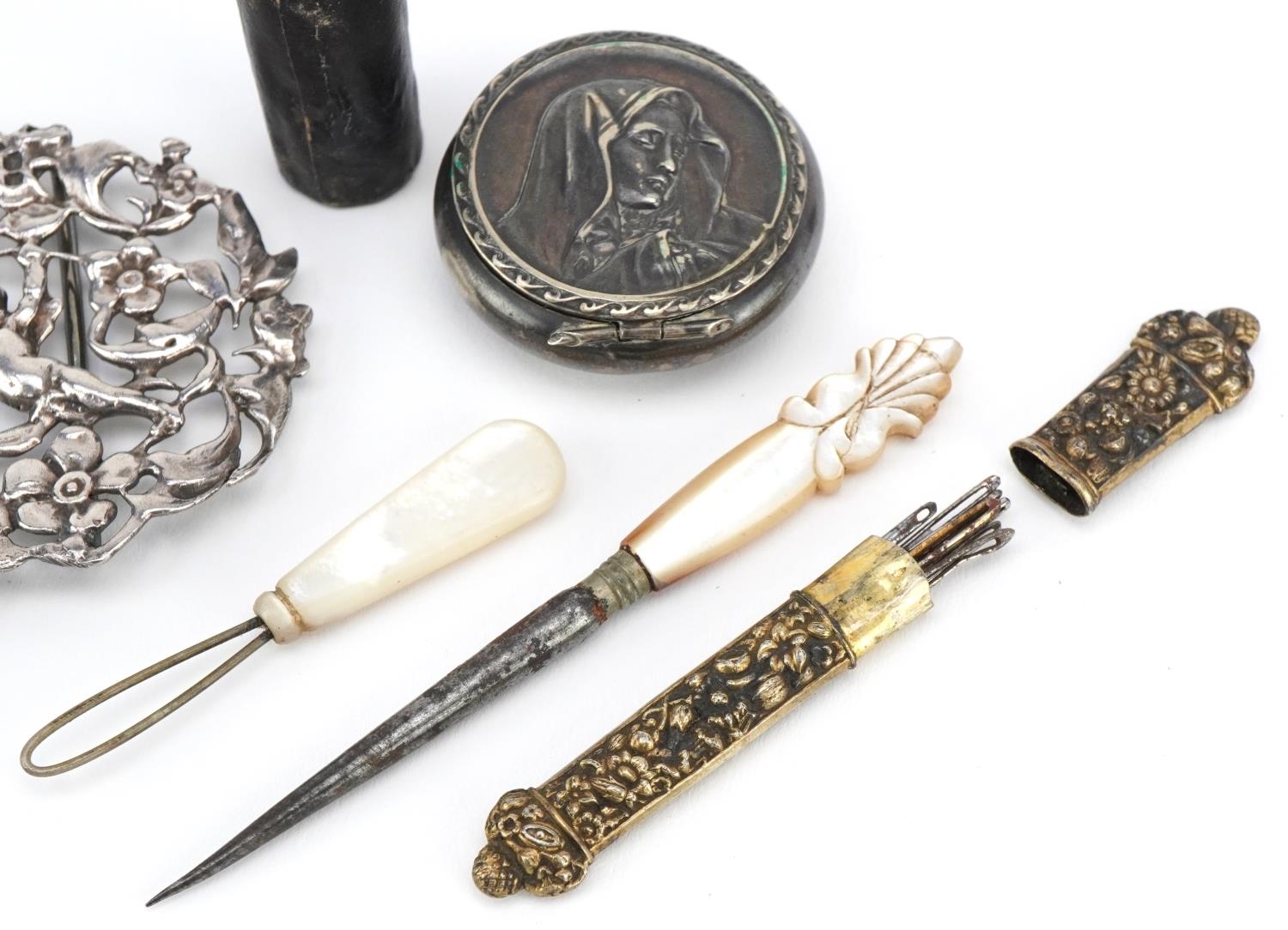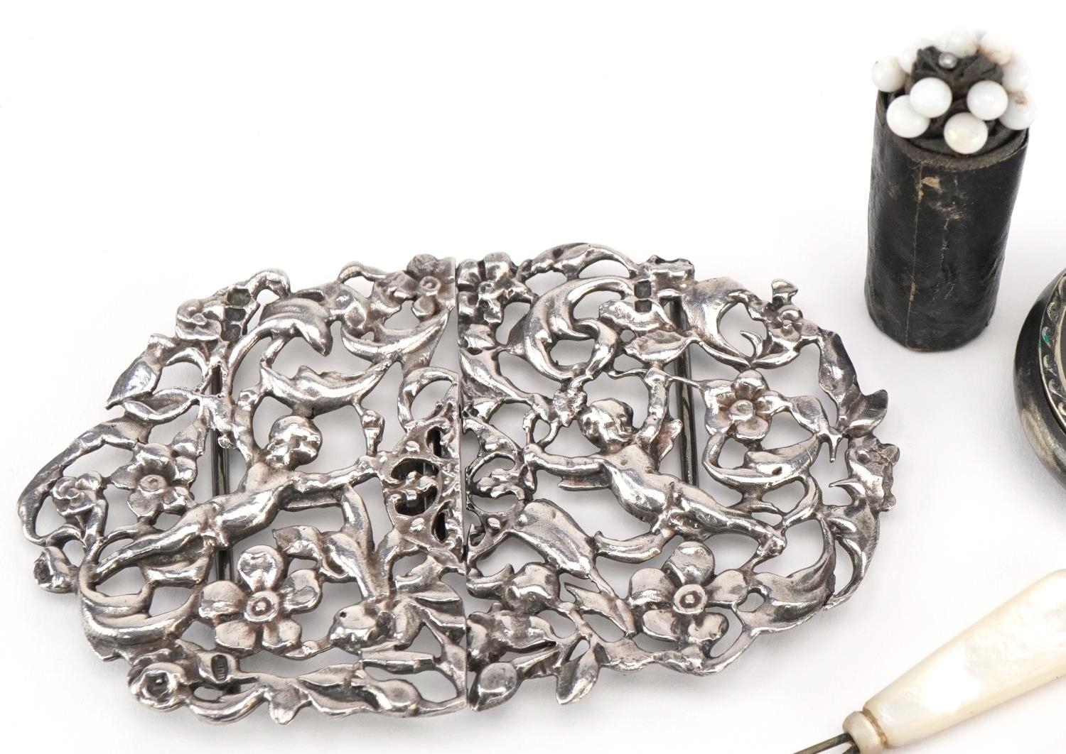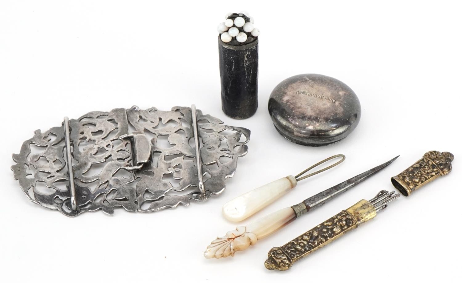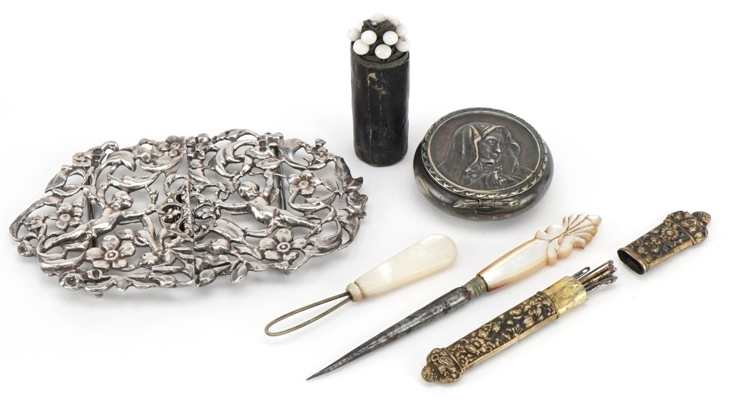 Antique and later objects including a silver two piece nurse's buckle pierced and embossed with Putti, a gilt metal needle case and manicure tools with mother of pearl handles, the largest 9.5cm wide.