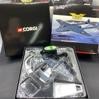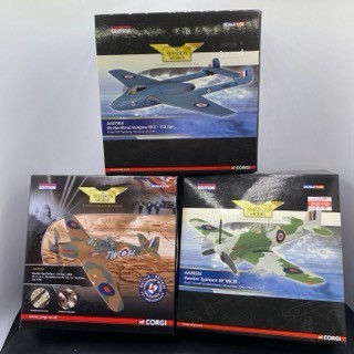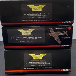 Three Aviation Archive Ltd edn Corgi AA36505 Hawker Typhoon NF Mk.IB, AA39301 Boulton Paul Defiant 141 Sqn, AA37303 De Havilland Vampire FB.5 112 Sqn, 1:72 scale, boxed and appear complete - Planes Very Good, boxes Good (3) 1650g