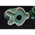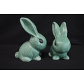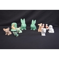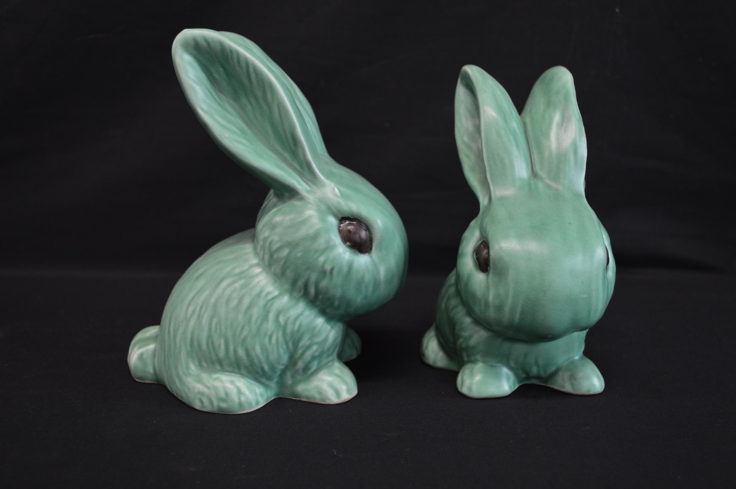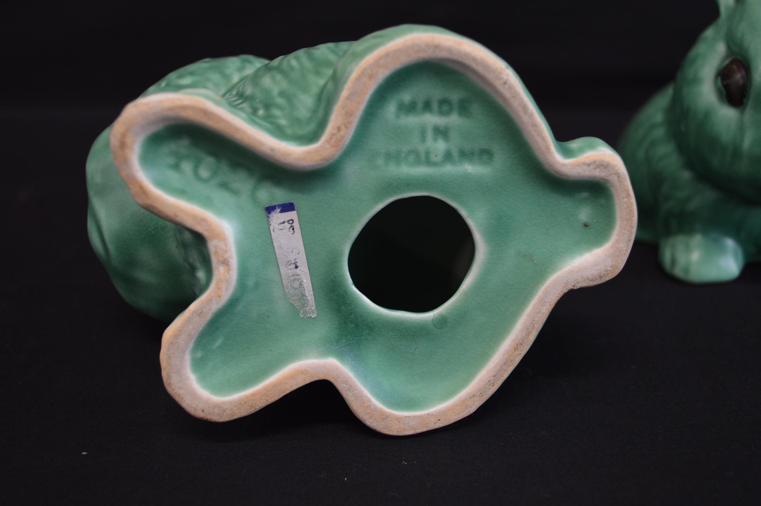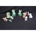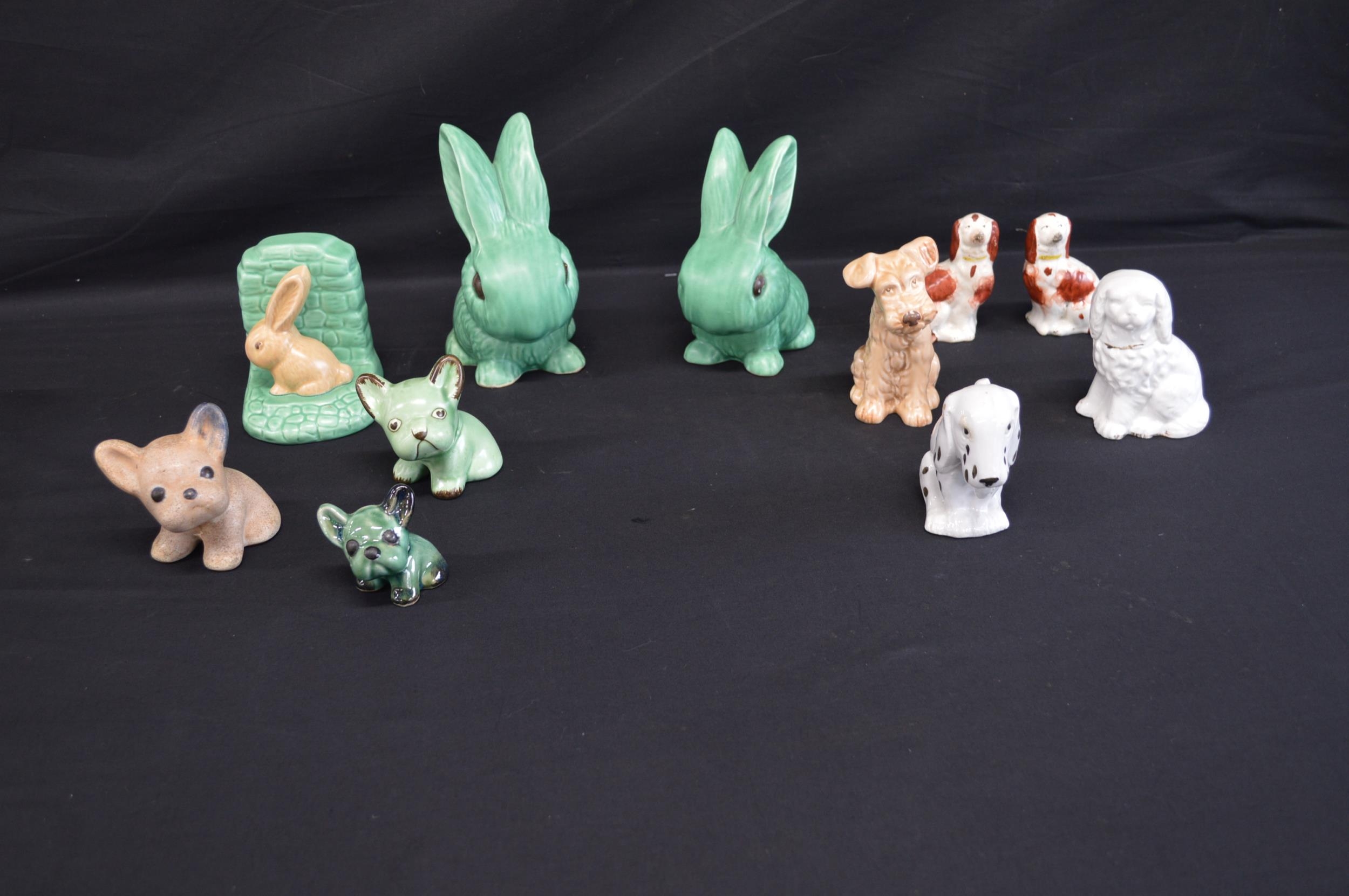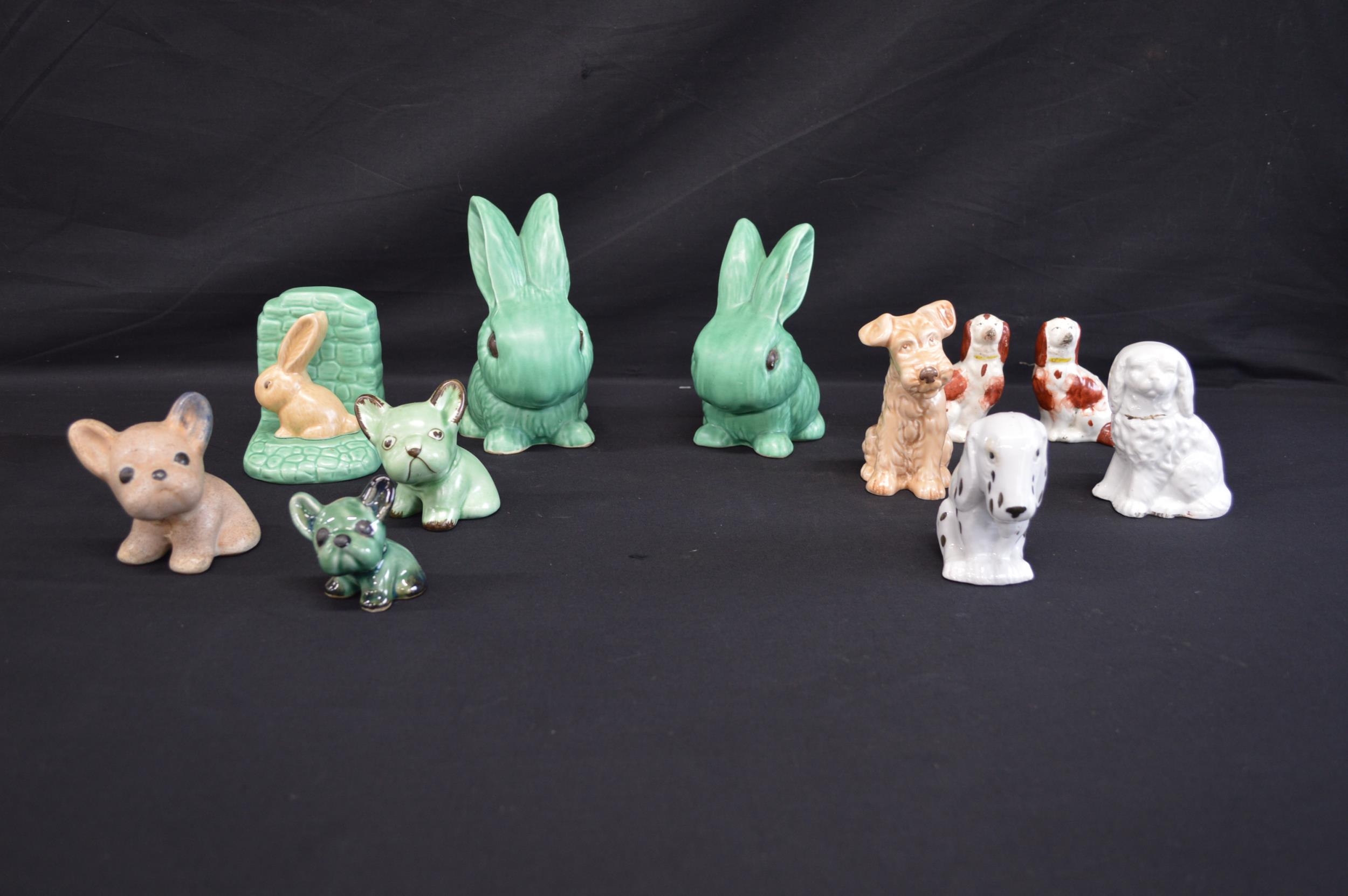 Two green Sylvac rabbits together with Sylvac bookend, Sylvac dog, pair of Staffordshire dogs and five other dog figures