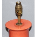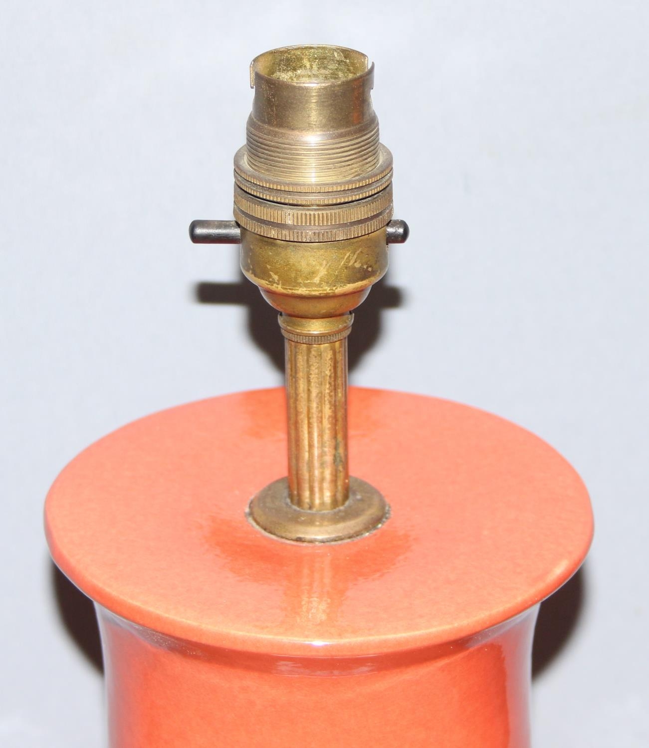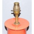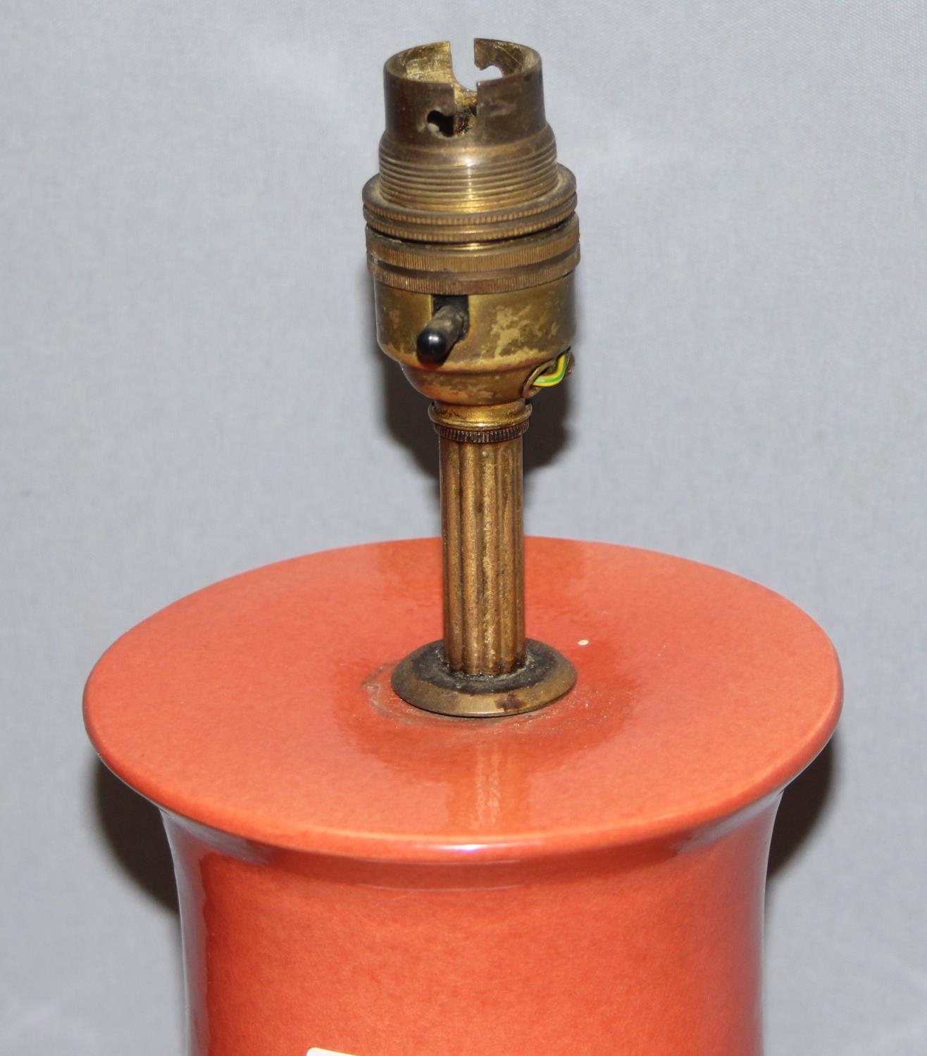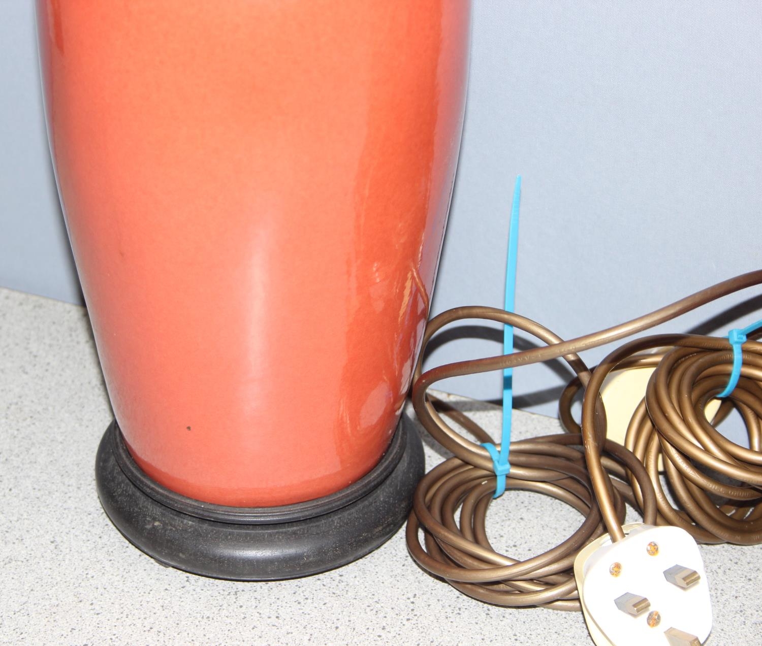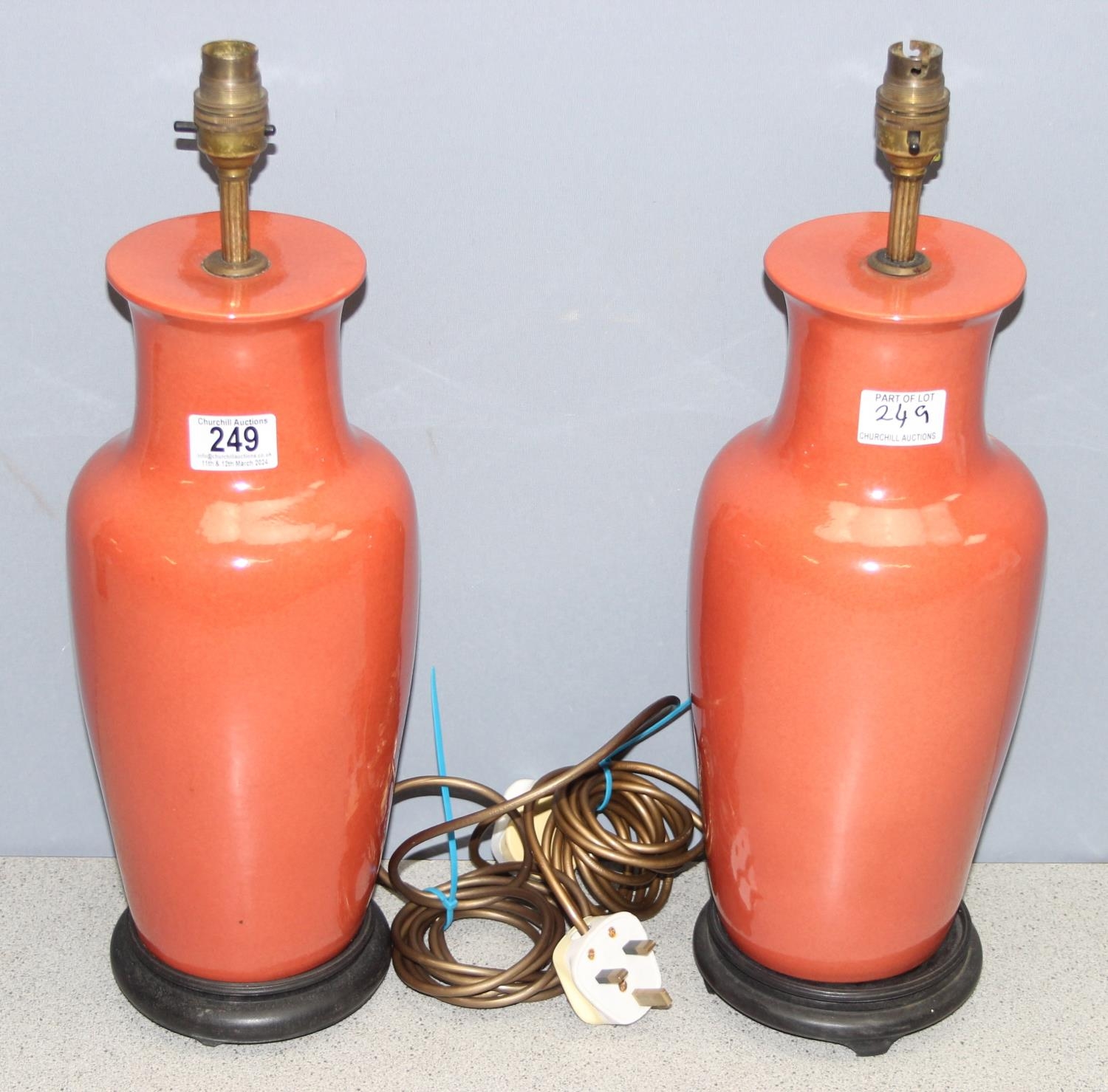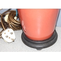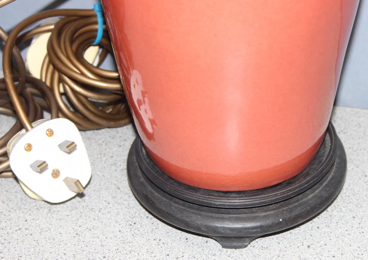 Pair of Chinese style shaped pottery lamps on wooden base, in a orange/red terracotta colour, approx 48cm H