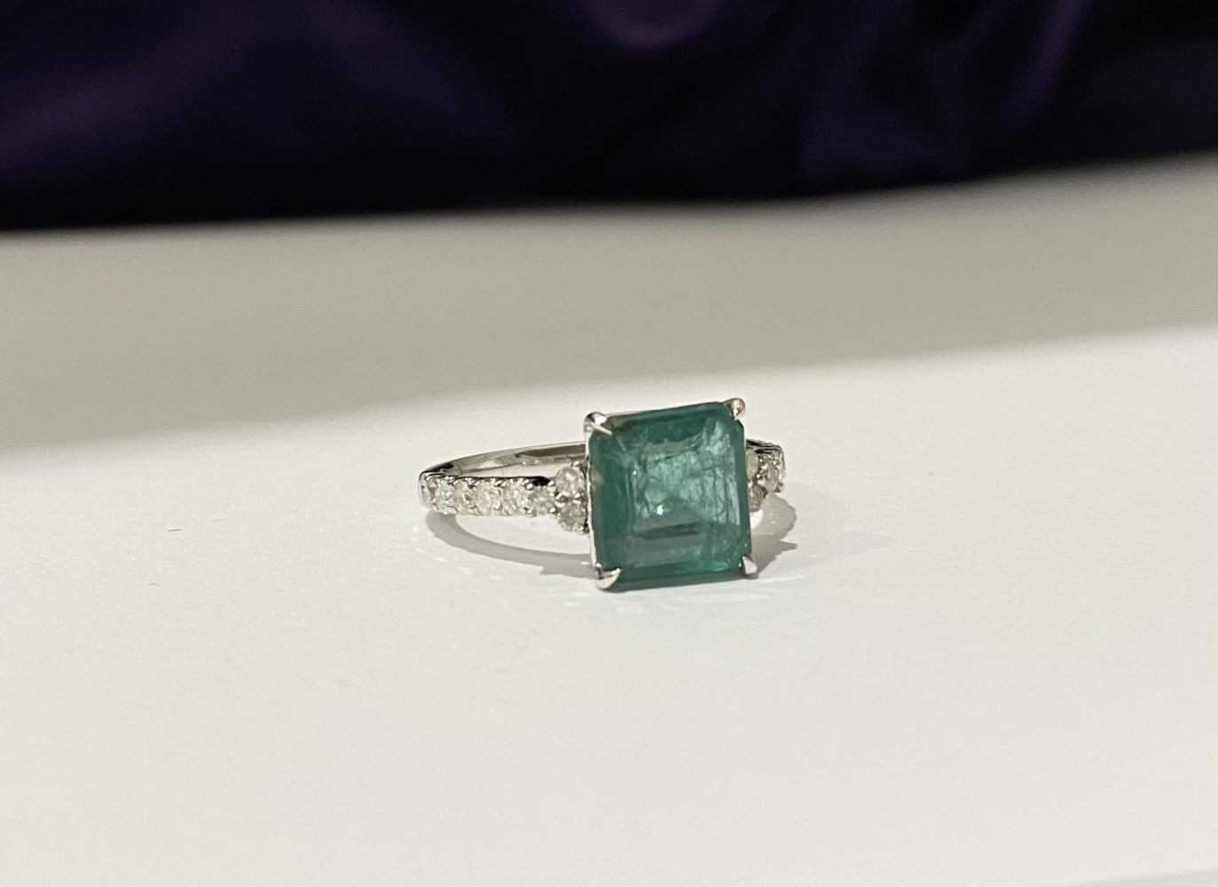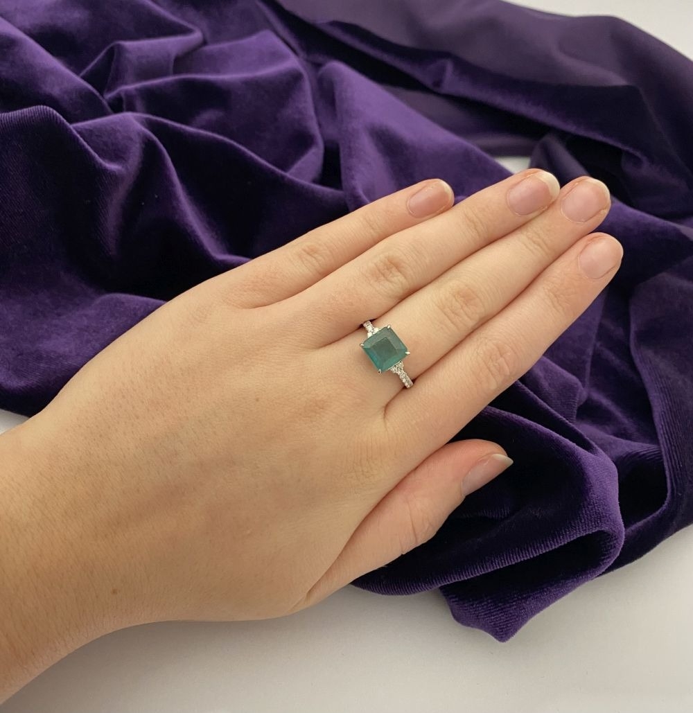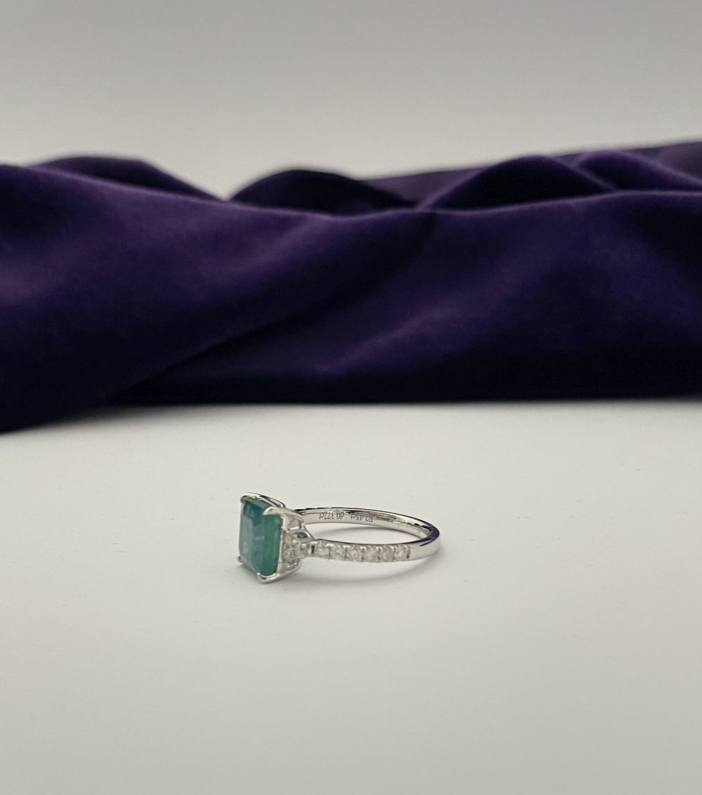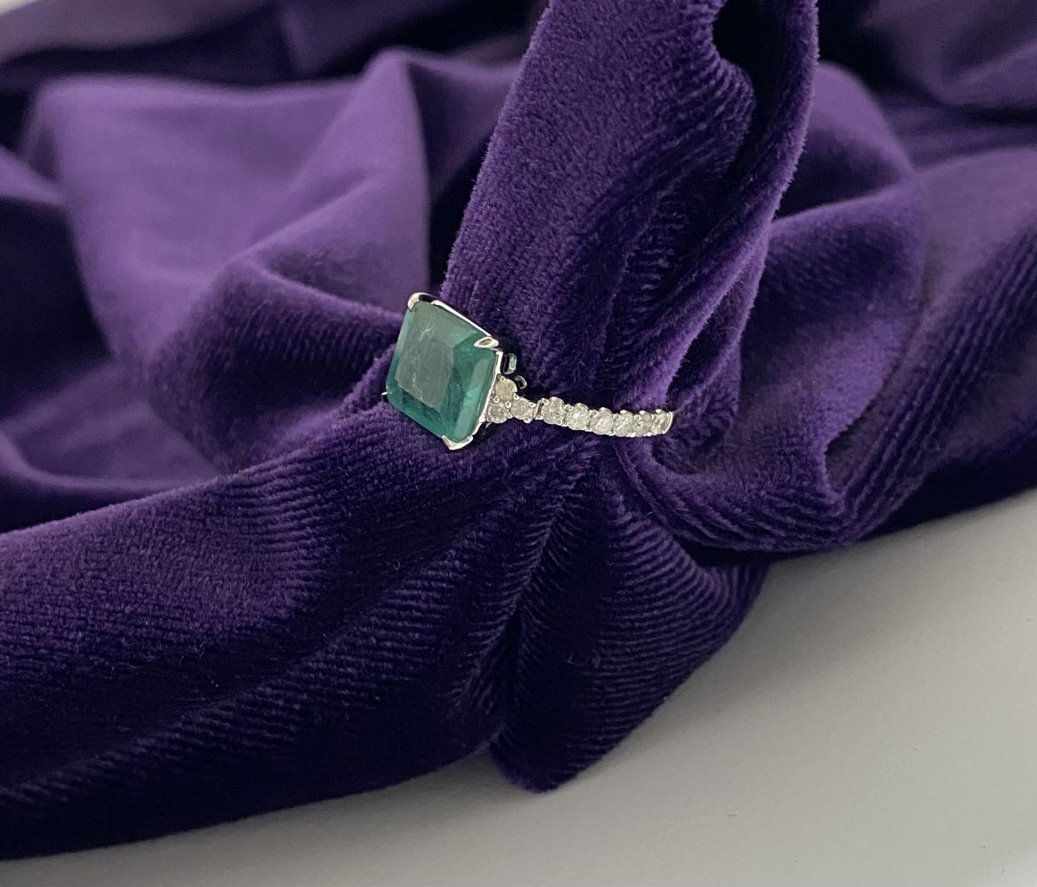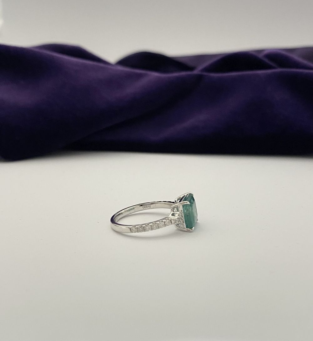 A WONDERFUL PLATINUM EMERALD SOLITAIRE RING WITH DIAMOND SET SHOULDERS, set with natural transparent emerald, 2.45ct weight, with diamond encrusted shoulders, diamond weight: 0.372ct approx. On platinum 900 band. Complete with Antwerp Laboratory for Gemstone Testing report for the emerald. Hallmarked to interior band E2.45ct d0.372ct. Size: N