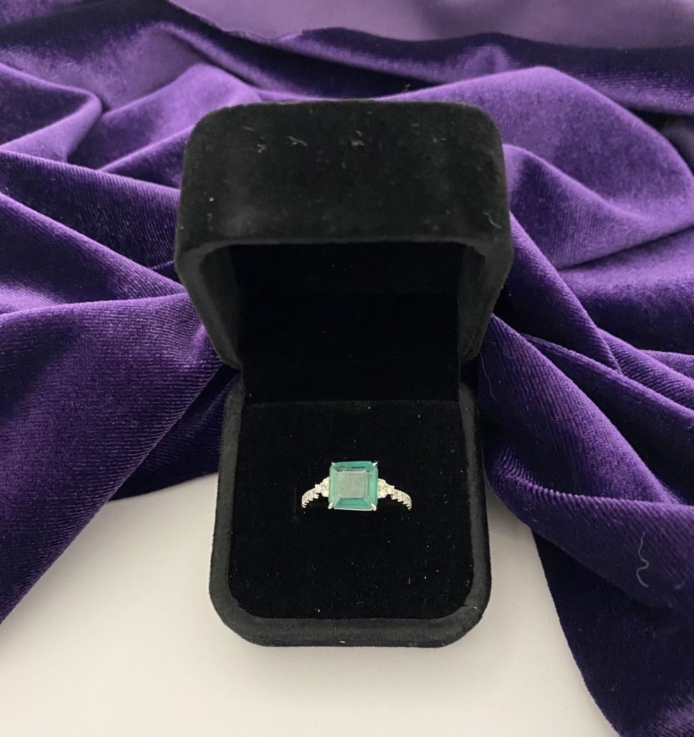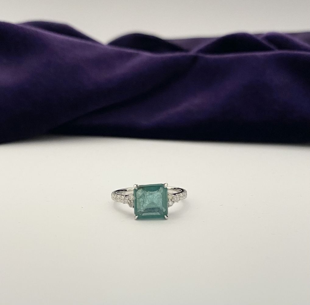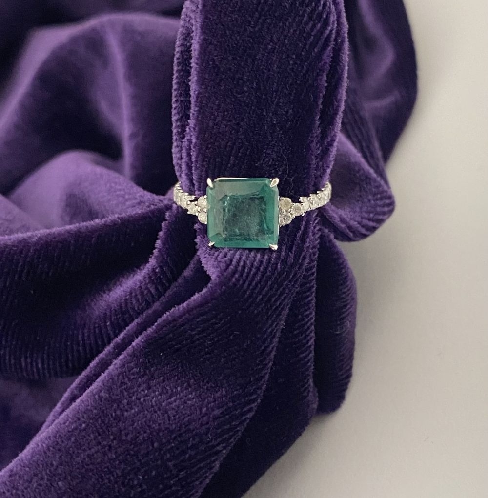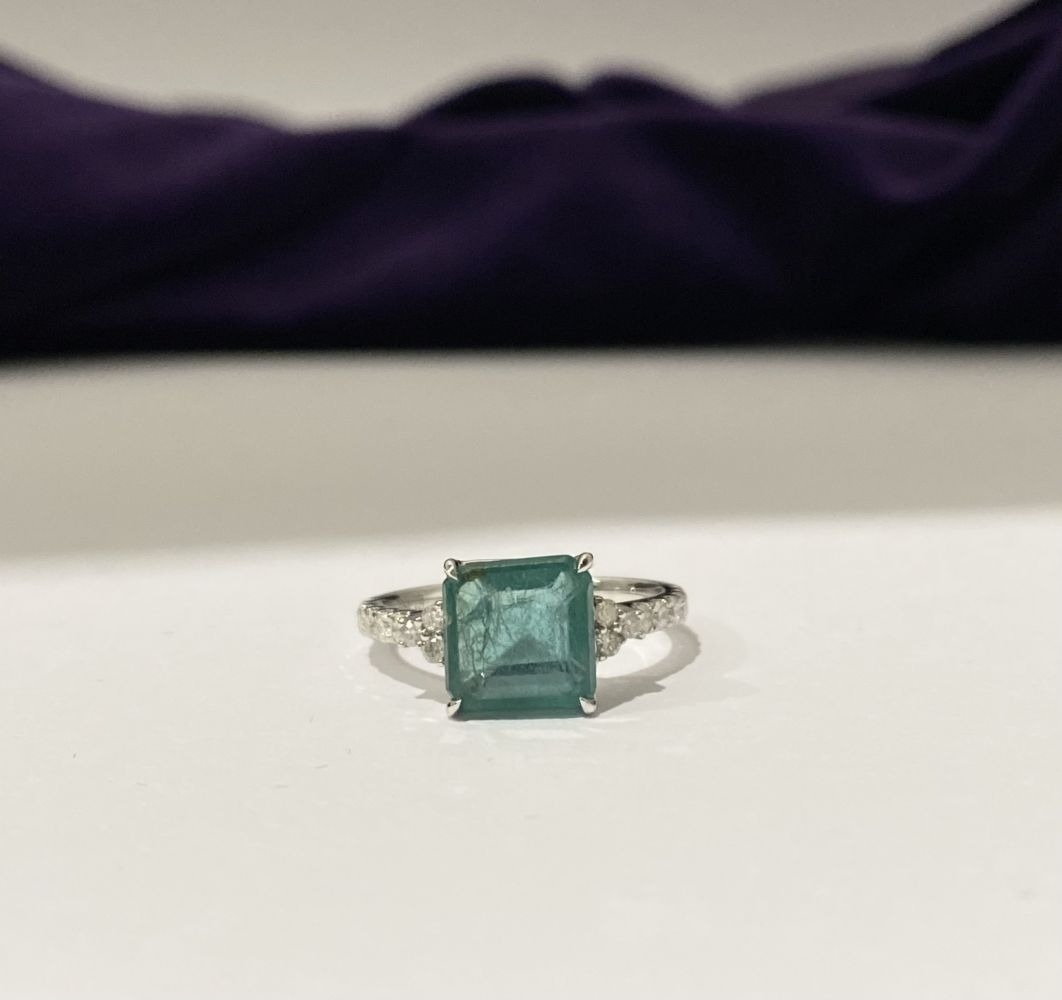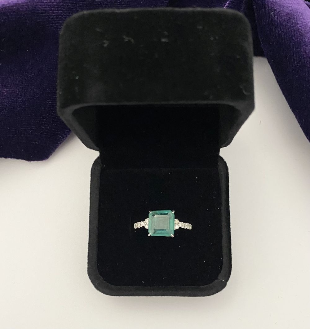 A WONDERFUL PLATINUM EMERALD SOLITAIRE RING WITH DIAMOND SET SHOULDERS, set with natural transparent emerald, 2.45ct weight, with diamond encrusted shoulders, diamond weight: 0.372ct approx. On platinum 900 band. Complete with Antwerp Laboratory for Gemstone Testing report for the emerald. Hallmarked to interior band E2.45ct d0.372ct. Size: N