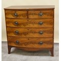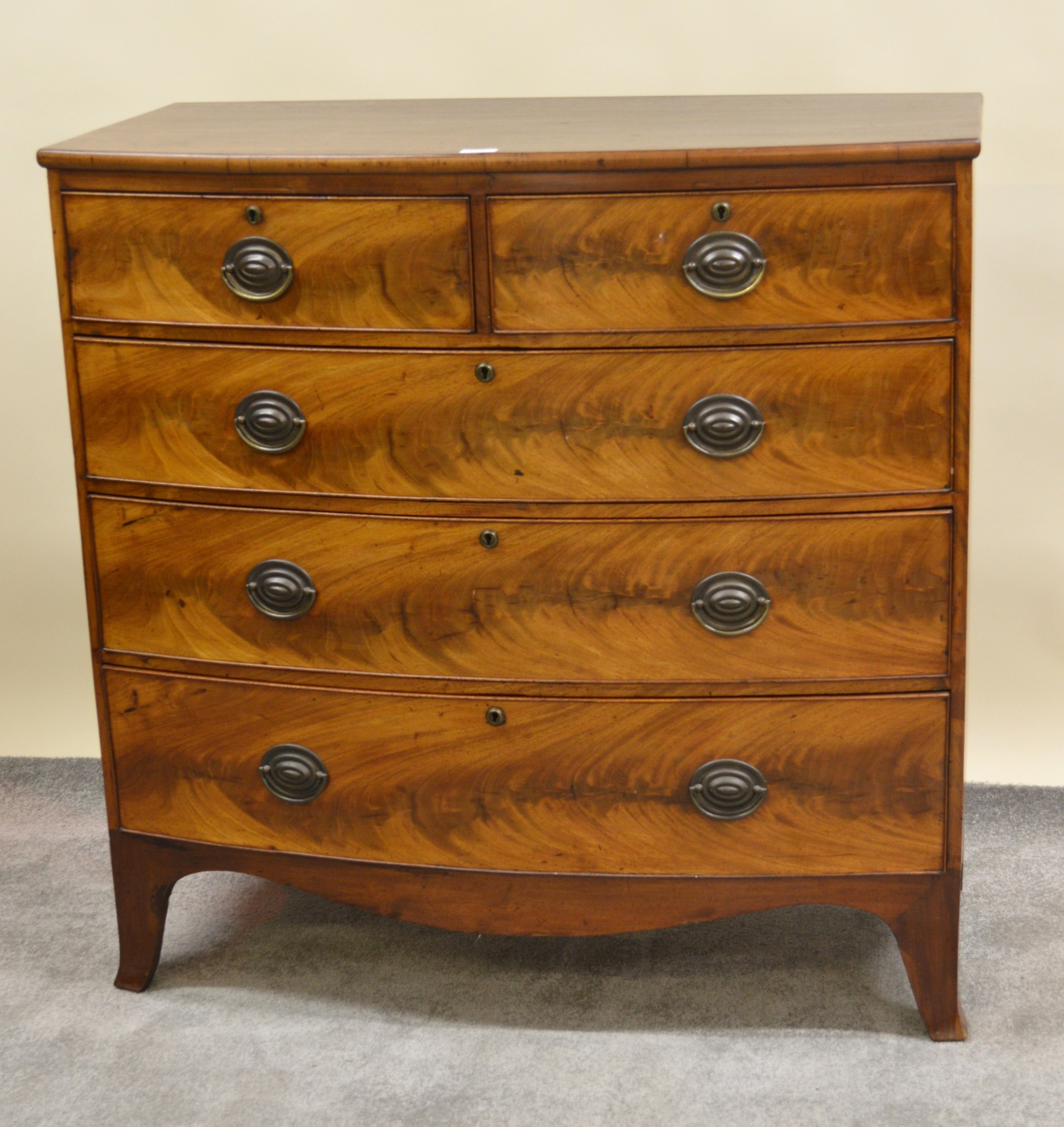 19th Century mahogany bow front chest of two short and three long drawers, with oval brass handles raised splay front supports, 103 x 53 x 103cm