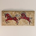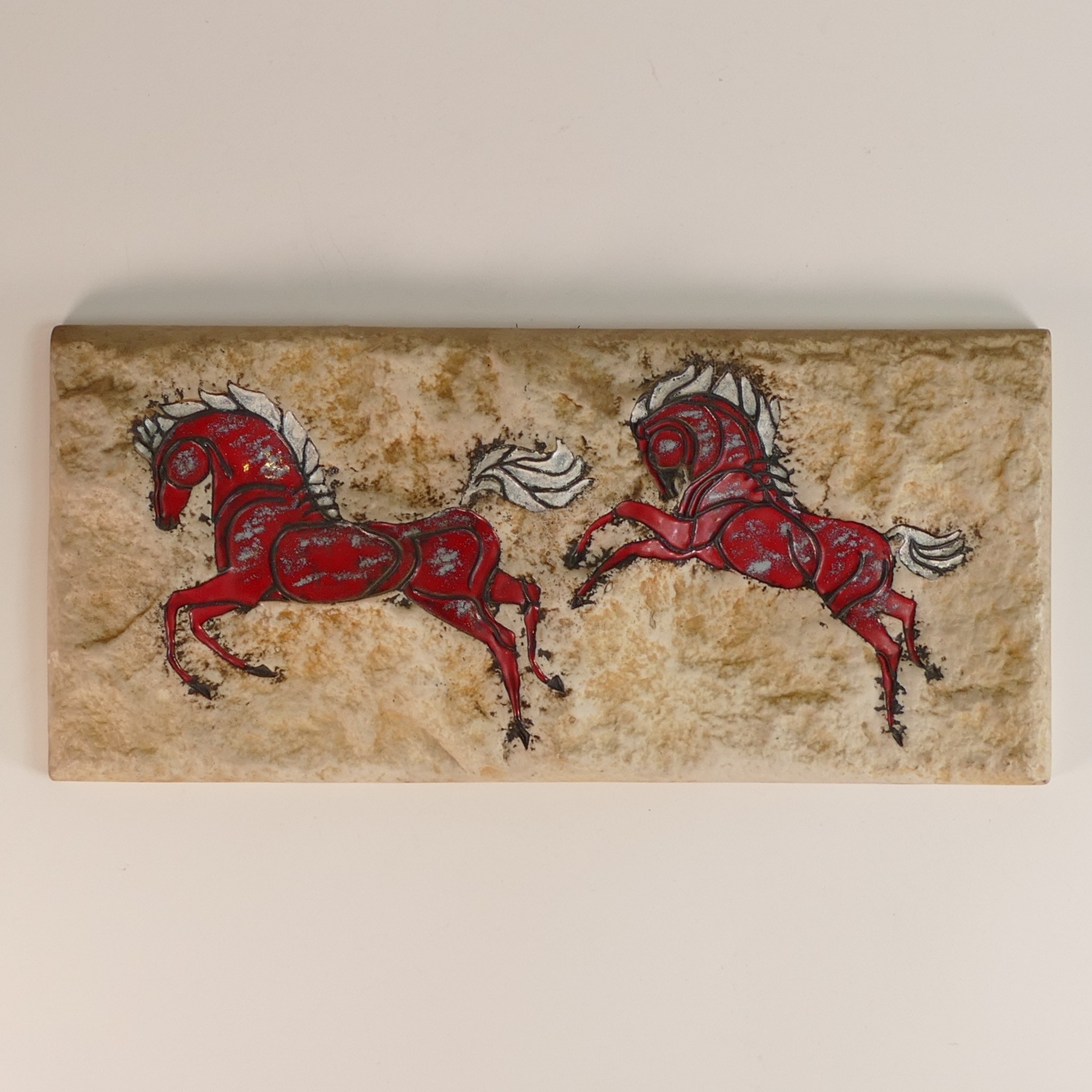 Hagen Renaker for Wade, a ceramic plaque modelled in the form of a primitive image of two horses in red on naturalistic rock back. Height: 15cm Width: 33cm