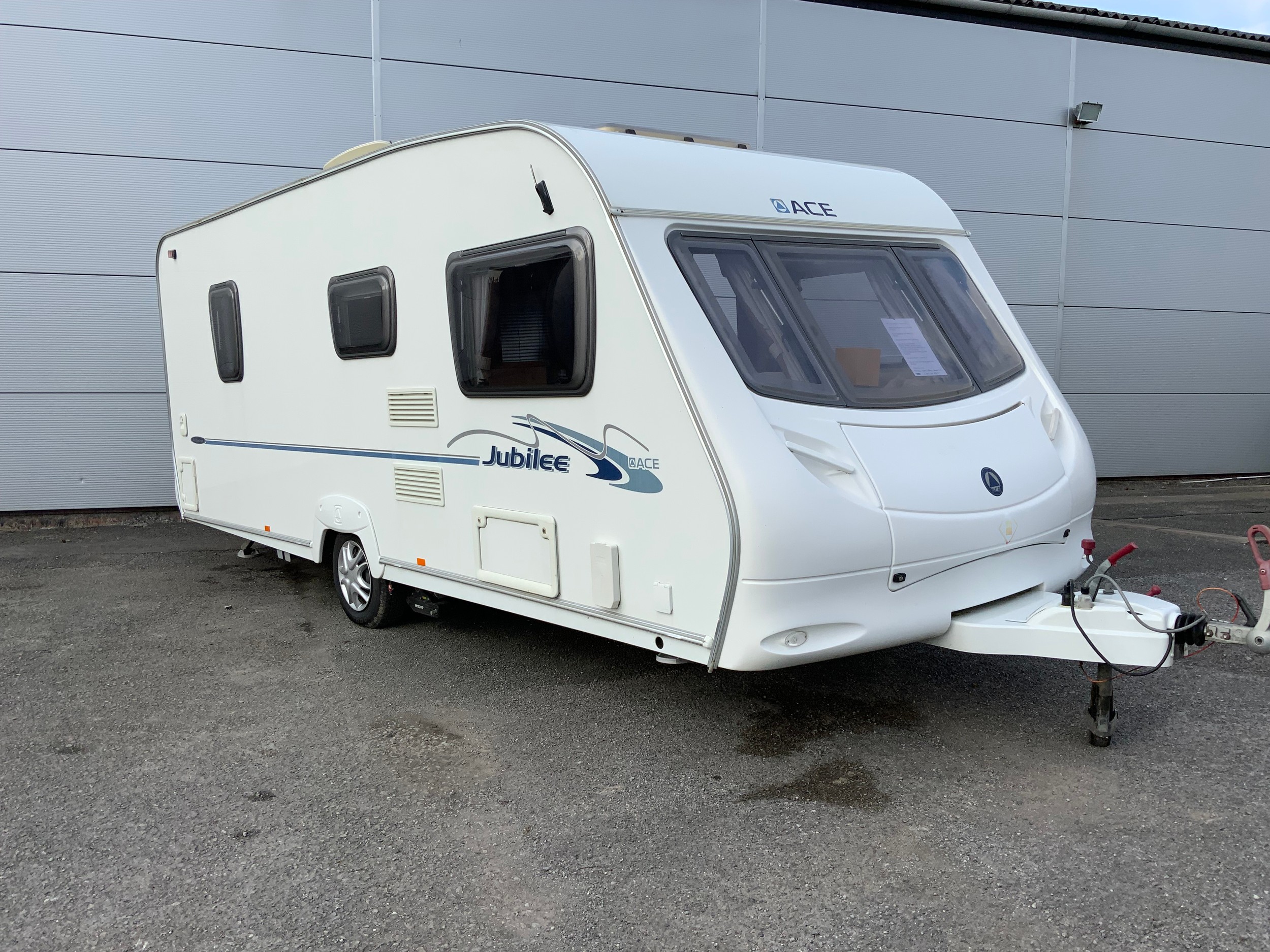 2007 ACE JUBILEE ARISTOCRAT, 4 BERTH REAR FIXED DOUBLE BED EN SUITE. INCLUDES MOTOR MOVER, PORCH AWNING, GROUND MAT FOR AWNING,2 SETS OF KEYS,240 HOOK UP LEAD,FULL WINTER COVER,GAS & WATER CONTAINERS,MICROWAVE,FLOOR HEATING,FACTORY CARPET & HITCH LOCK