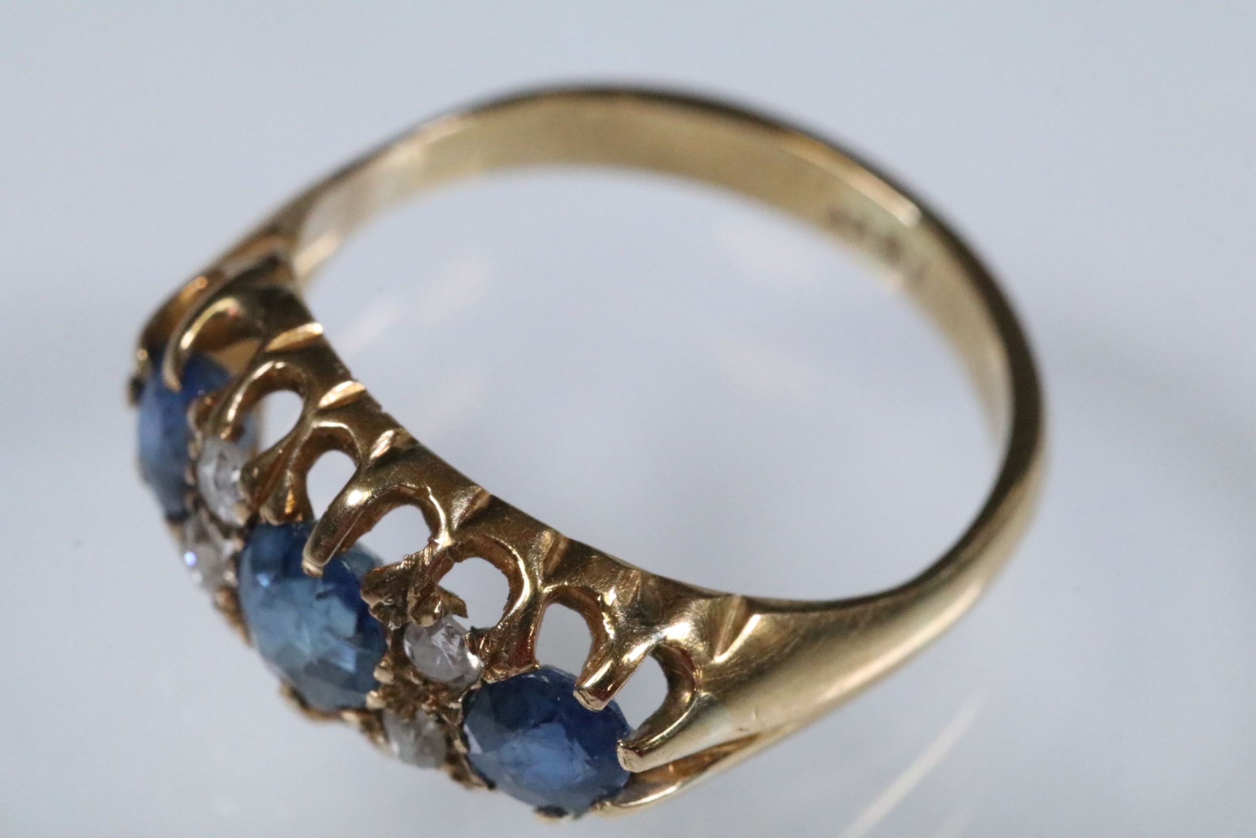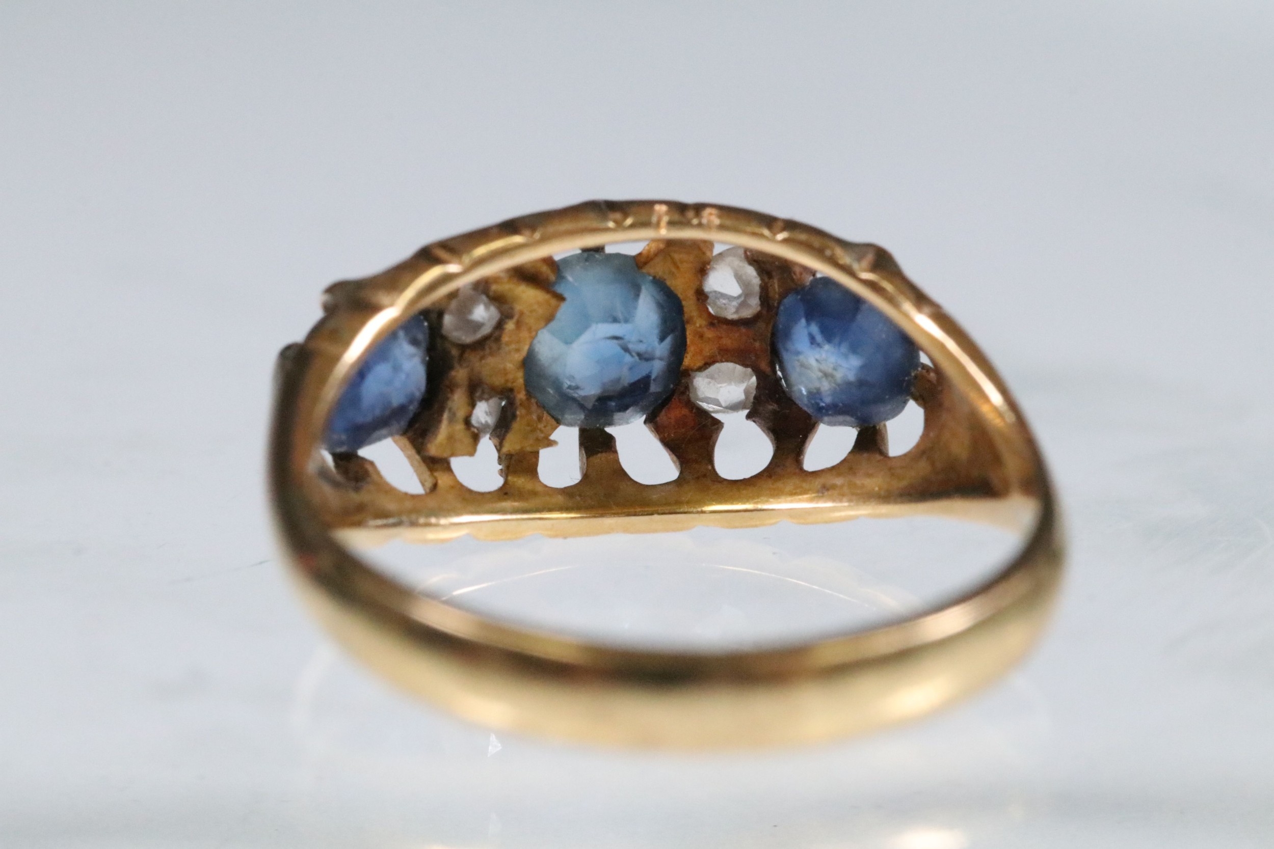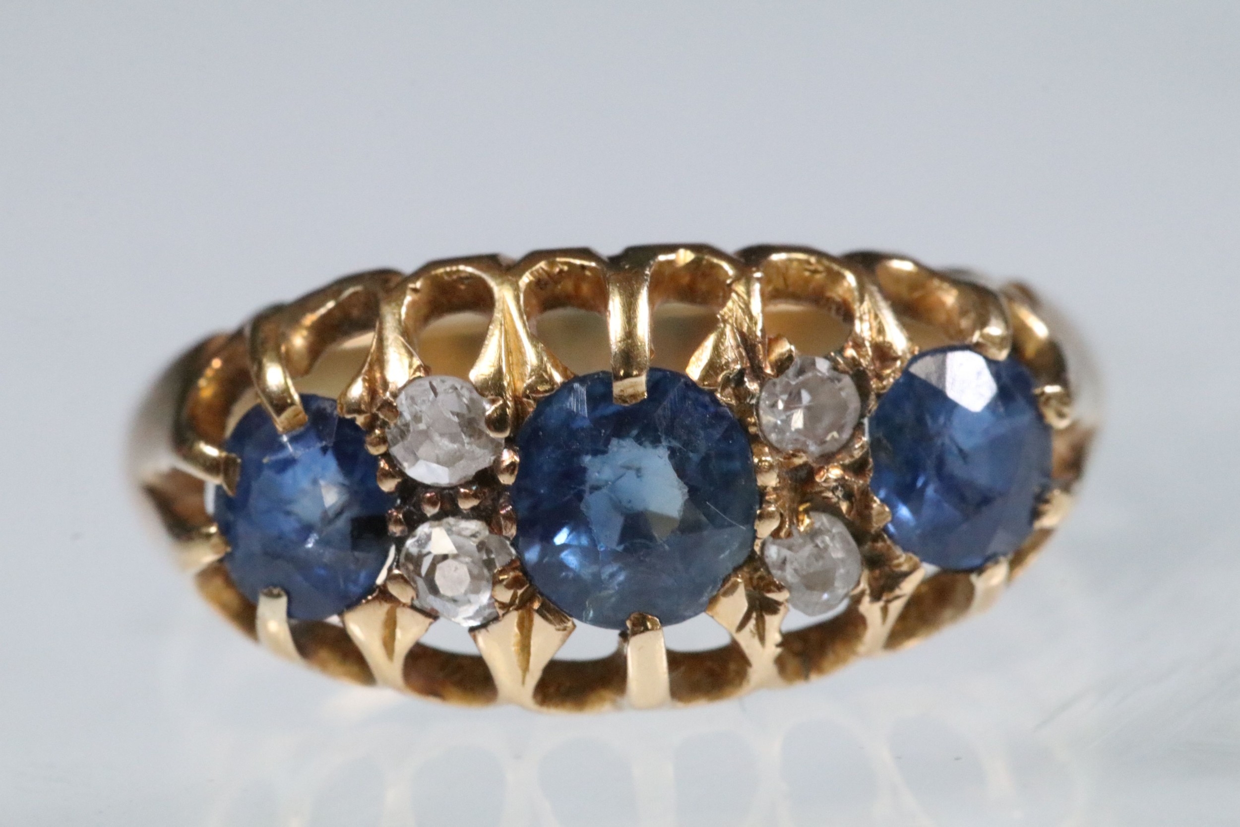 18ct gold, sapphire and diamond ring being set with three round cut blue sapphires with four diamond accent stones. Marked 18ct to the shank. Size L.5.