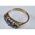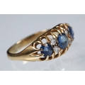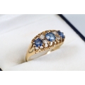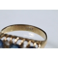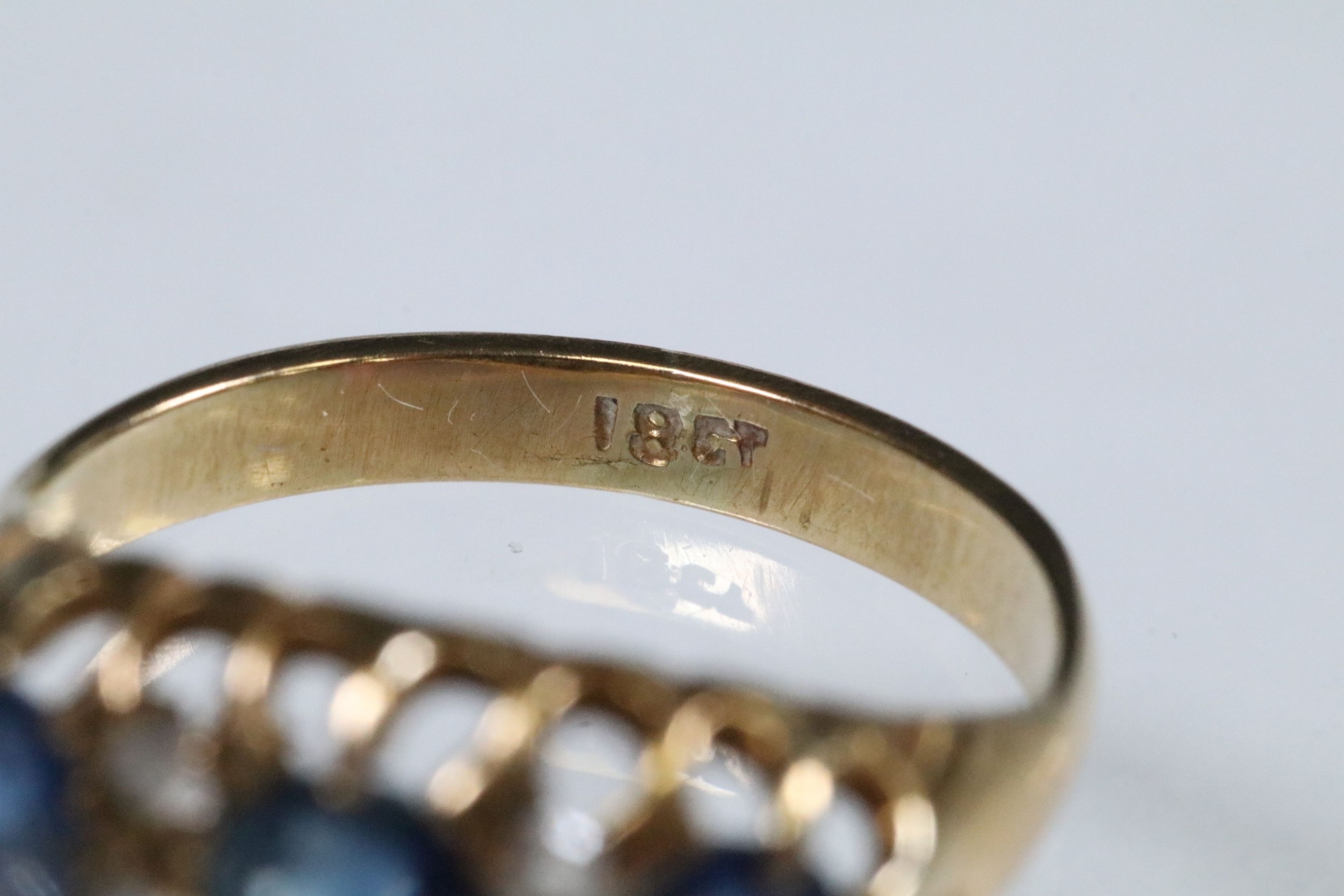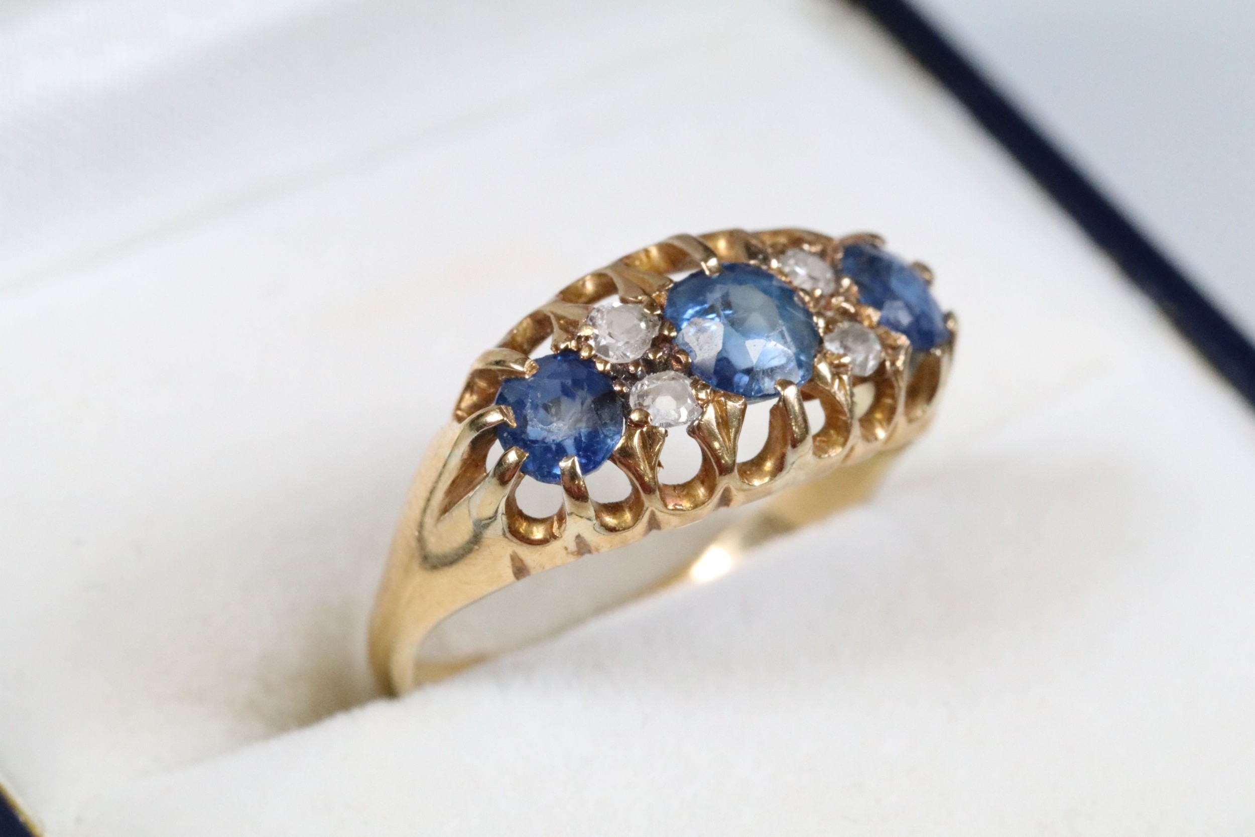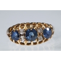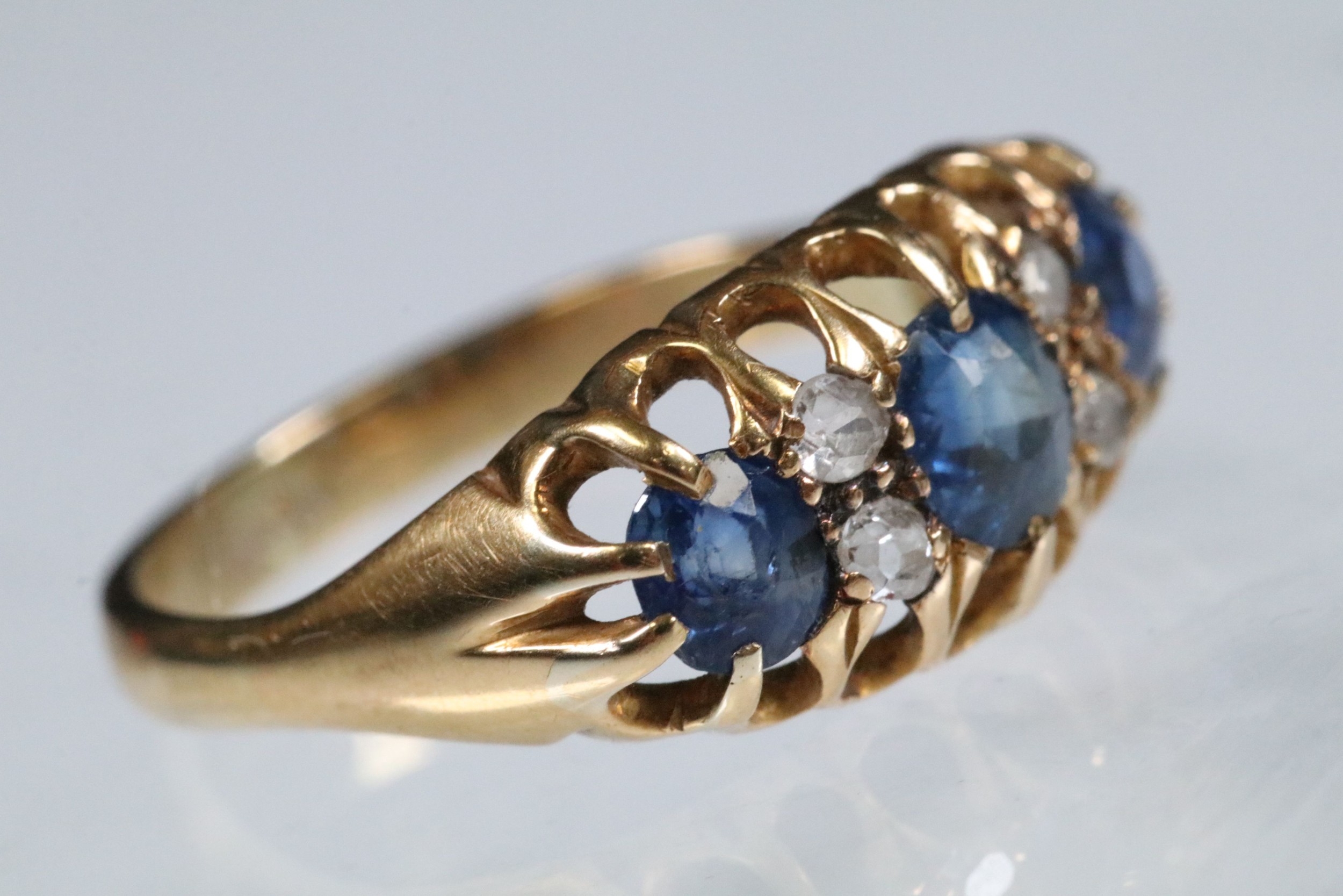 18ct gold, sapphire and diamond ring being set with three round cut blue sapphires with four diamond accent stones. Marked 18ct to the shank. Size L.5.