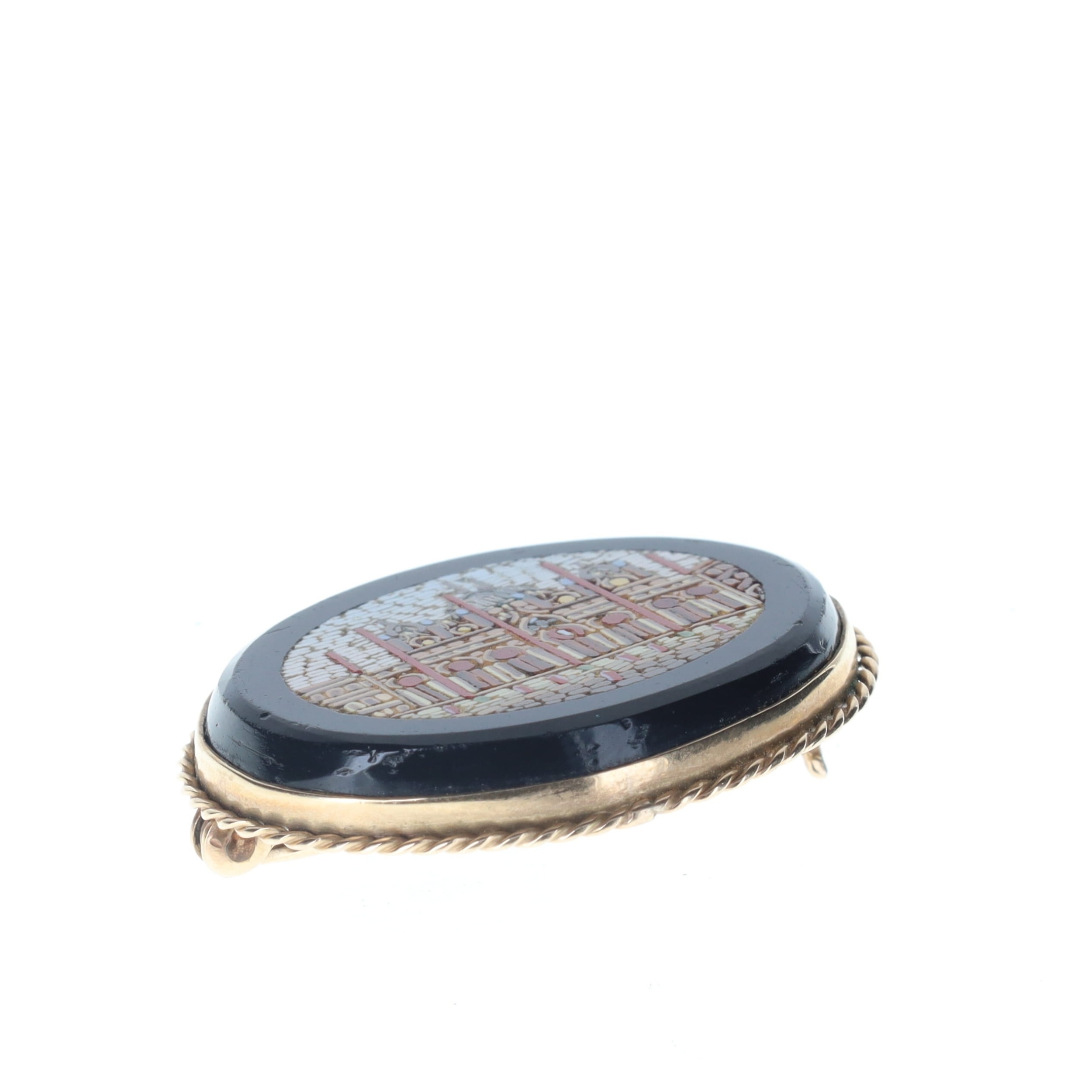 Victorian Micro-mosaic 9ct Gold Mounted Brooch. This piece is stamped 9ct on its reverse. The brooch measures approximately 3cm in length by 2.5cm in height, weighs in total 7.7g.