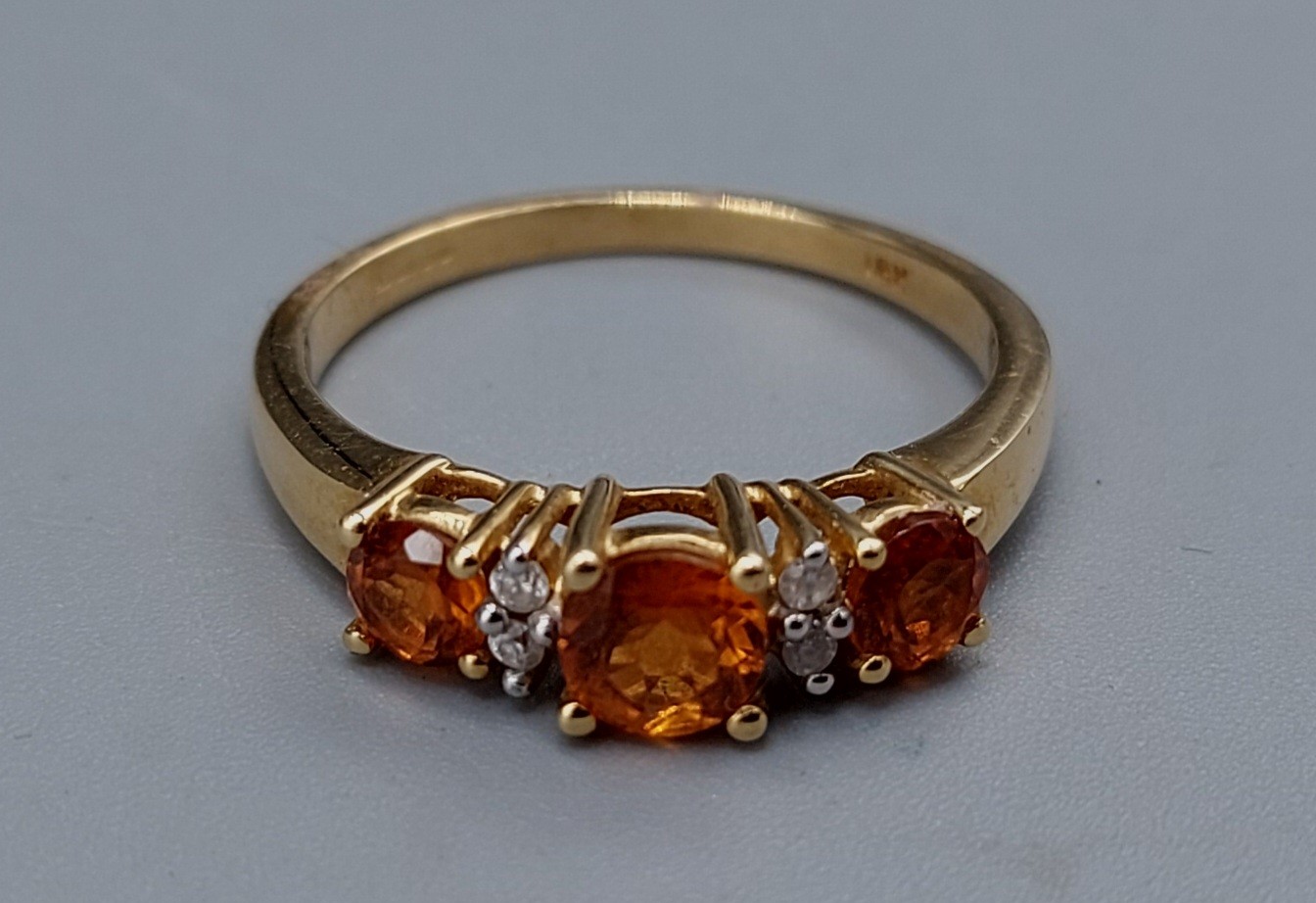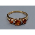 An 18ct gold ring set with three orange stones and four Diamonds, ring size P, 4gms