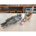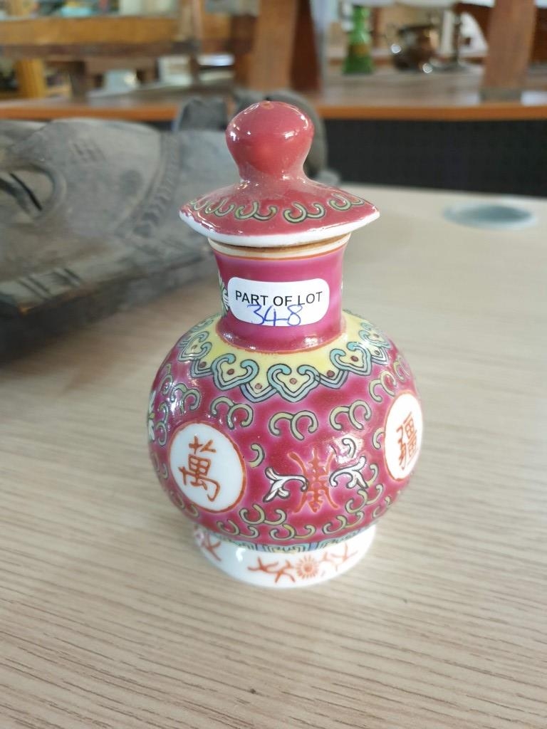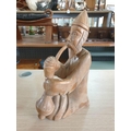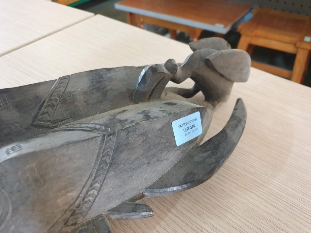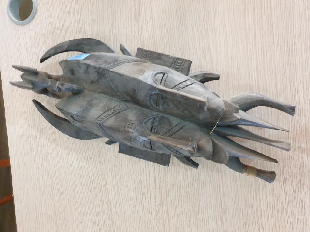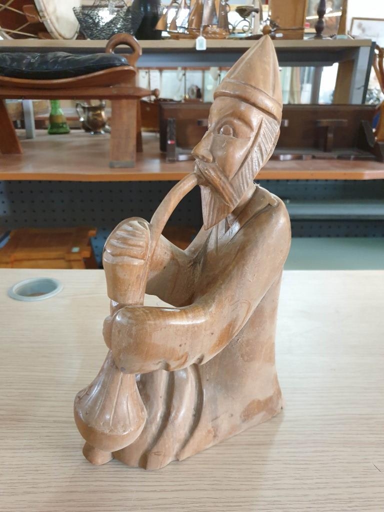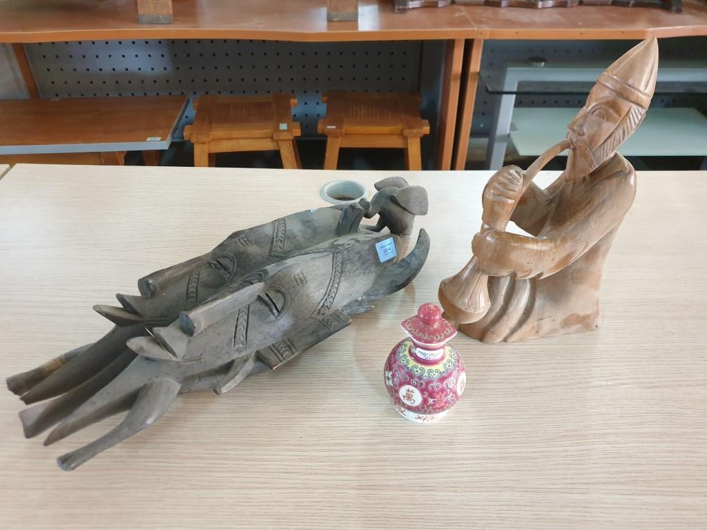 Carved Wood Figure of Man Smoking Pipe (29cm) Carved Wooden African Mask / Wall Hanging with 2 x Faces (49cm) and Oriental Porcelain Ornament (3)