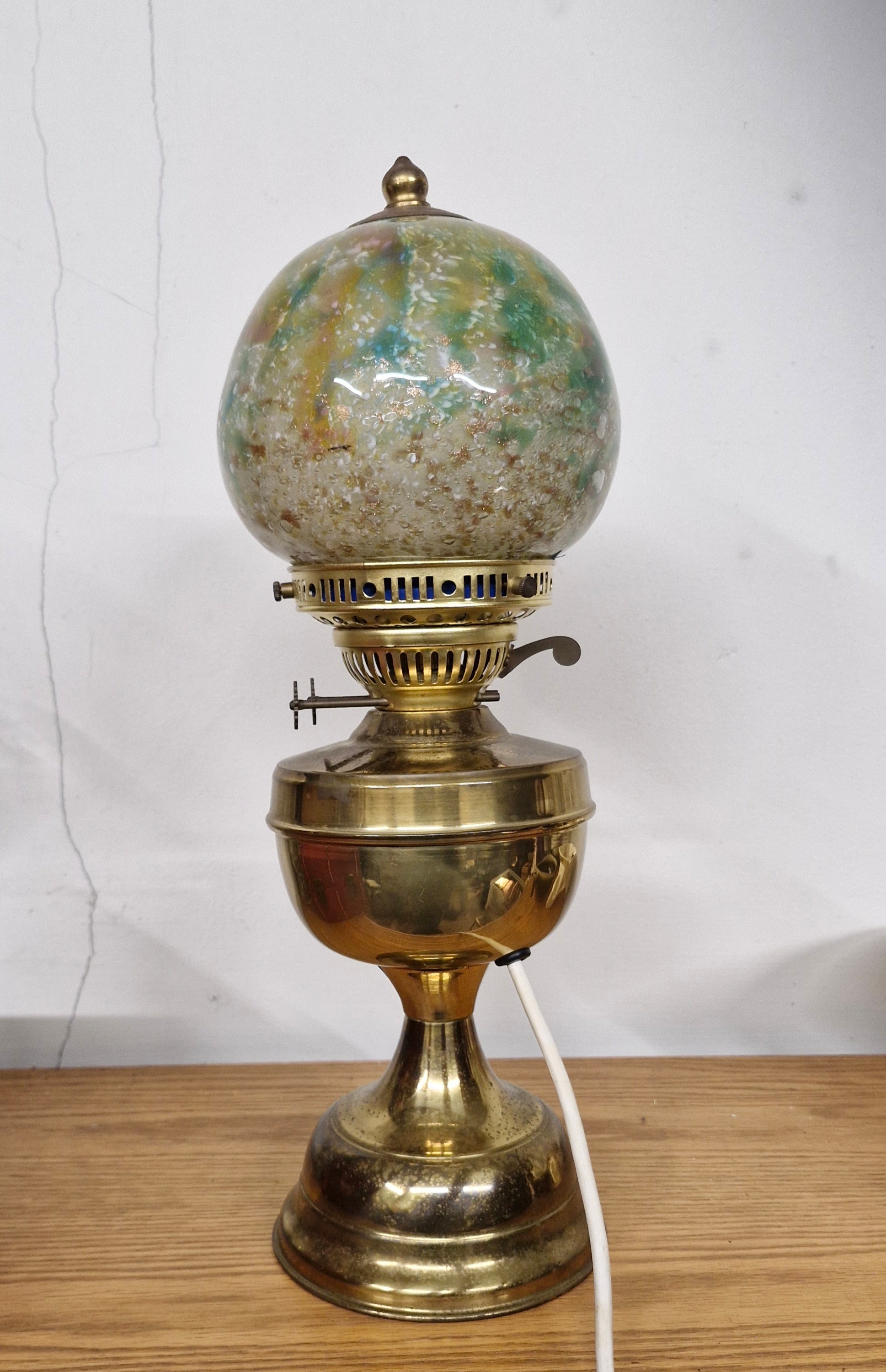 A brass lamp with a very interesting and highly decorative lamp shade.