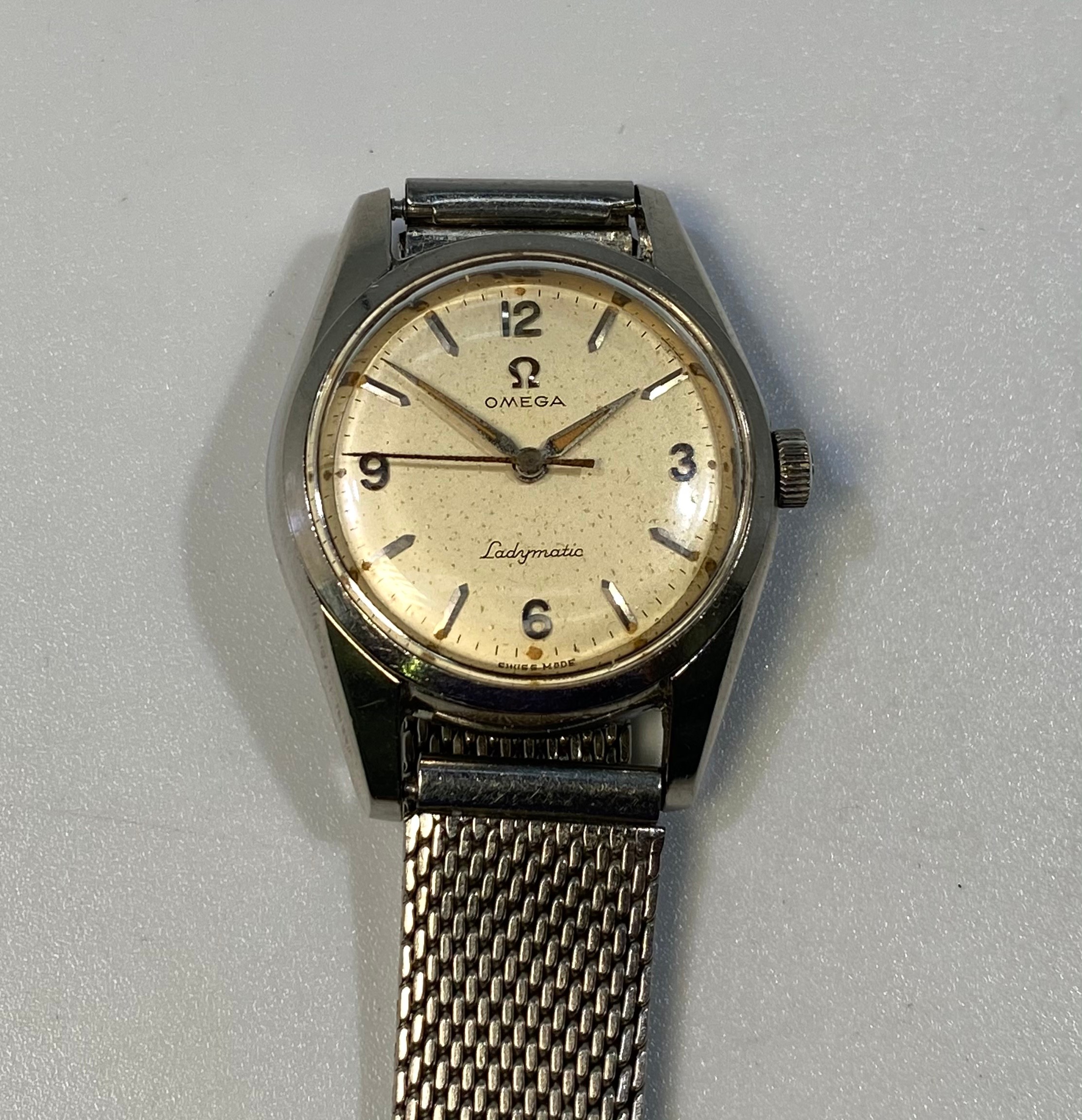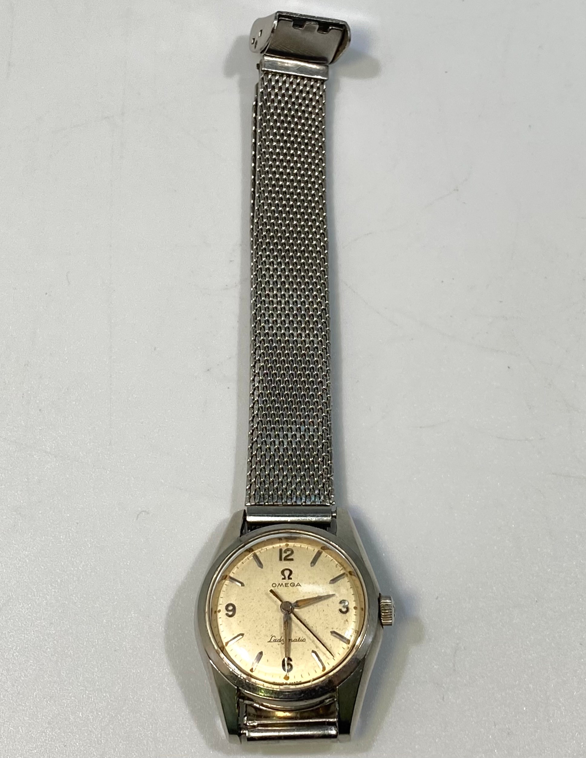 A ladies stainless steel Omega Ladymatic wristwatch, the silvered dial with batons denoting hours and Arabic numerals at 3, 6, 9 and 12 o’clock positions, with Hippocampus to case back, on later stainless steel bracelet