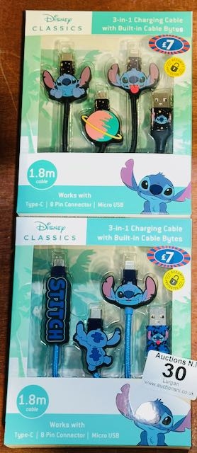 2 x Sealed Disney Classics 3 -In-1 Charging Cables - Stitch
