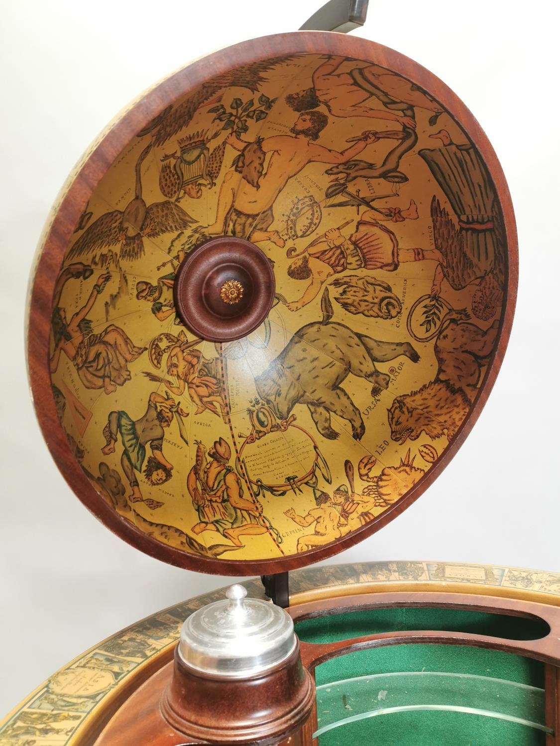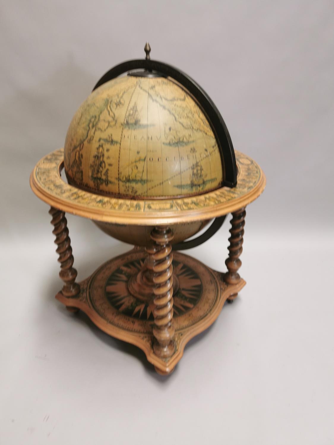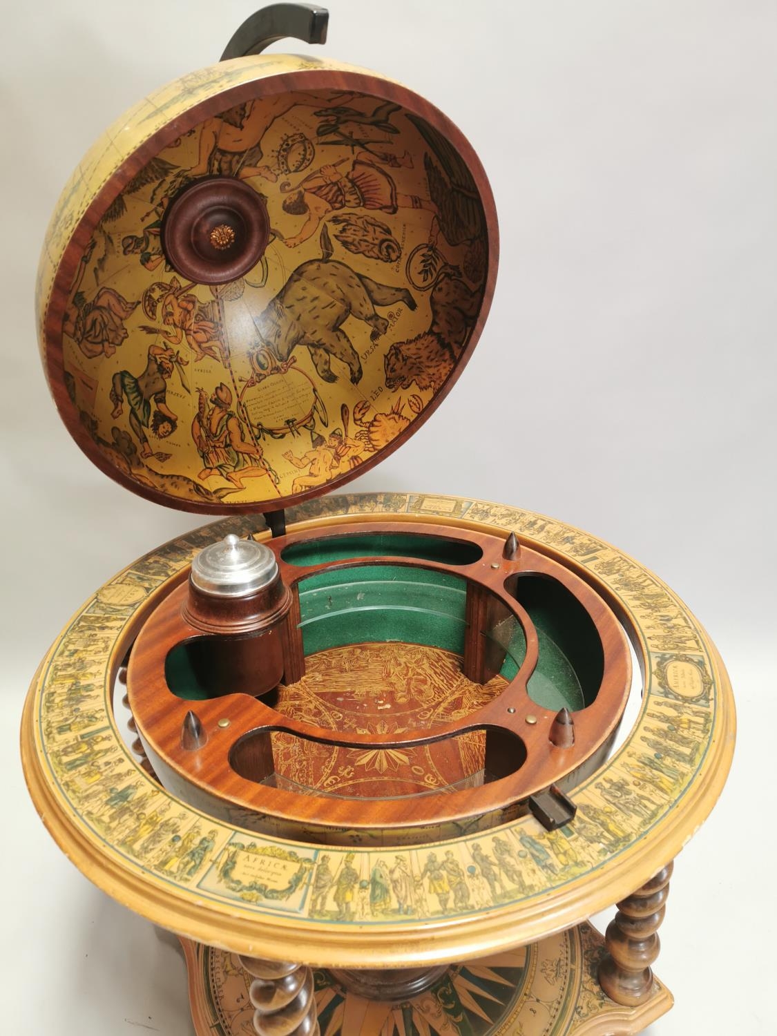 Drinks' cabinet in the form of a globe on stand with fitted interior . { 103cm H X 80cm Dia }.