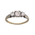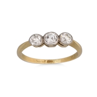 AN ANTIQUE THREE STONE DIAMOND RING, the brilliant cut diamonds mounted in 18ct yellow gold. Estimated: weight of diamonds: 0.67 ct, size O-P