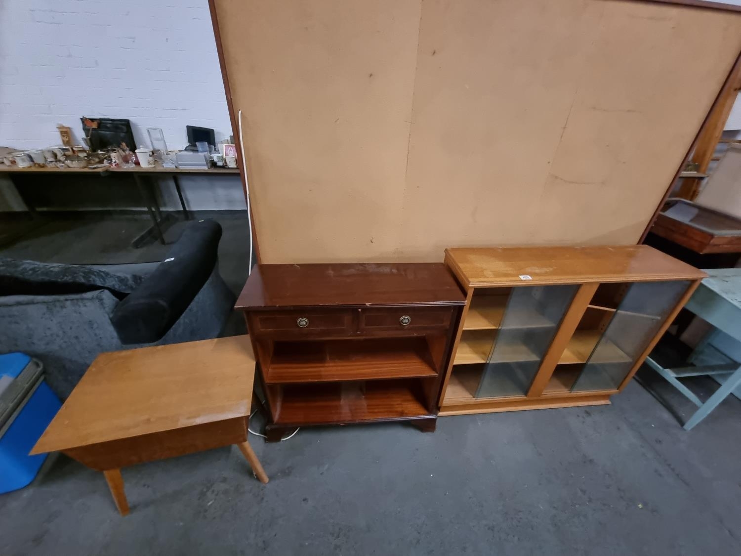 Teak glass fronted bookcase, mahogany bookcase and a teak sewing box
