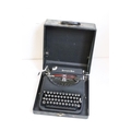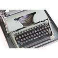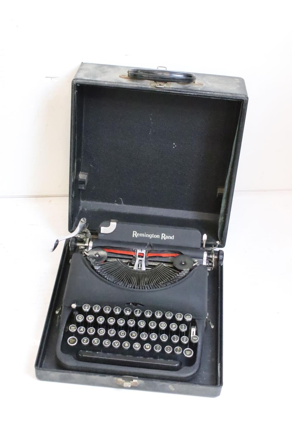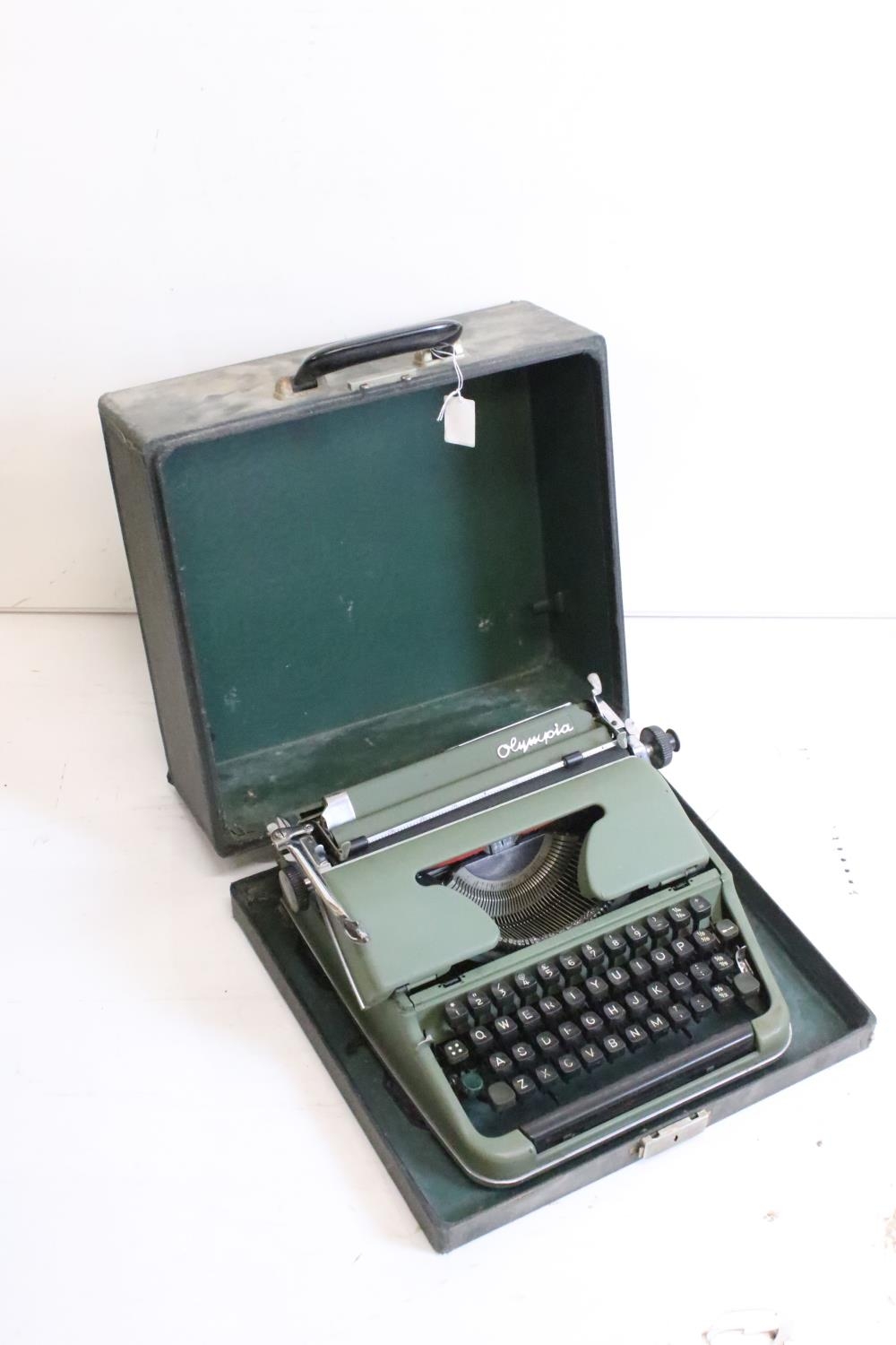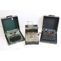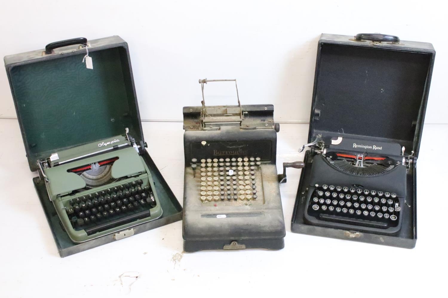 Three typewriters, comprising: a Burroughs, an Olympia, cased and a Remington Rand, cased