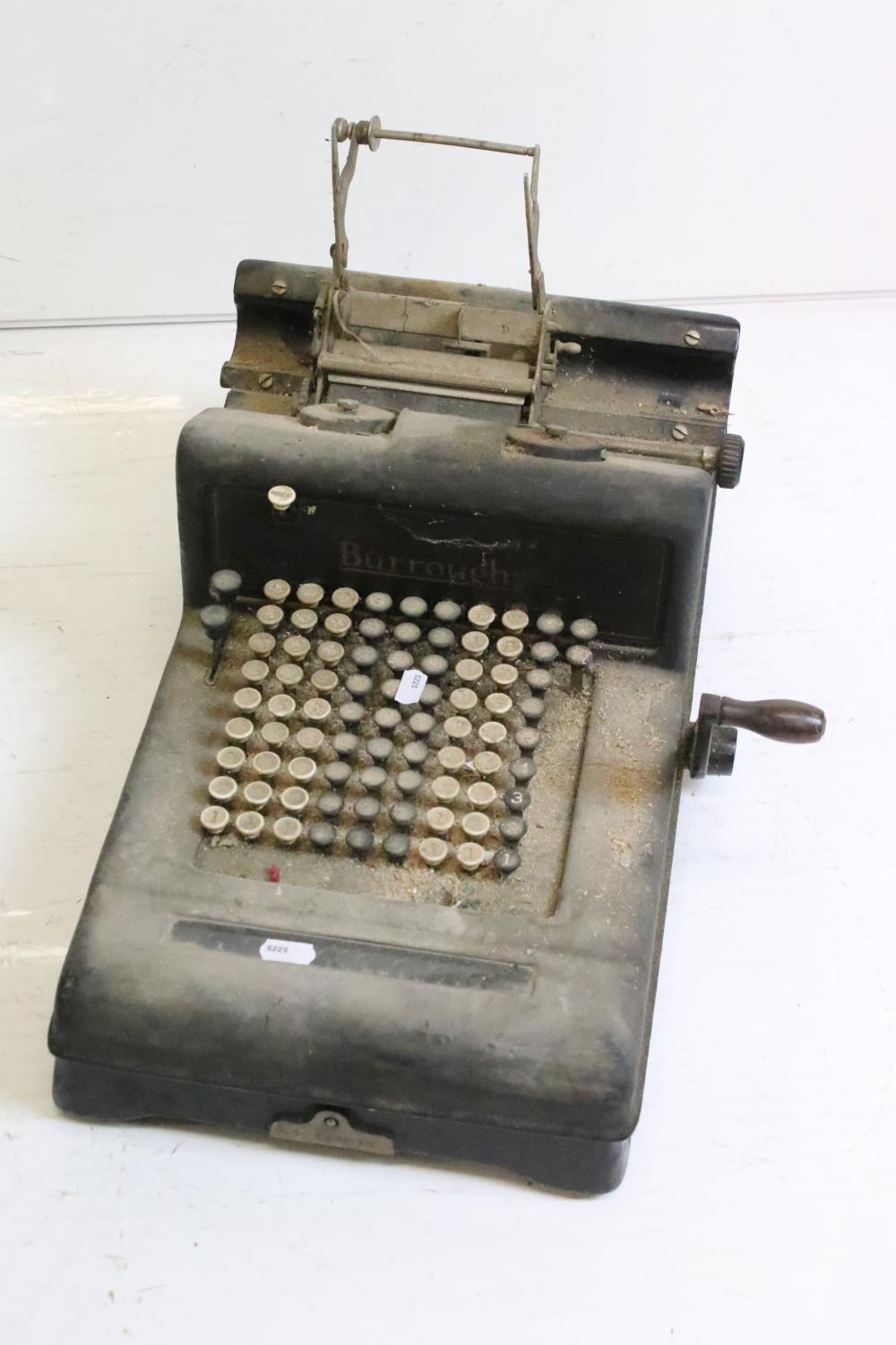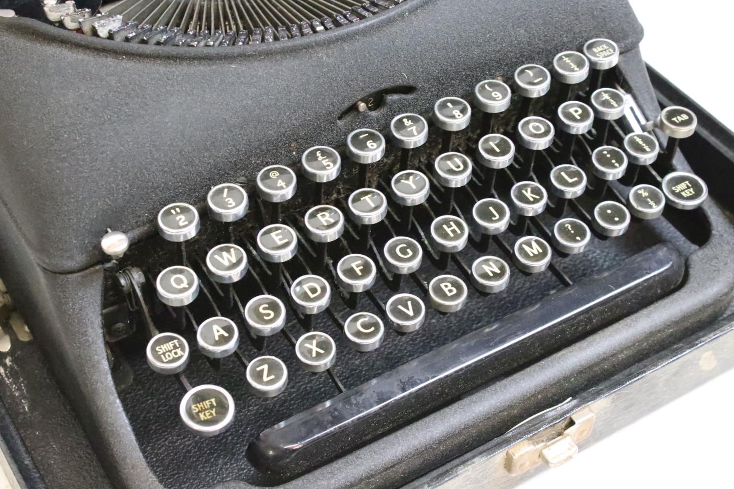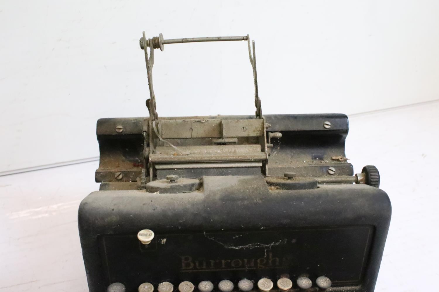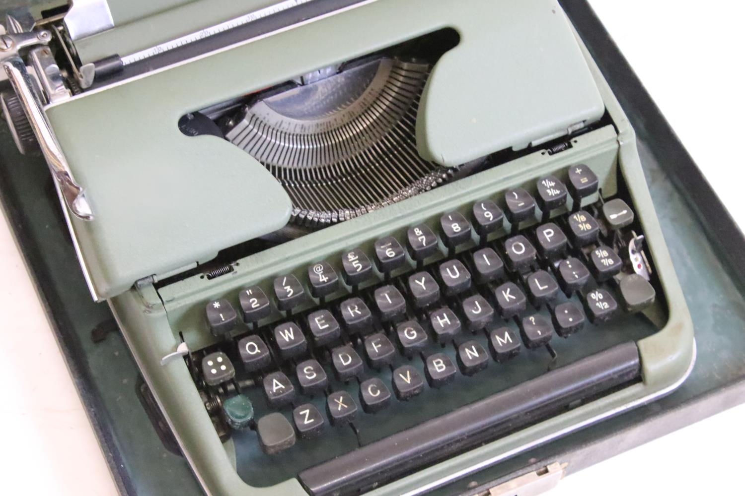Three typewriters, comprising: a Burroughs, an Olympia, cased and a Remington Rand, cased