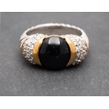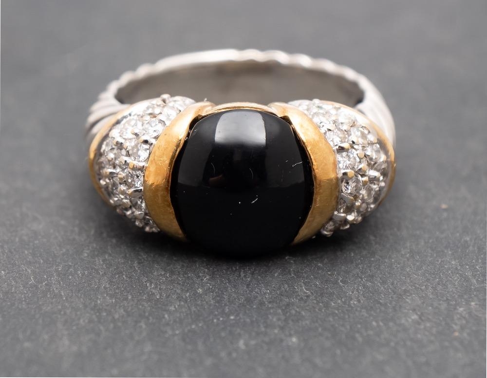 David Yurman, a cabochon-cut onyx ring, the shoulders set with round, brilliant-cut diamonds, total estimated diamond weight ca. 0.30ct, marked 'D.Yurman' and '925 750', length of ring head ca. 2cm, ring size N, total weight ca. 8.4gms.