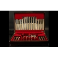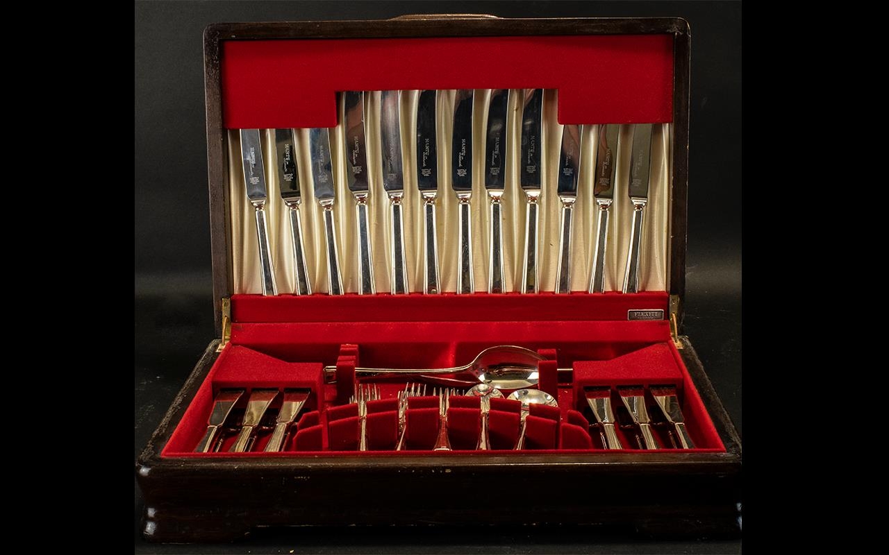Harts The Silversmiths Canteen of Flexfit Cutlery in an oak cased box with a red velour interior. Six settings.