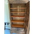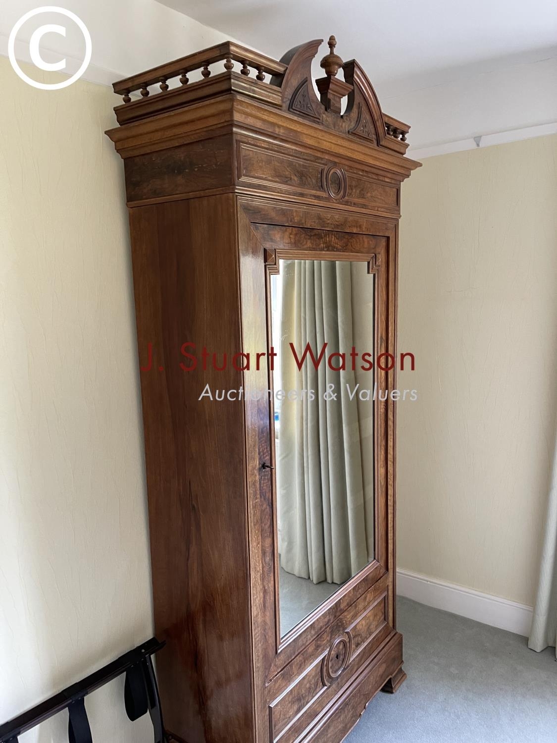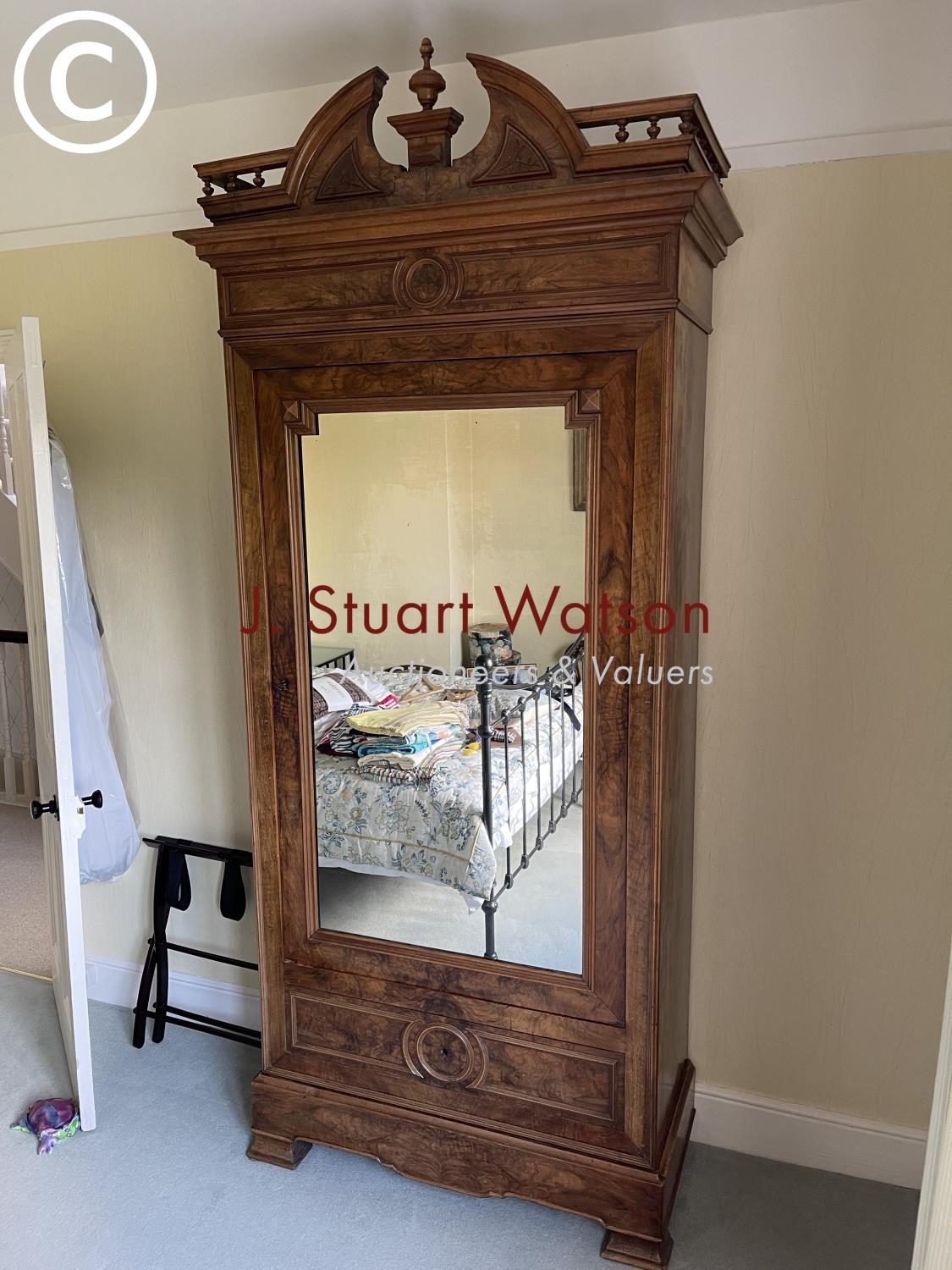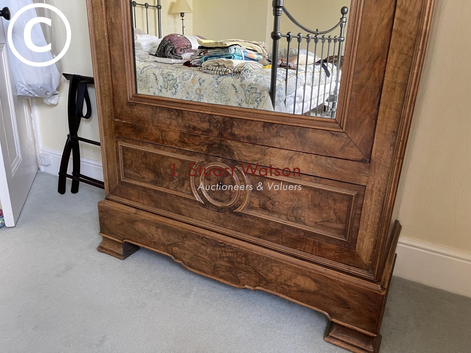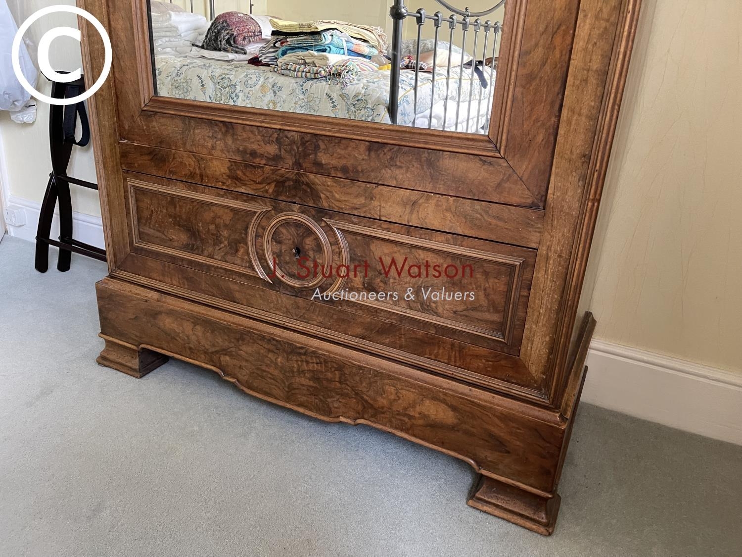 A large french walnut and oak armoire wardrobe with mirror door over two drawers, fitted to the inside with adjustable shelves 97x44x240