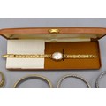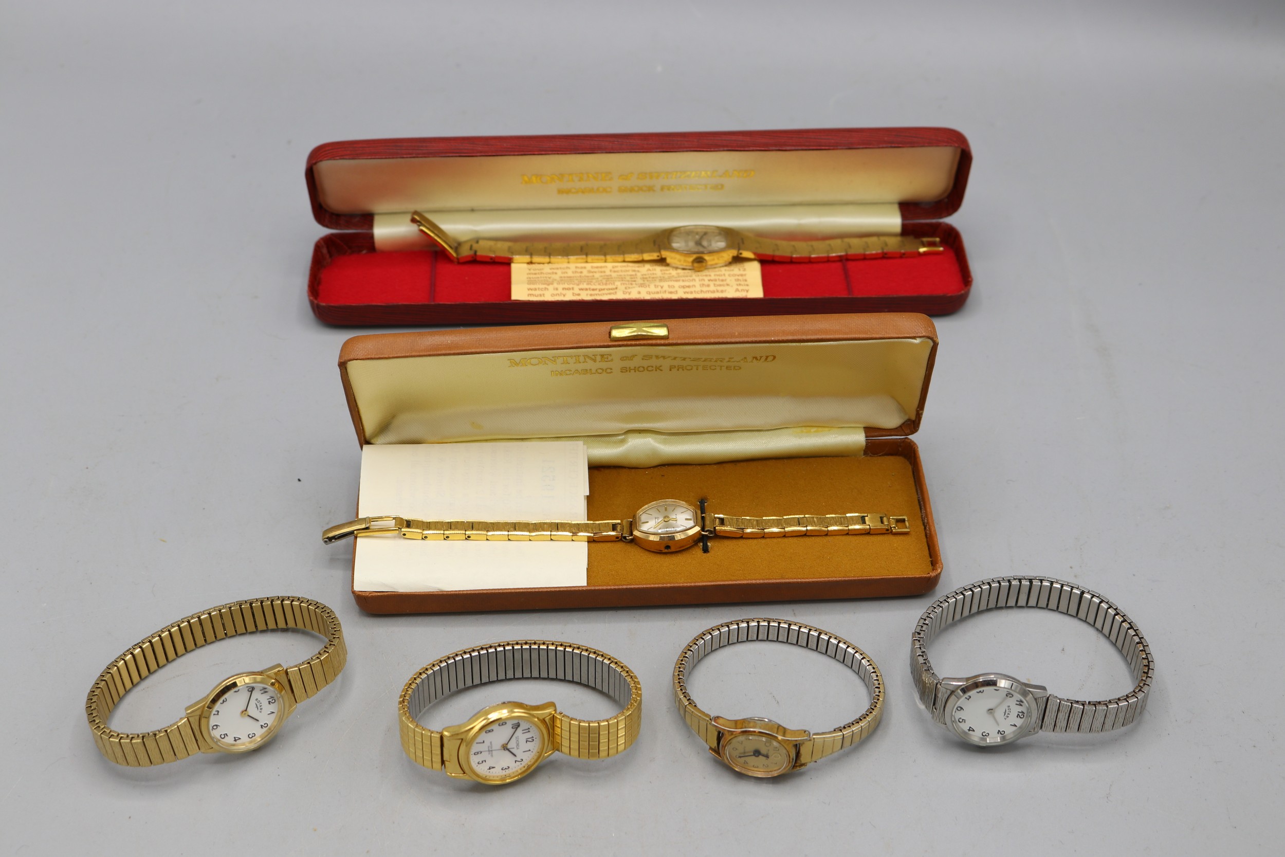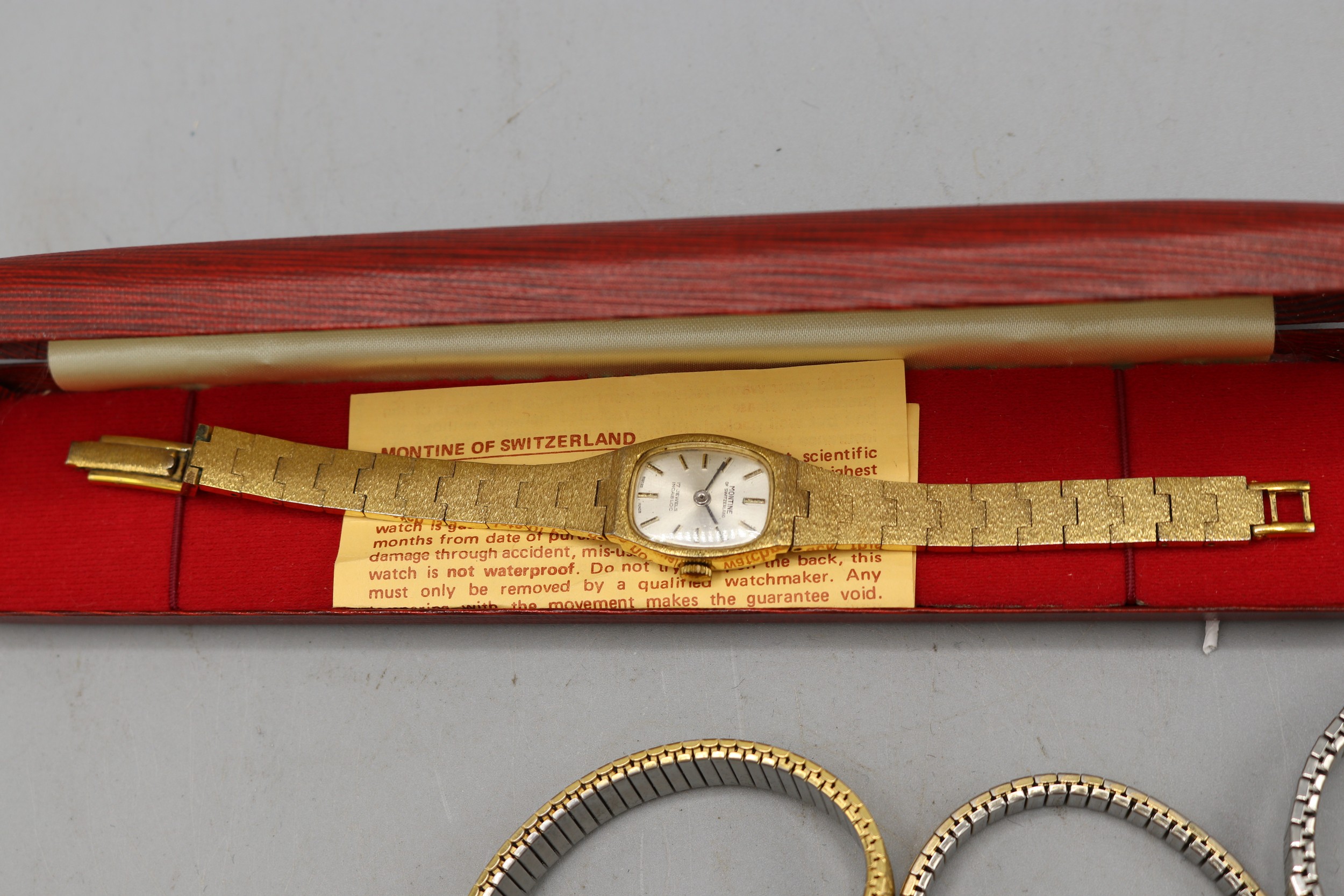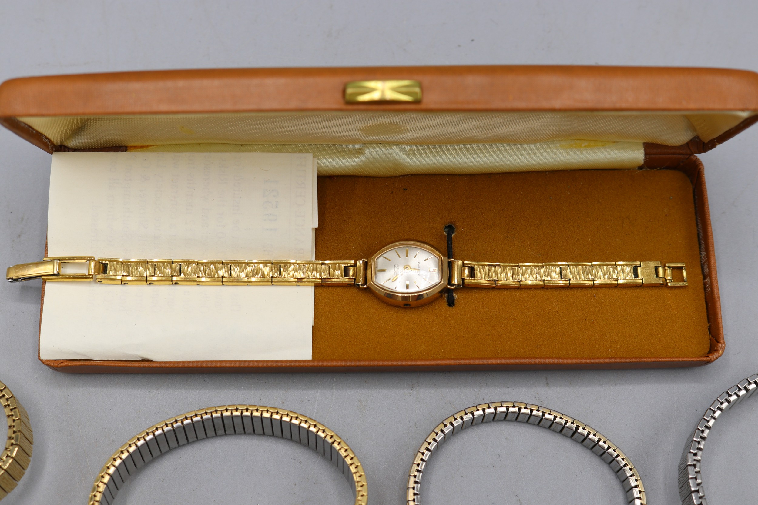 Everite ladies 9ct gold wristwatch on later gold plated bracelet, signed silver sunburst dial with baton indices, snap on case back no. 4726, SD London 1967, Swiss 17 jewel movement, gross weight 21.9mm, D26.7mm; Montine ladies gold plated quartz wristwatch on integrated bark bracelet, signed silver sunburst dial with baton indices, snap on back, Miyota no jewel unadjusted movement, D28.8mm; other ladies quartz wristwatches, Sekonda, Timex and Rotary