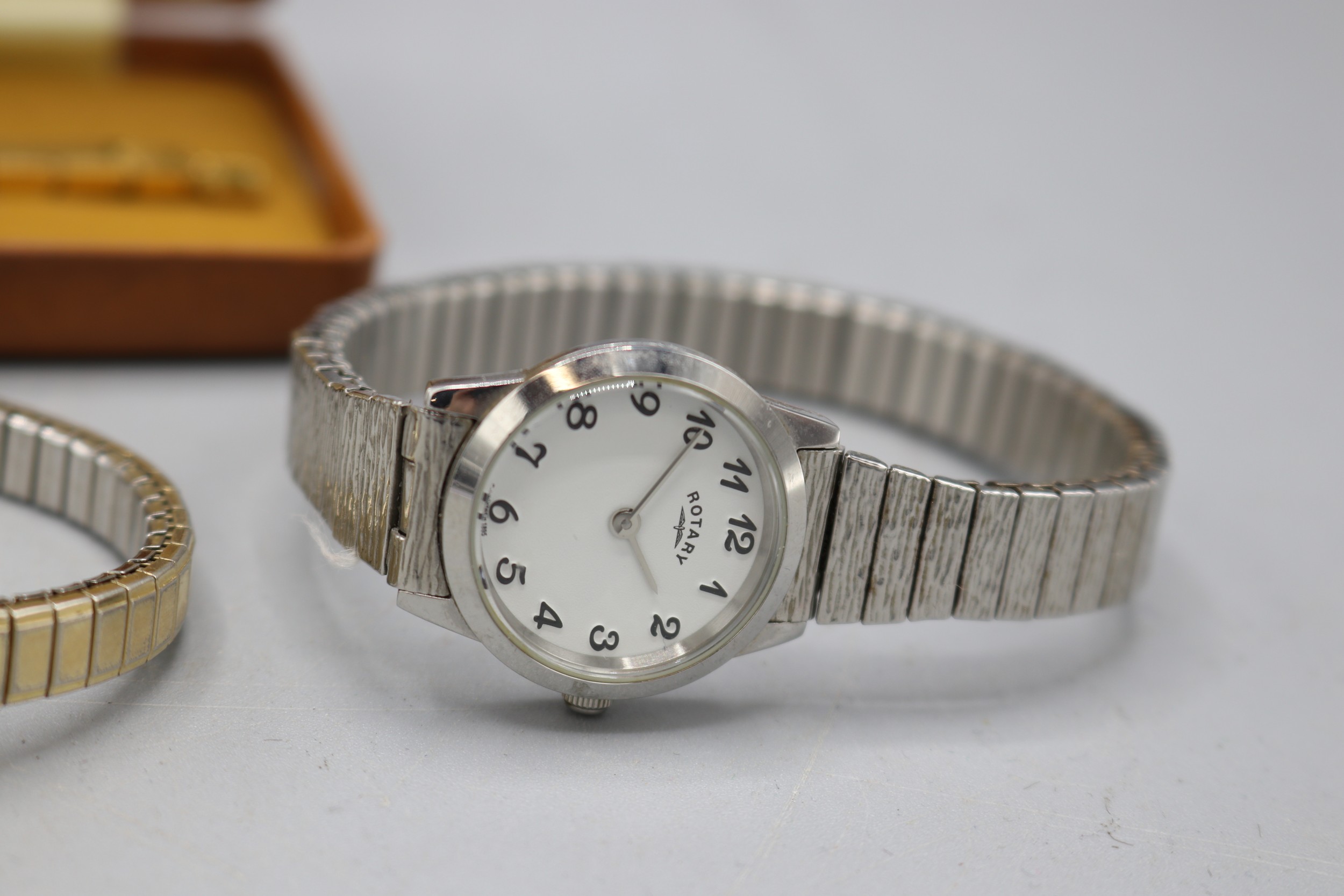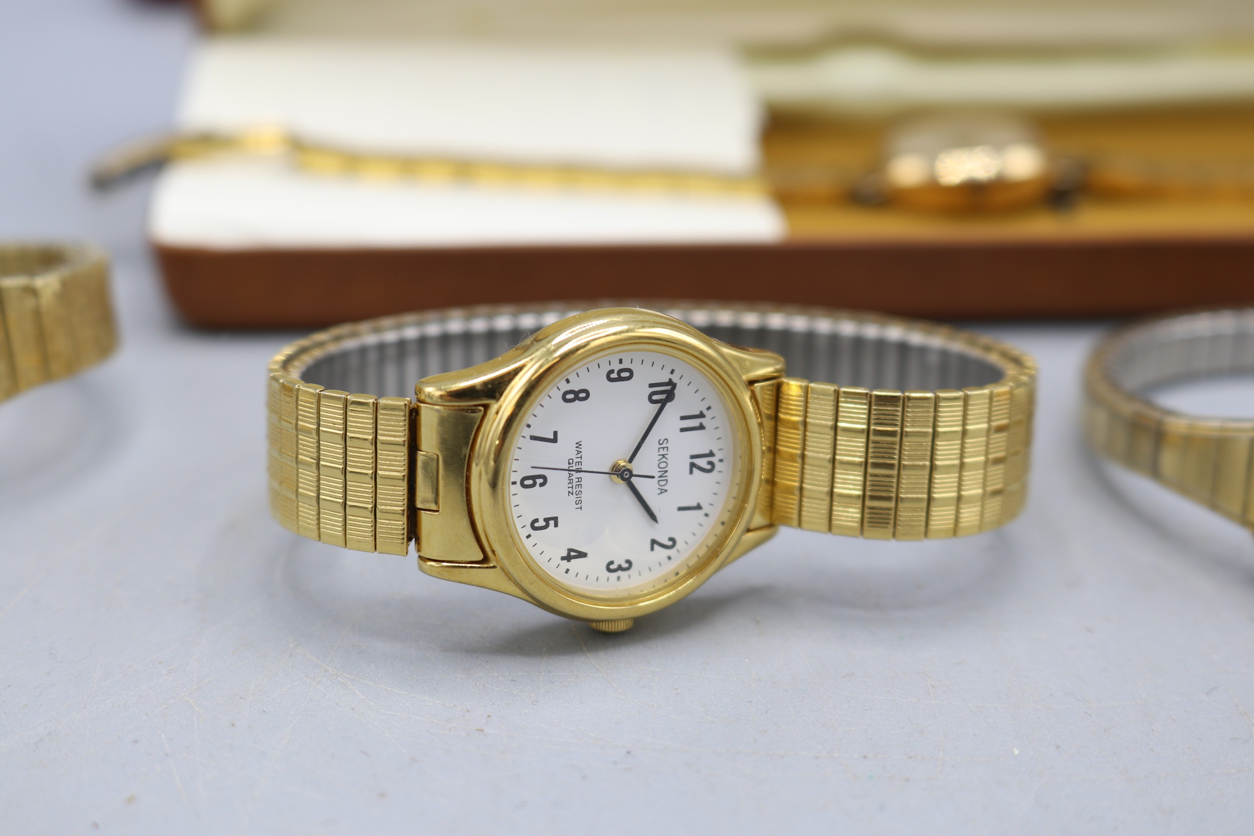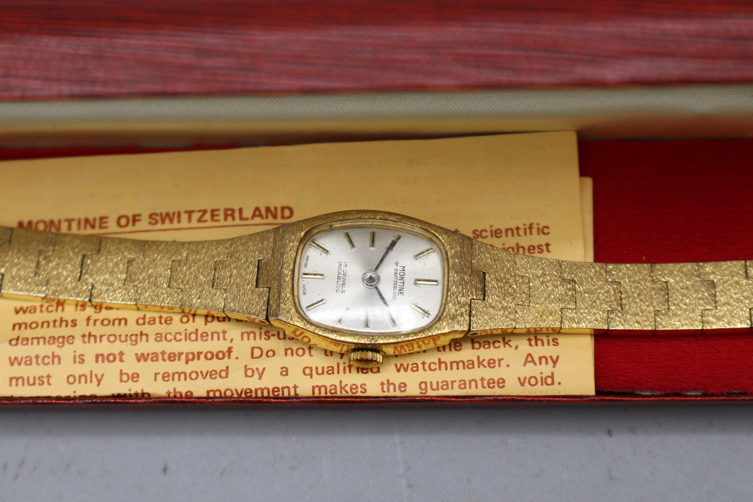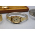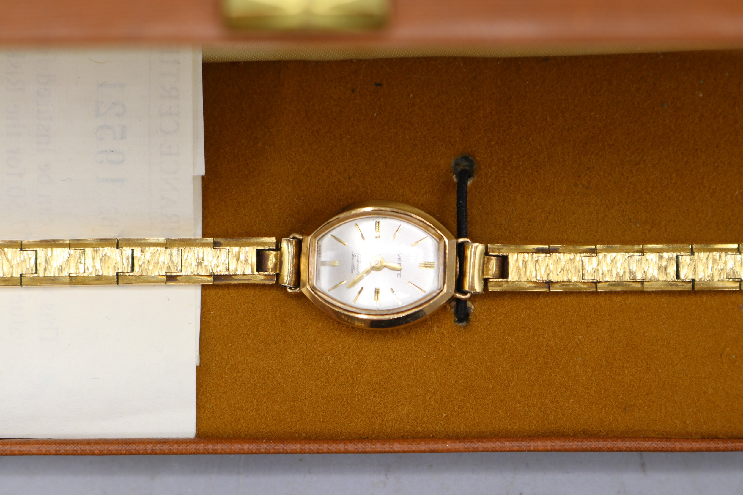 Everite ladies 9ct gold wristwatch on later gold plated bracelet, signed silver sunburst dial with baton indices, snap on case back no. 4726, SD London 1967, Swiss 17 jewel movement, gross weight 21.9mm, D26.7mm; Montine ladies gold plated quartz wristwatch on integrated bark bracelet, signed silver sunburst dial with baton indices, snap on back, Miyota no jewel unadjusted movement, D28.8mm; other ladies quartz wristwatches, Sekonda, Timex and Rotary