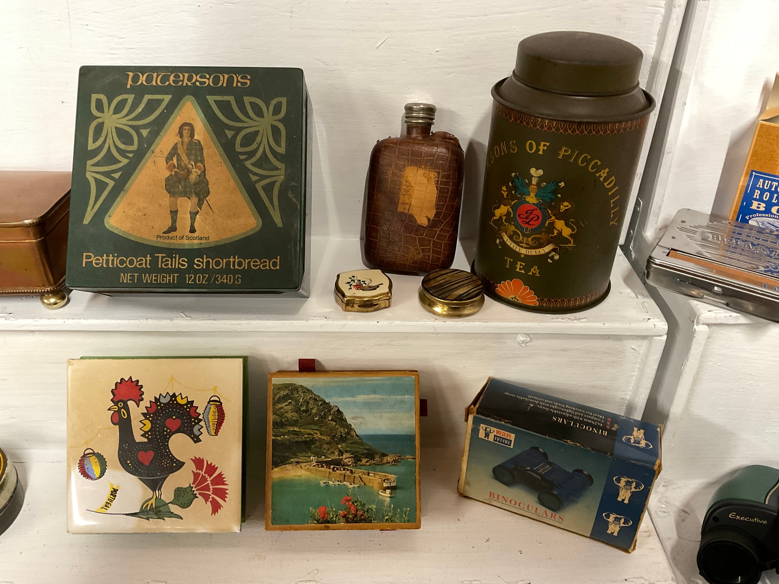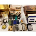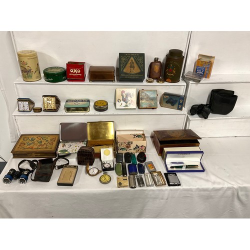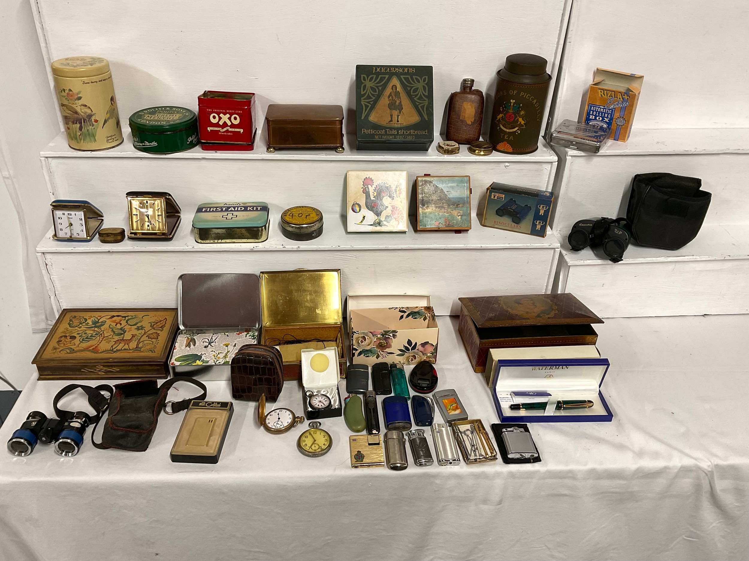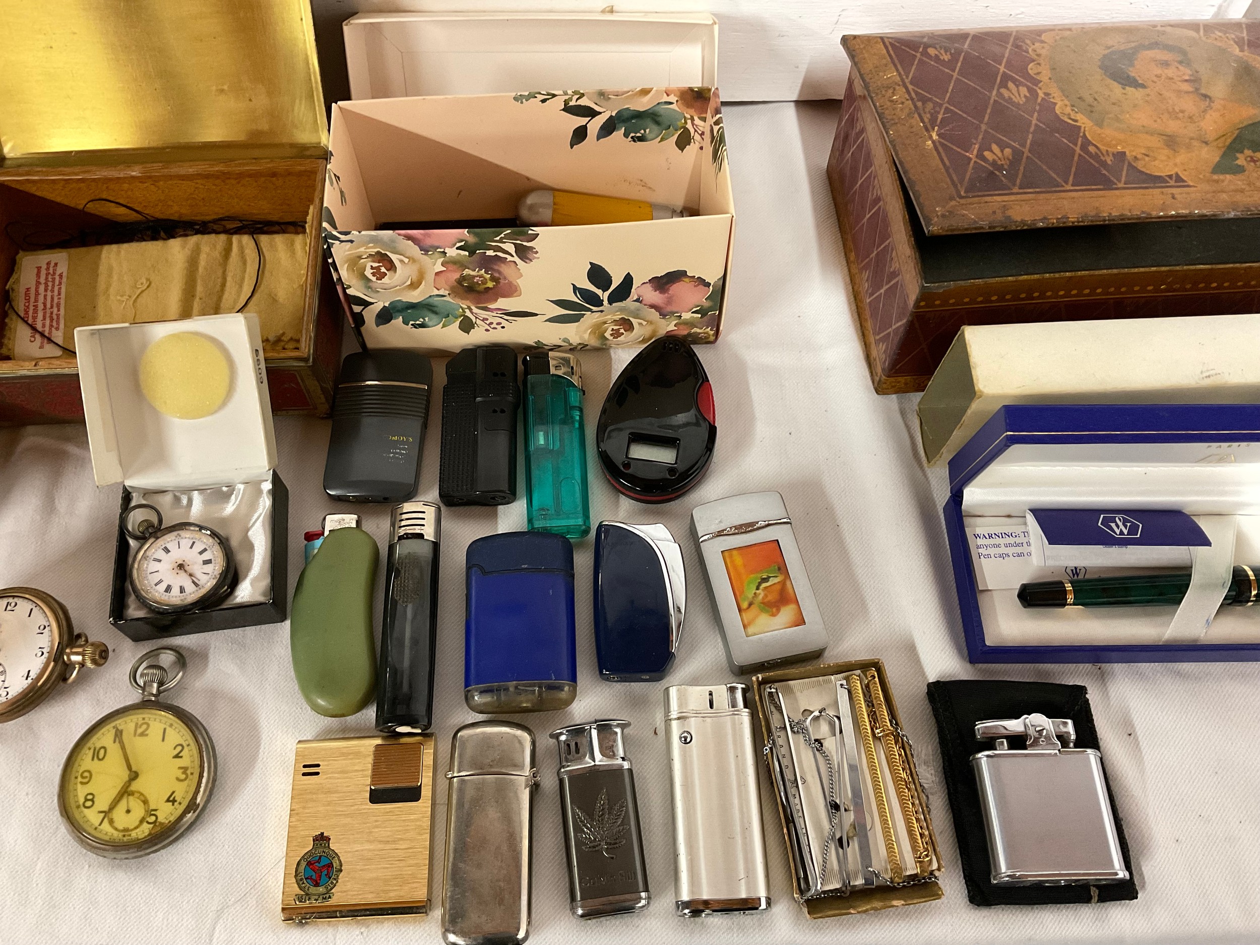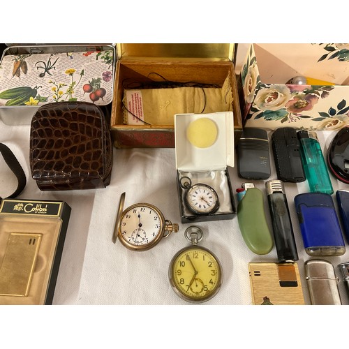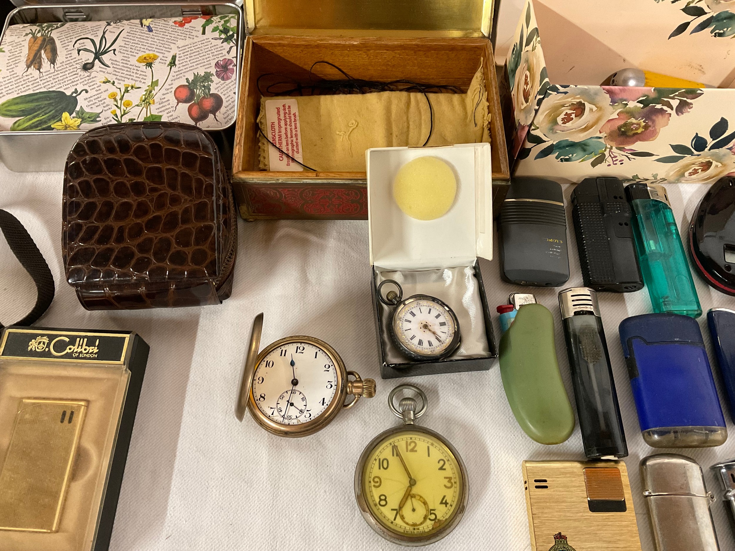 BOX OF VINTAGE CAMERAS TINS LIGHTERS HIP FLASK POCKET WATCHES TO INCLUDE A HALLMARKED SILVER FOB WATCH A/F ETC