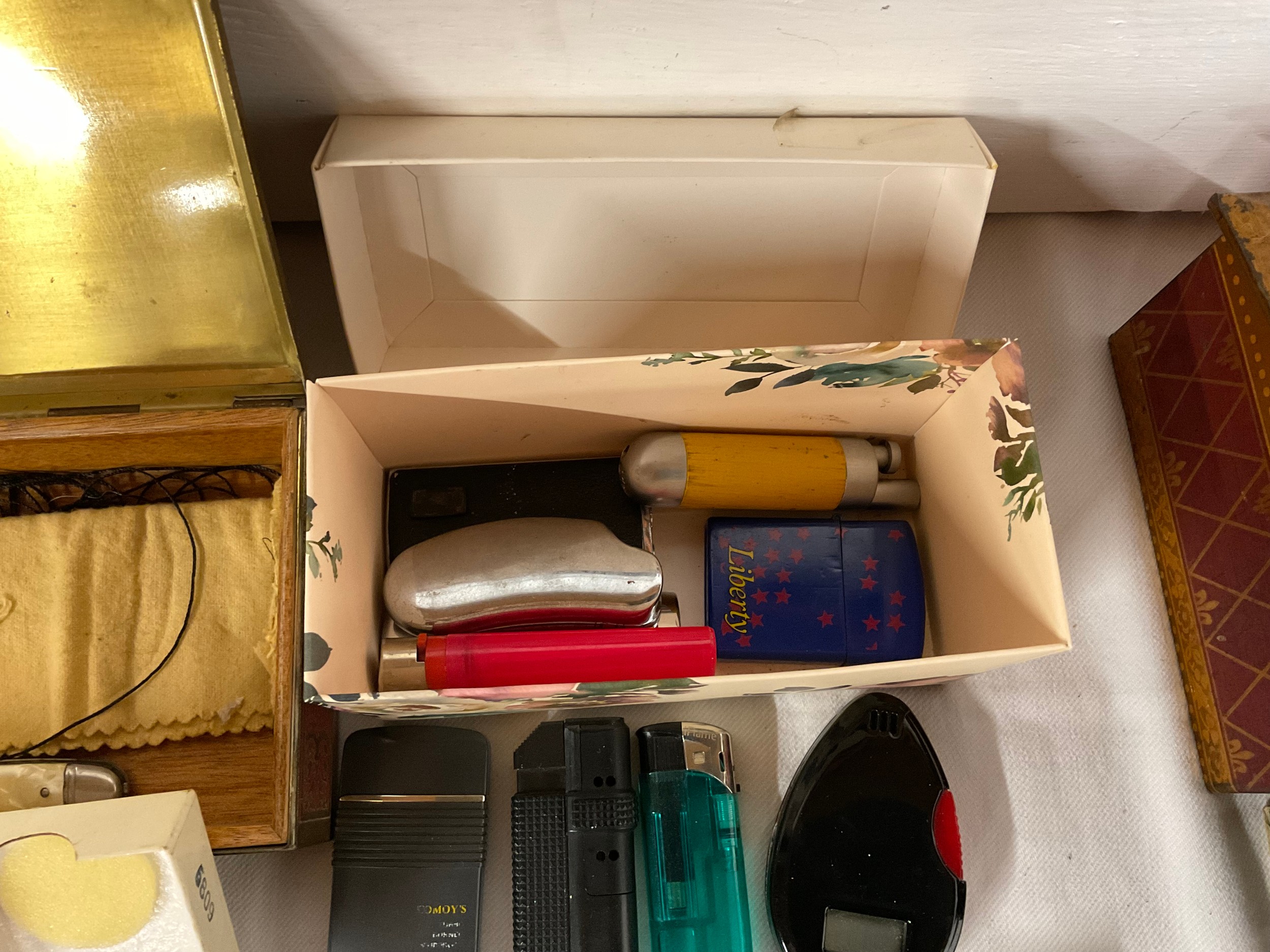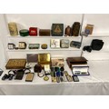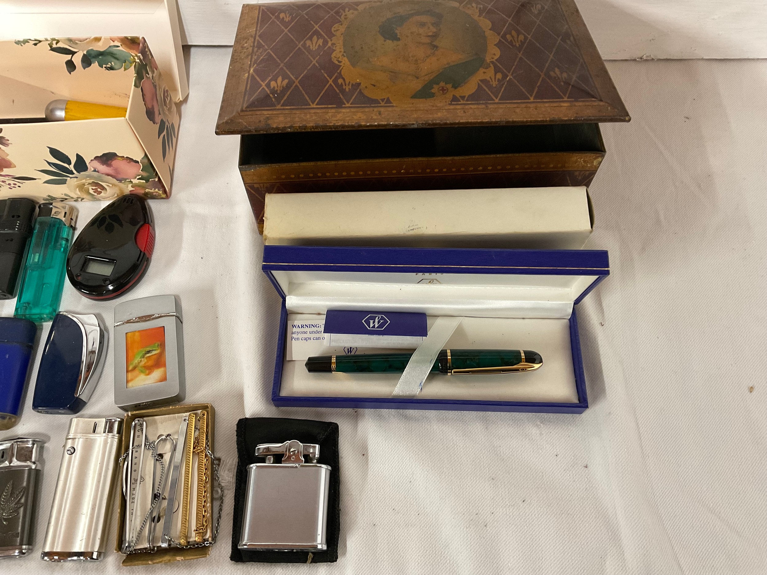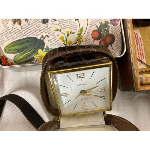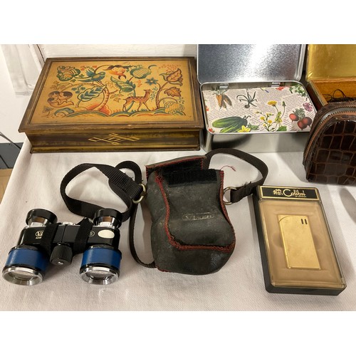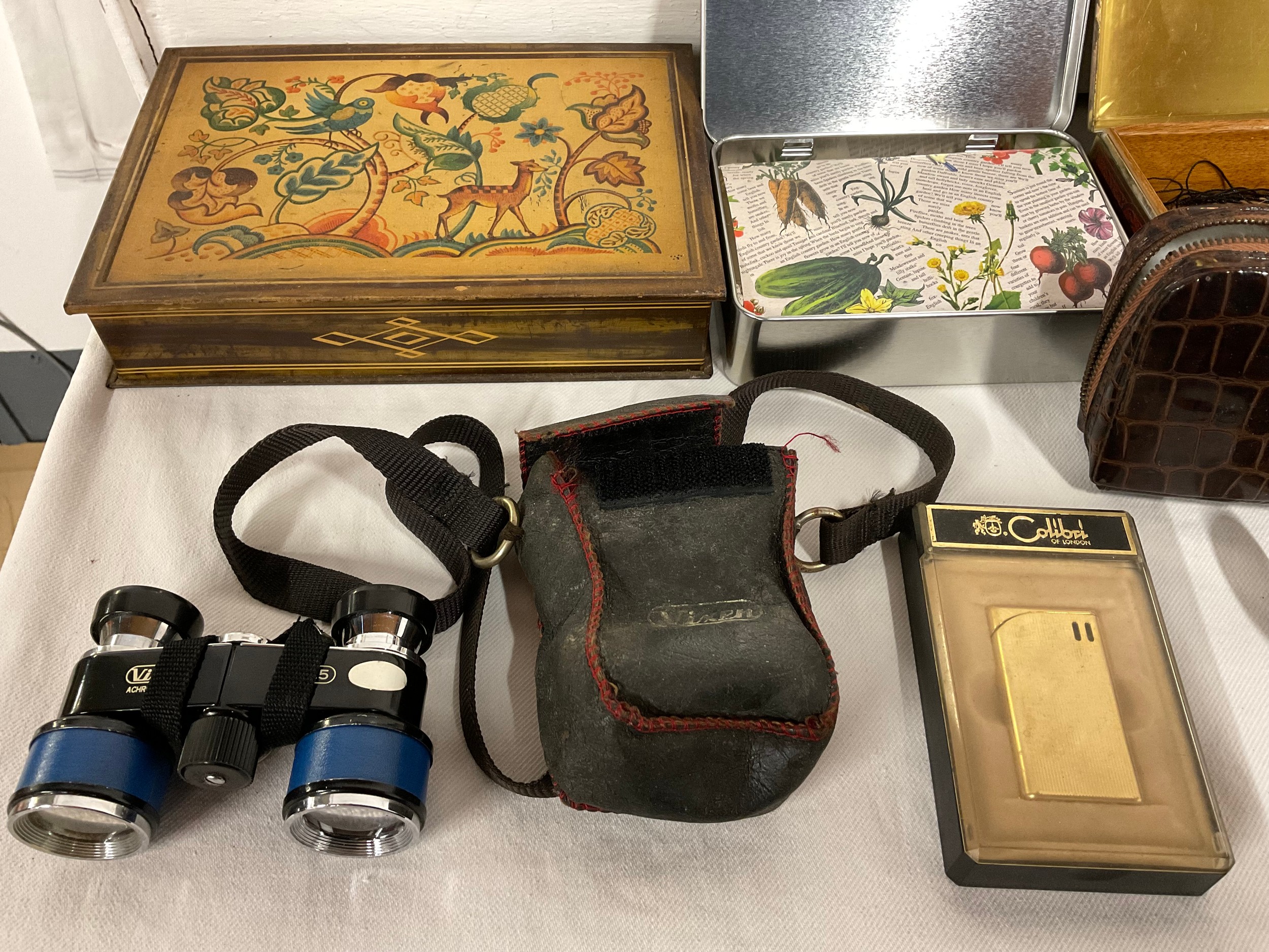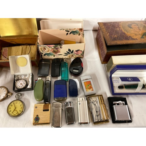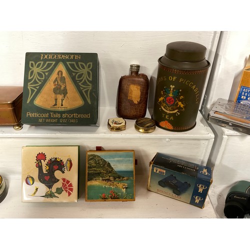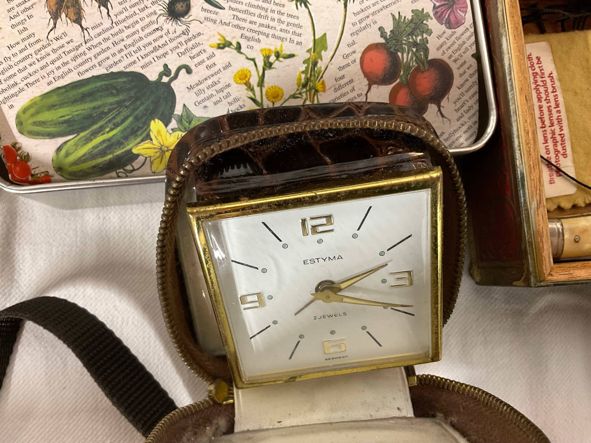 BOX OF VINTAGE CAMERAS TINS LIGHTERS HIP FLASK POCKET WATCHES TO INCLUDE A HALLMARKED SILVER FOB WATCH A/F ETC
