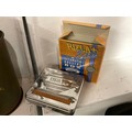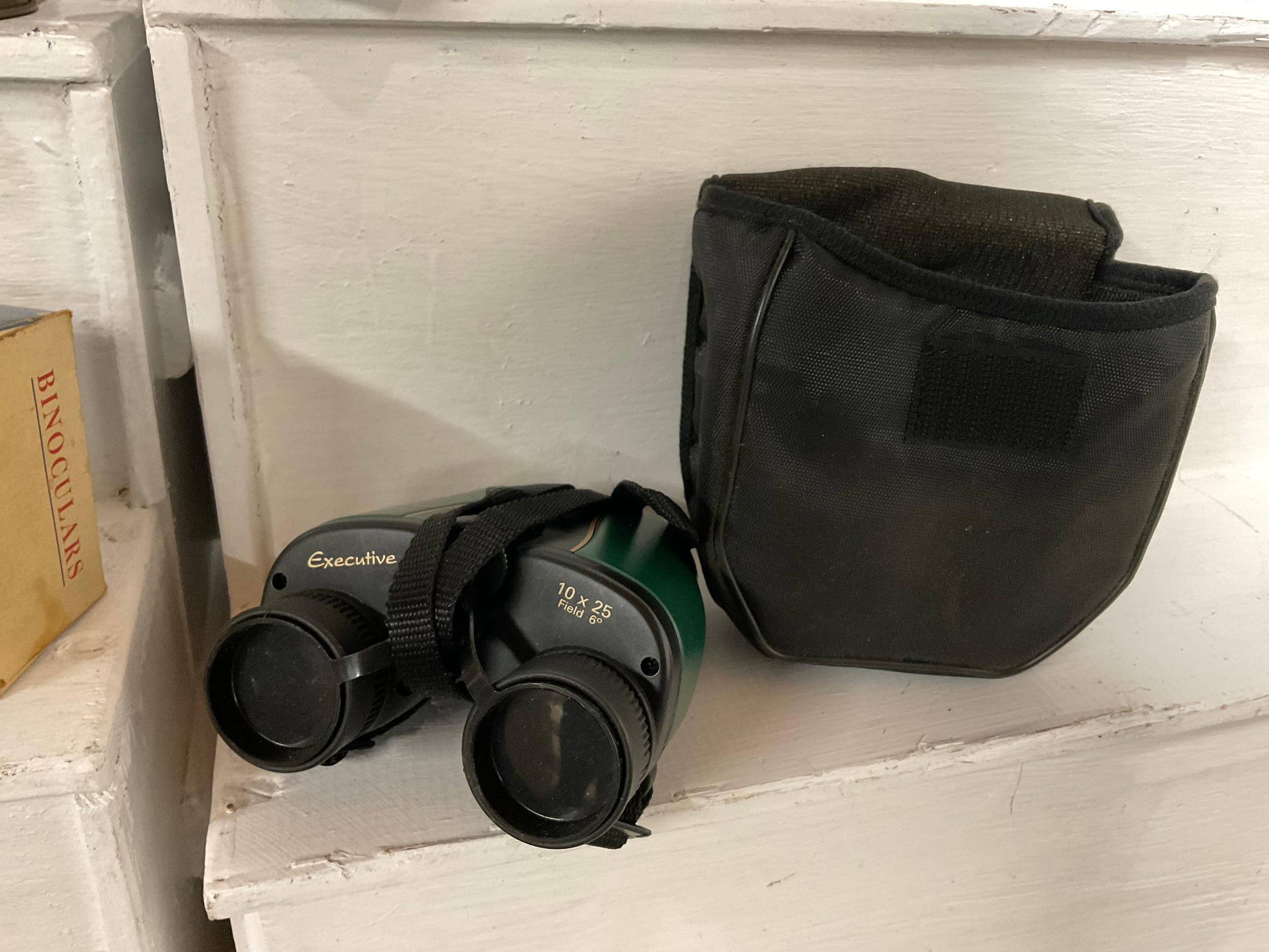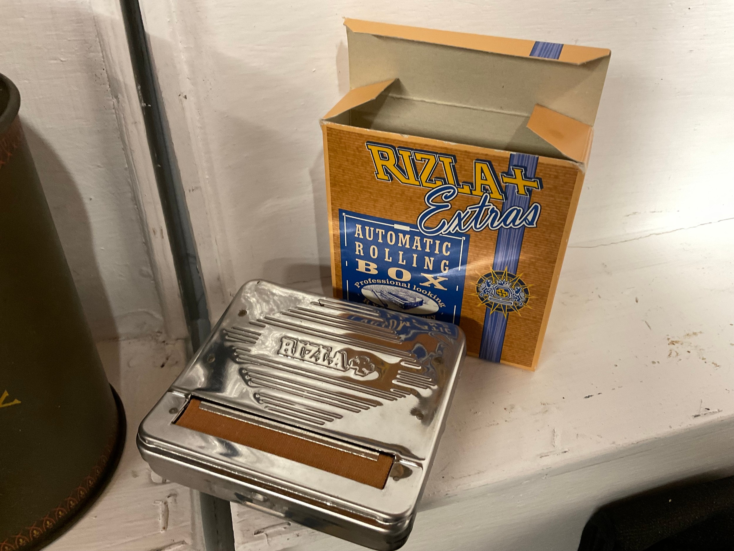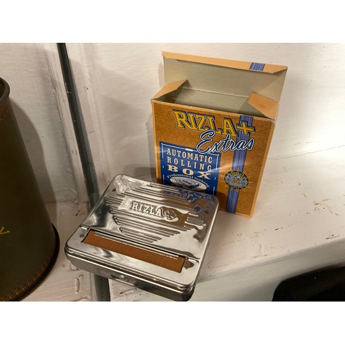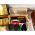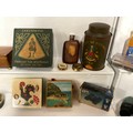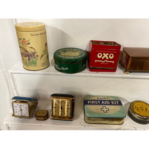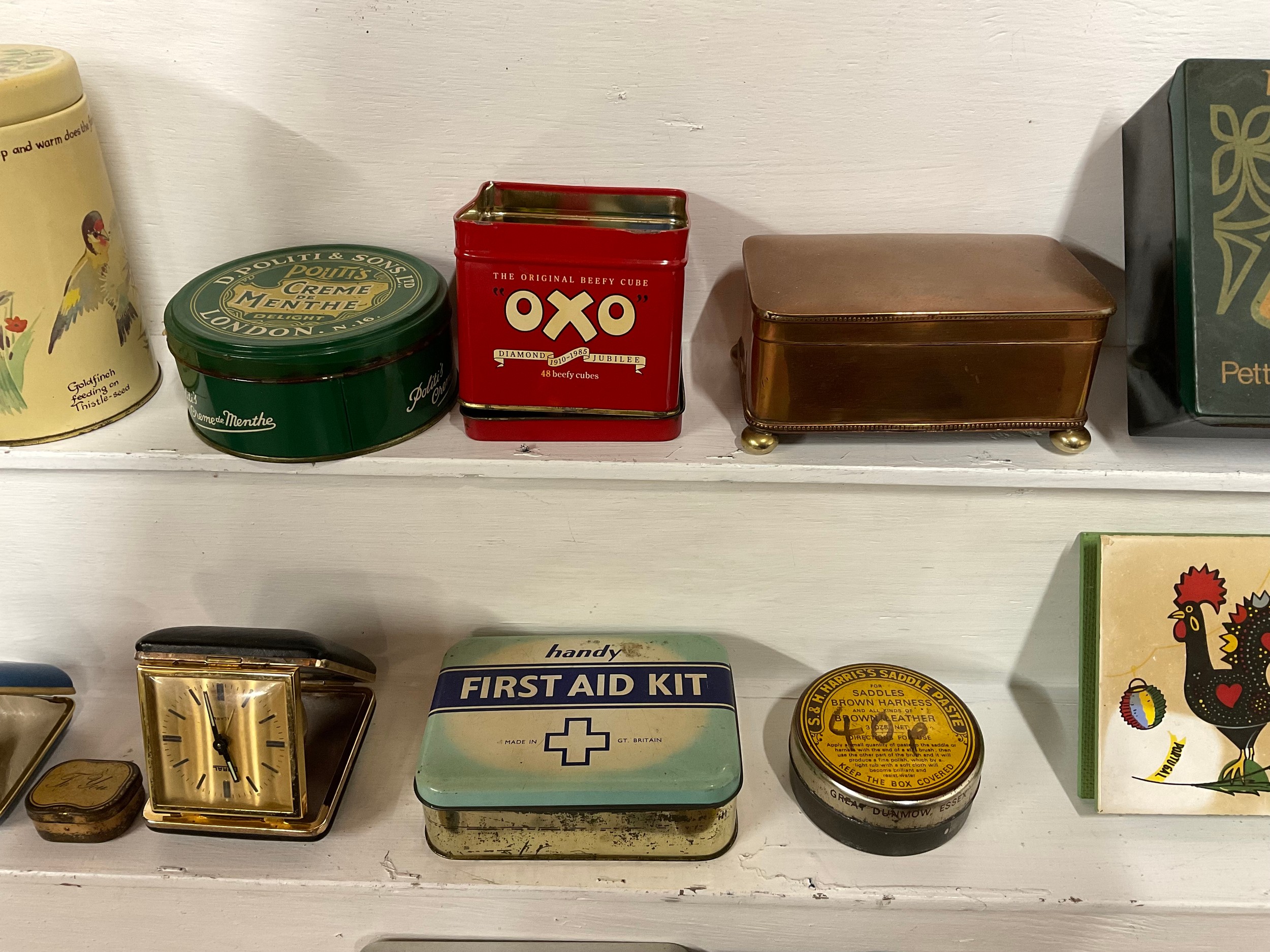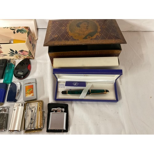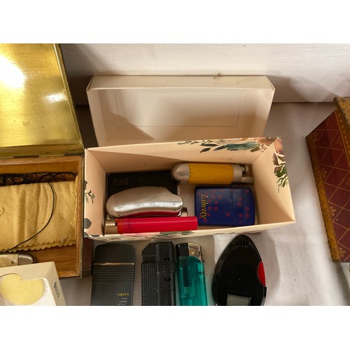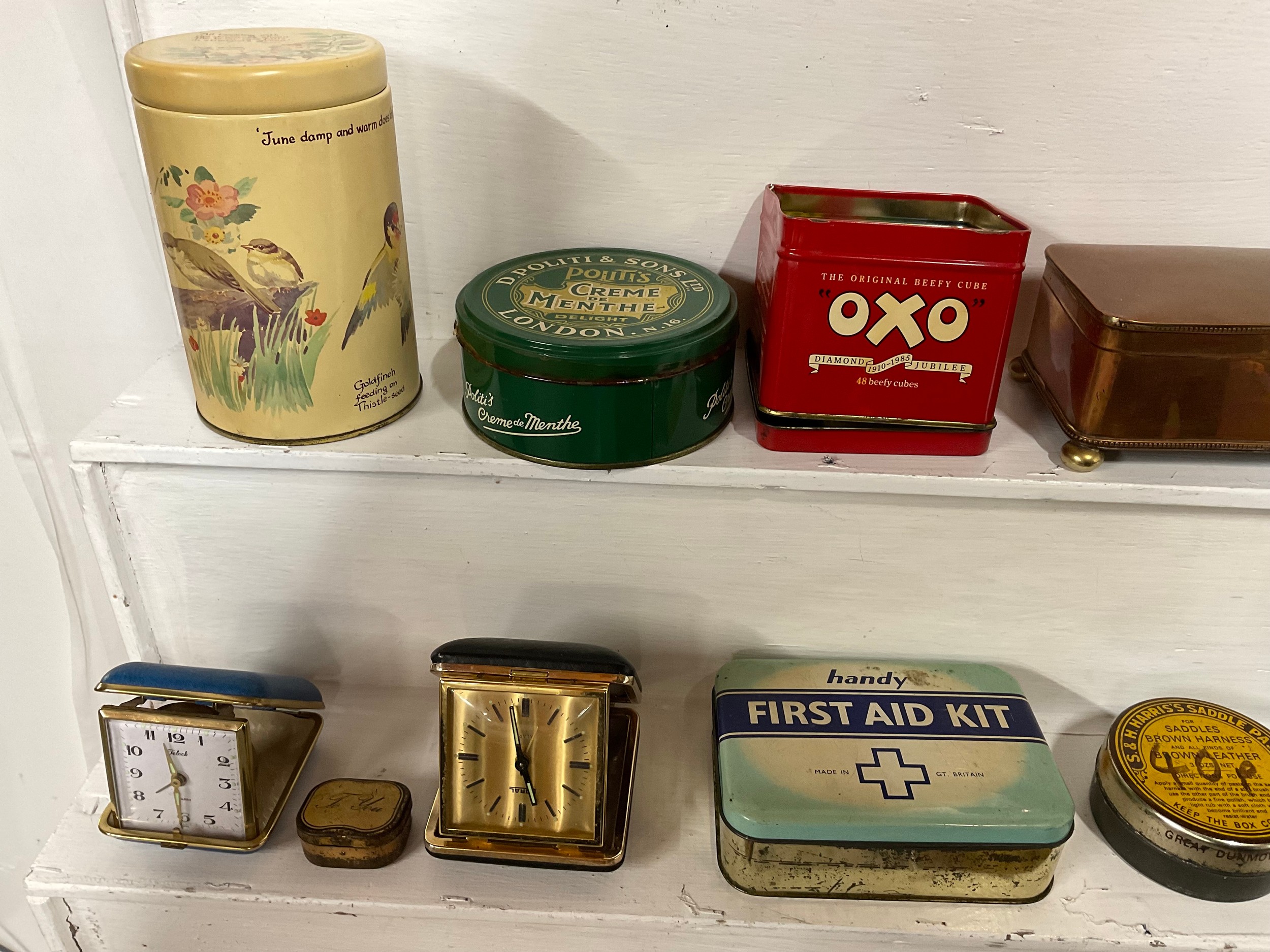 BOX OF VINTAGE CAMERAS TINS LIGHTERS HIP FLASK POCKET WATCHES TO INCLUDE A HALLMARKED SILVER FOB WATCH A/F ETC