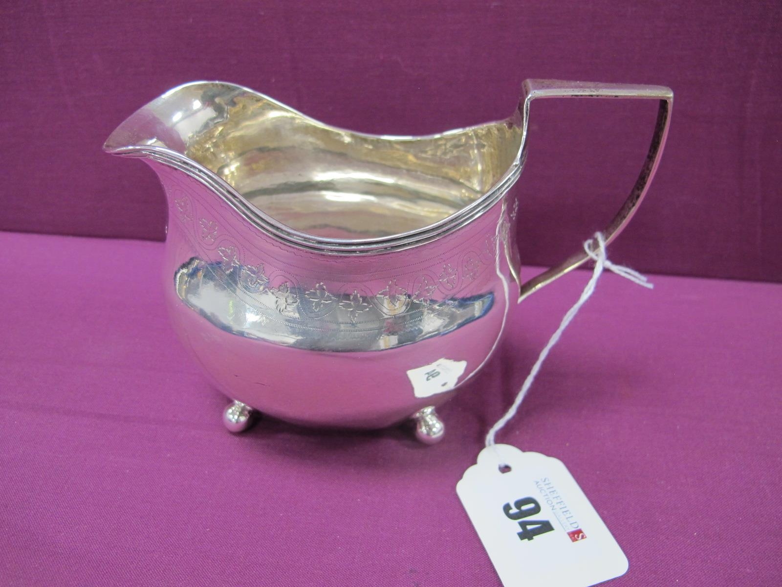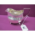 A Hallmarked Silver Jug, JL, possibly London 1812, with band of foliate detail and reeded edge, raised on four ball feet (noticeable solder / repair inside) (120grams).