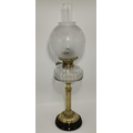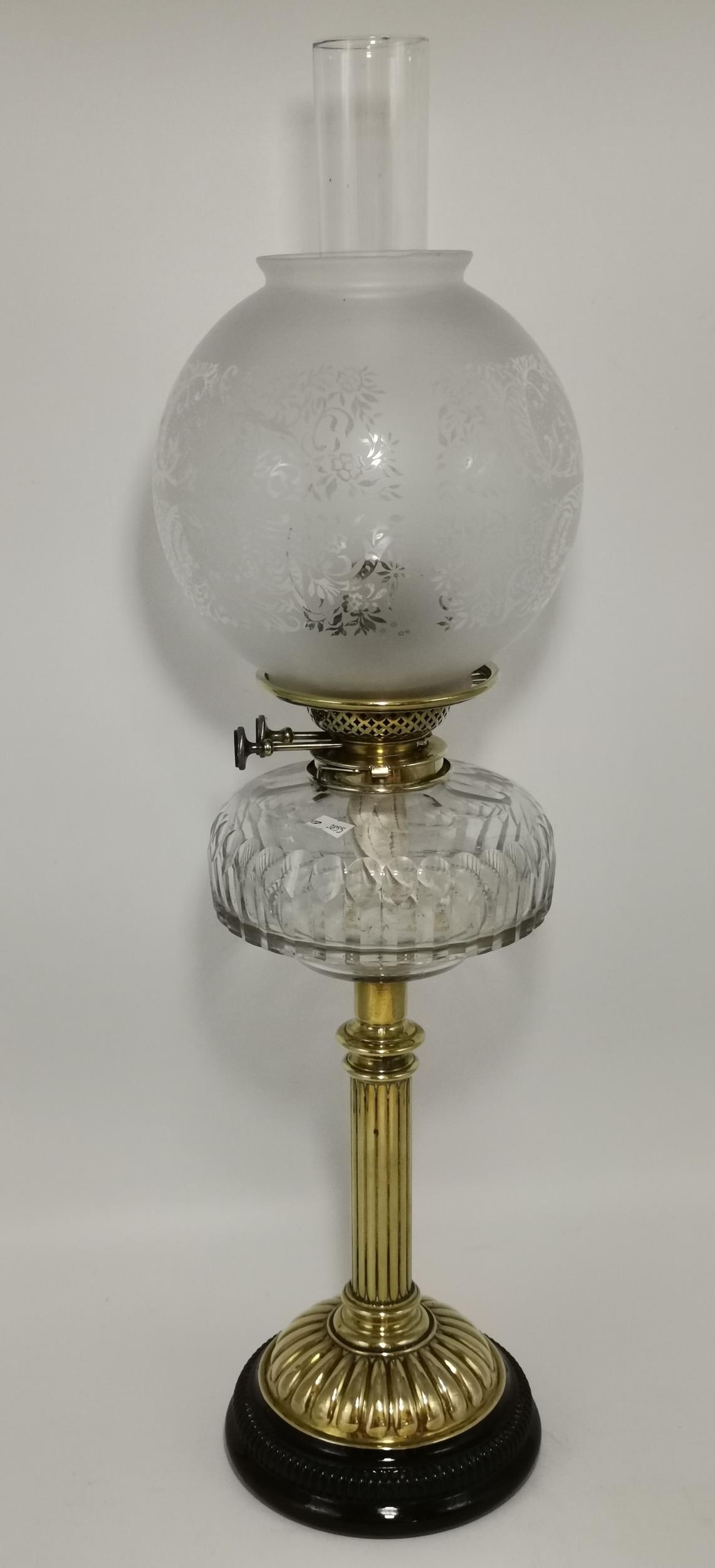 Victorian Oil Lamp with Brass Corinthian pillar column stem, lobed glass reservoir and etched frosted glass globe. the gallery was made by Young's and is marked on the duplex double wick winder H71cm