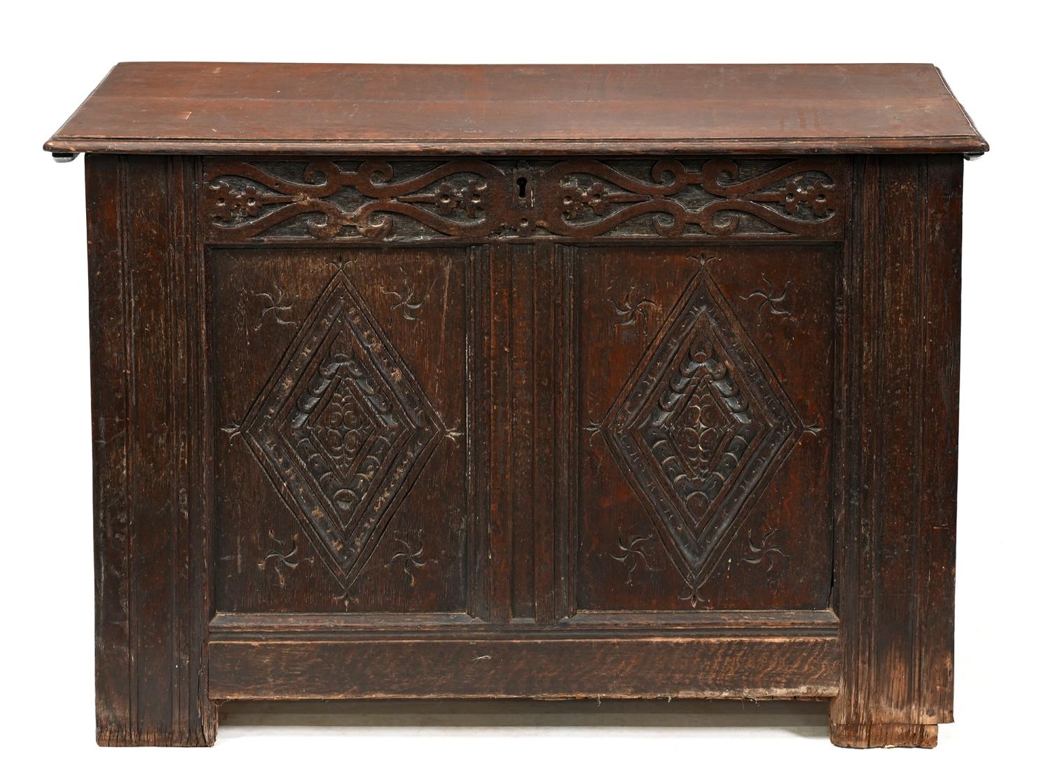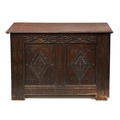 A Charles I oak chest, with twin lozenge carved panel front, on moulded stiles, the interior with a till, lid associated, 72cm h; 53 x 106cm