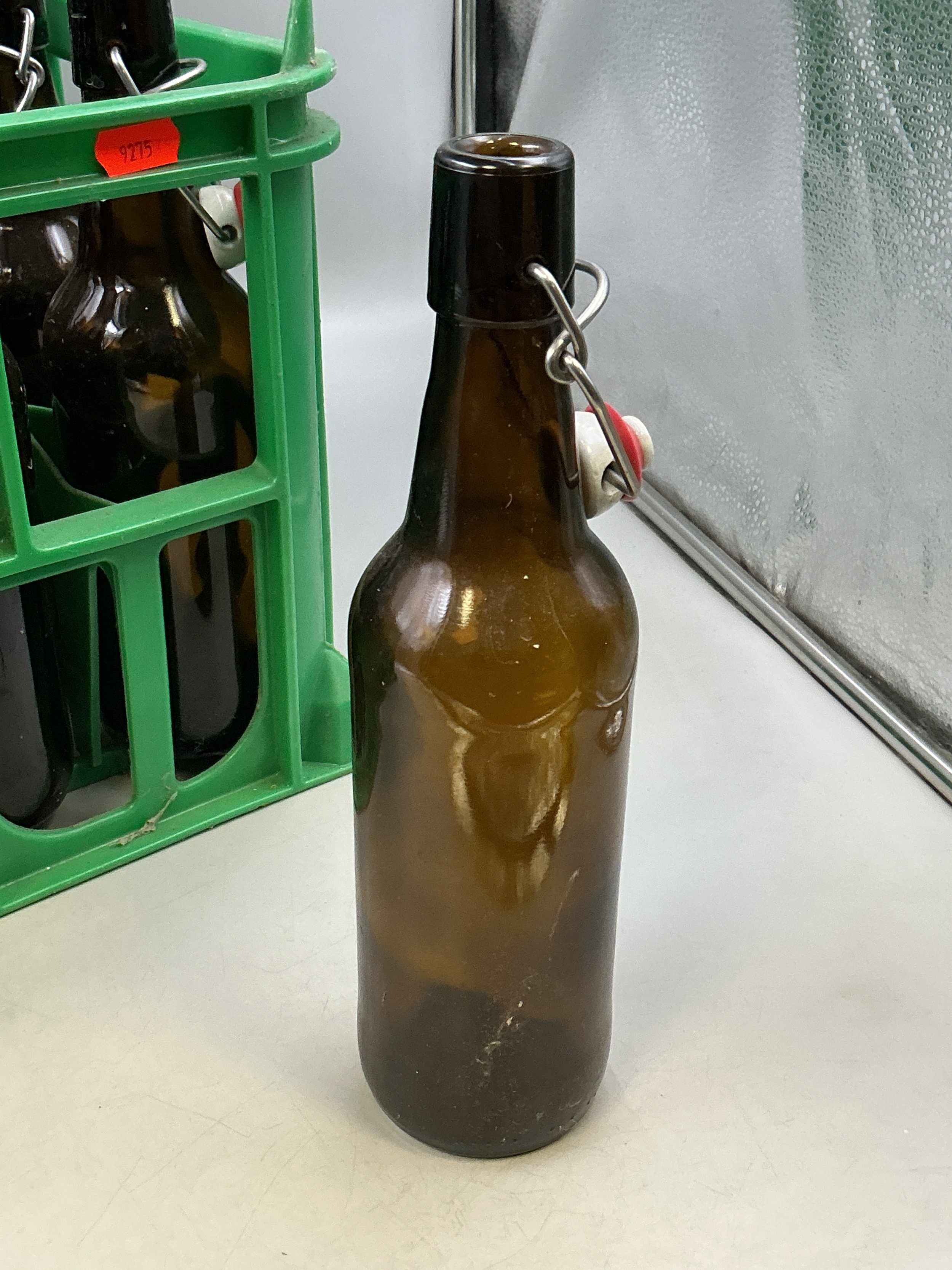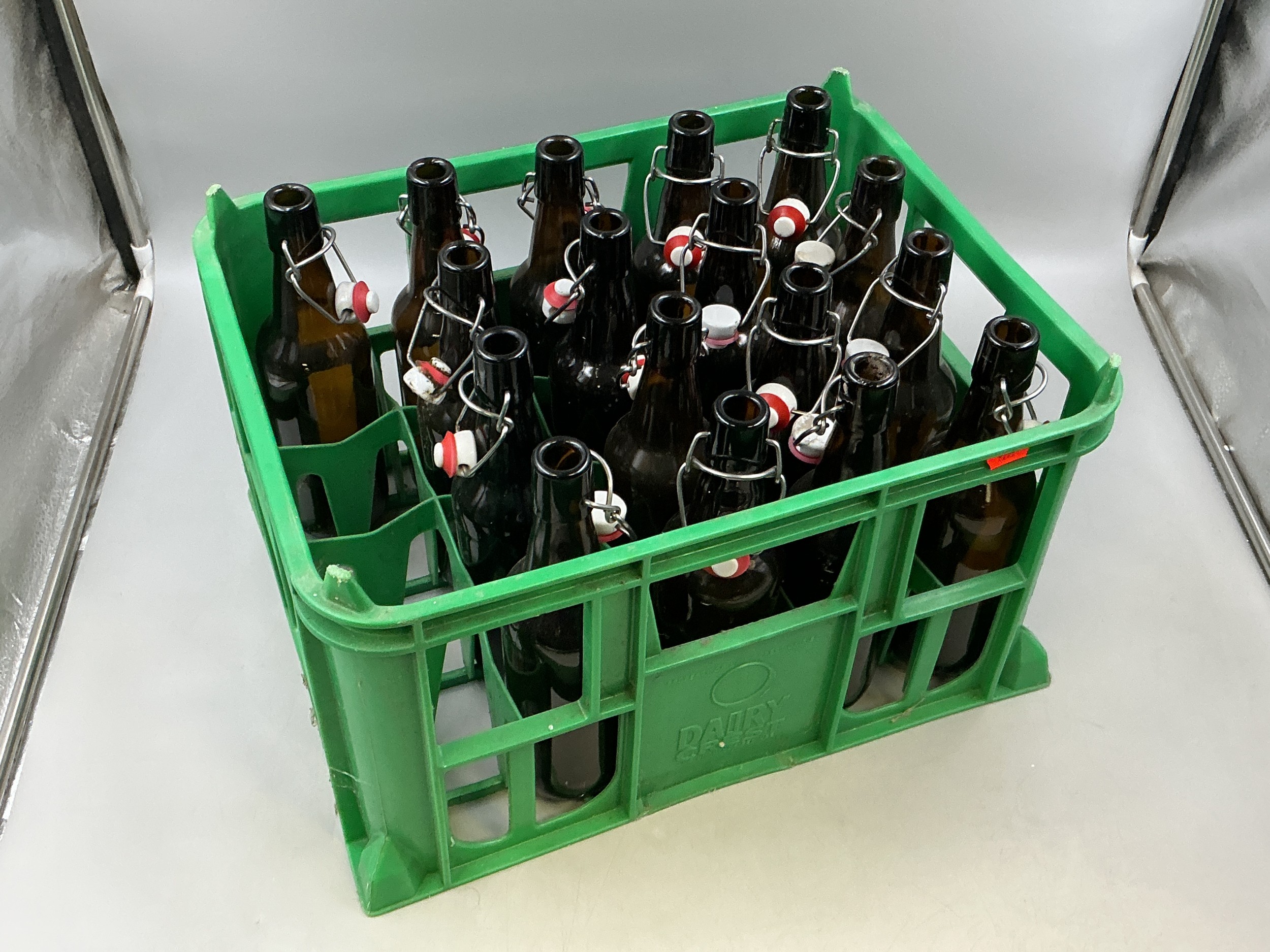 Seventeen Brown Glass Swing Top Bottles, In Bottle Crate. Bottles Are Approx 26cm Tall