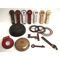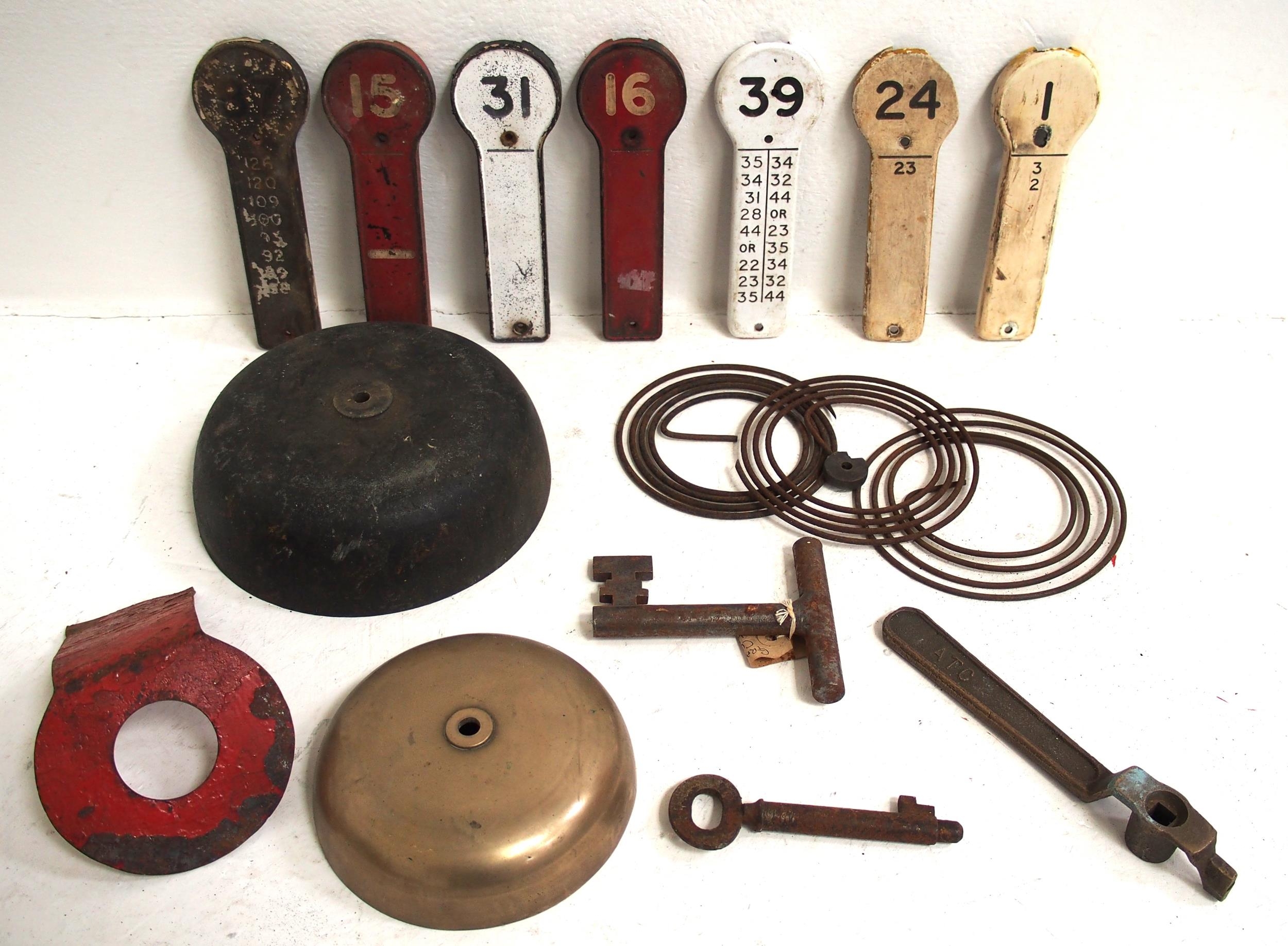 Quantity of signal box fittings including Annetts key, LMR lever plates, two block bell cast bells, GWR signal box door key, Syx ATC handle, block gong coils etc. (B3) (Dispatch by Mailboxes/Collect from Banbury Depot)