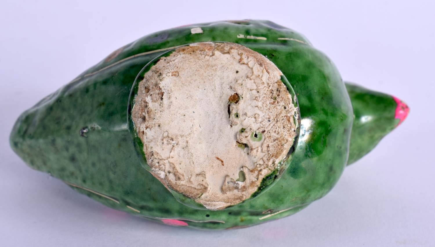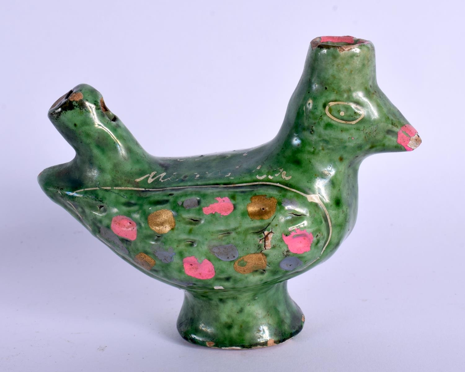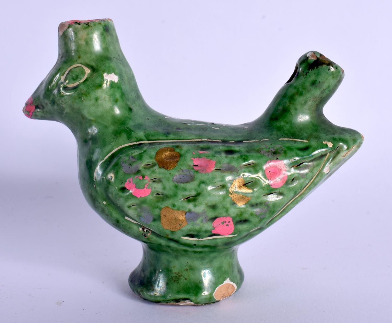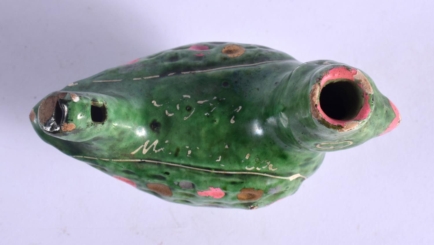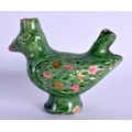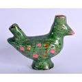 A RARE 18TH/19TH CENTURY INDIAN GREEN PAINTED POTTERY WHISTLE in the form of a bird. 9 cm x 8.5 cm.