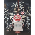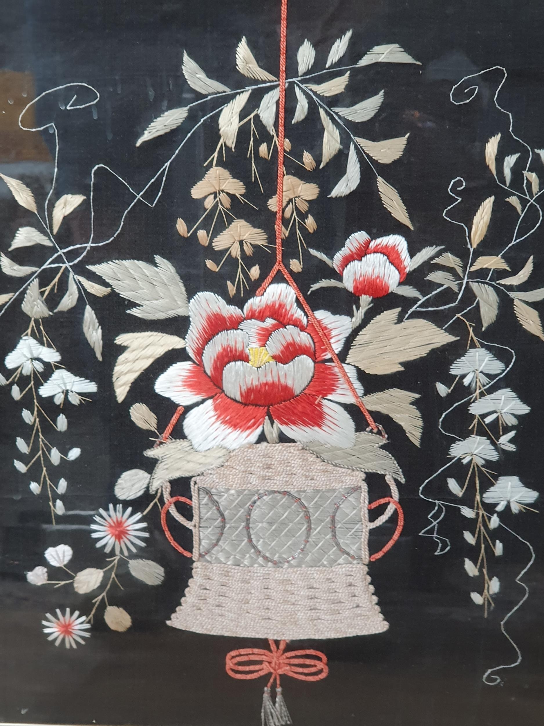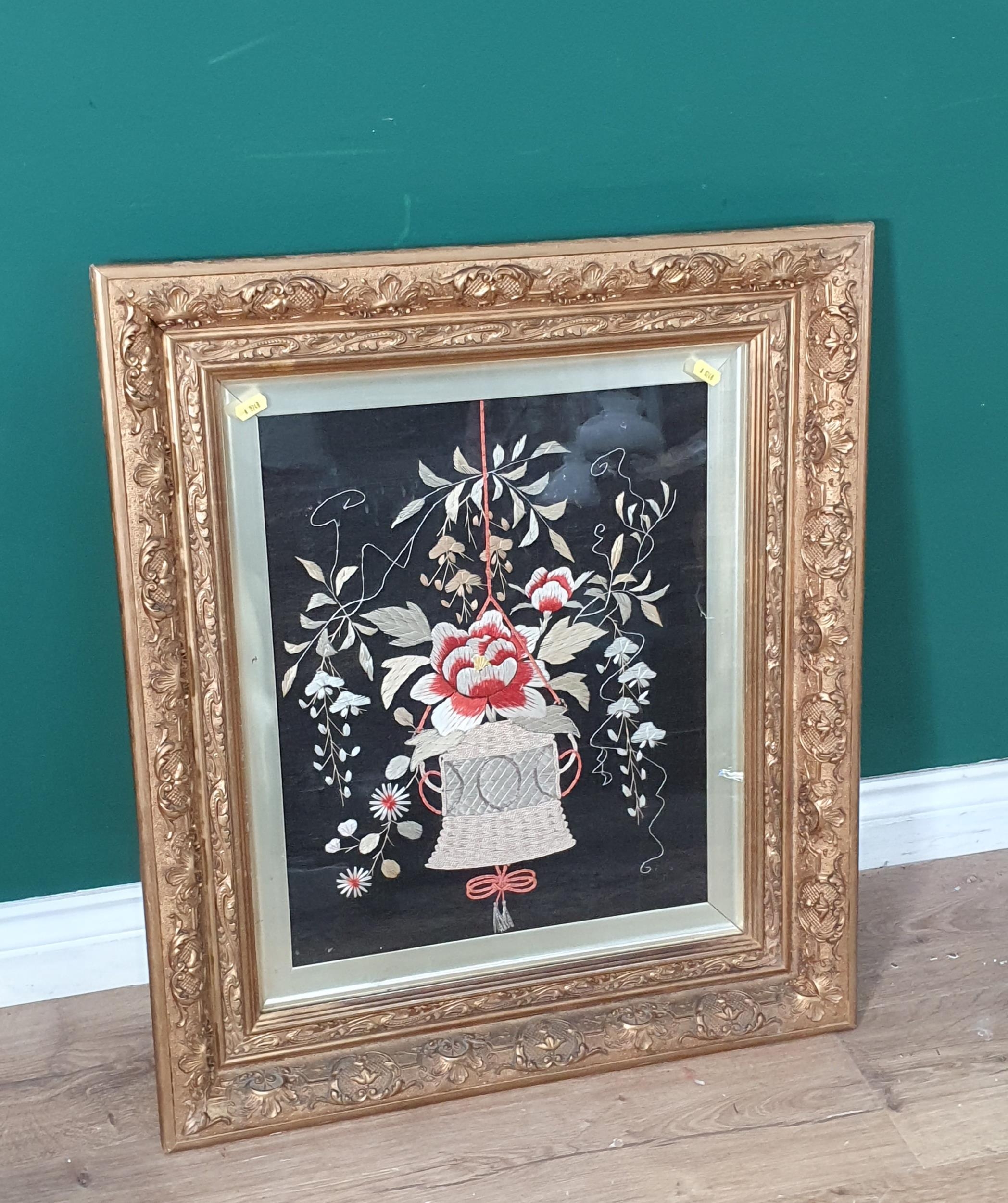 A gilt framed needlework depicting a hanging basket of flowers, 2ft 1in W x 2ft 4in H (R7)