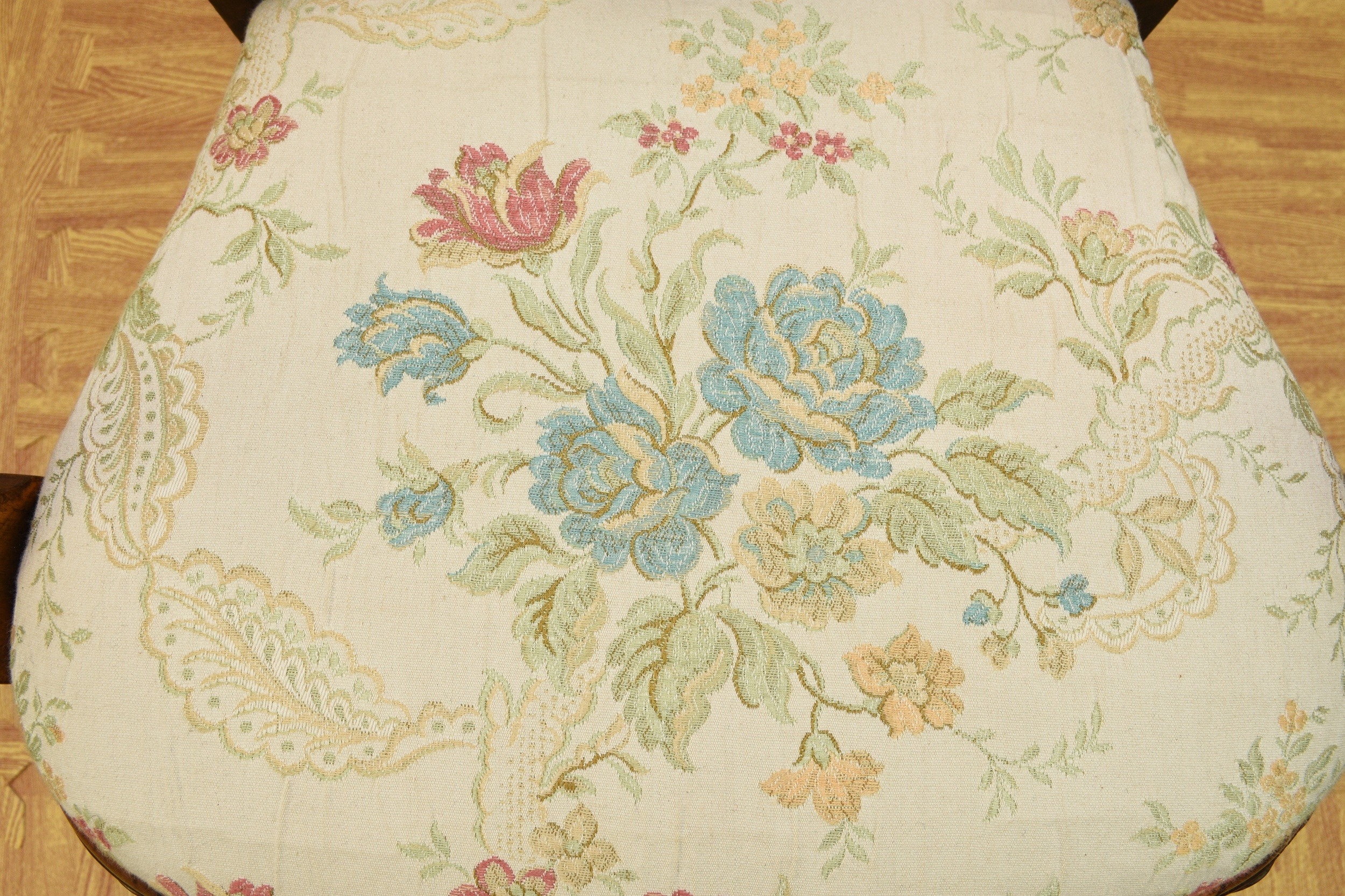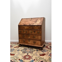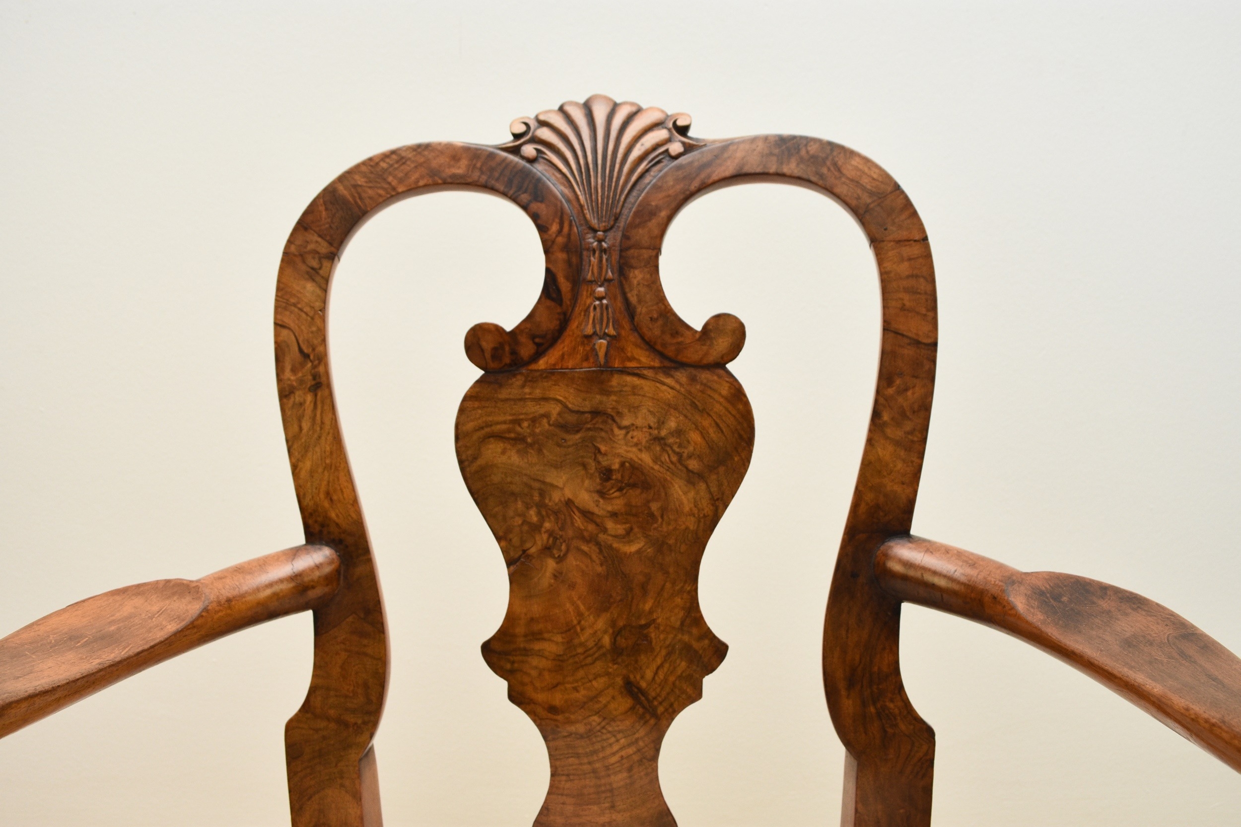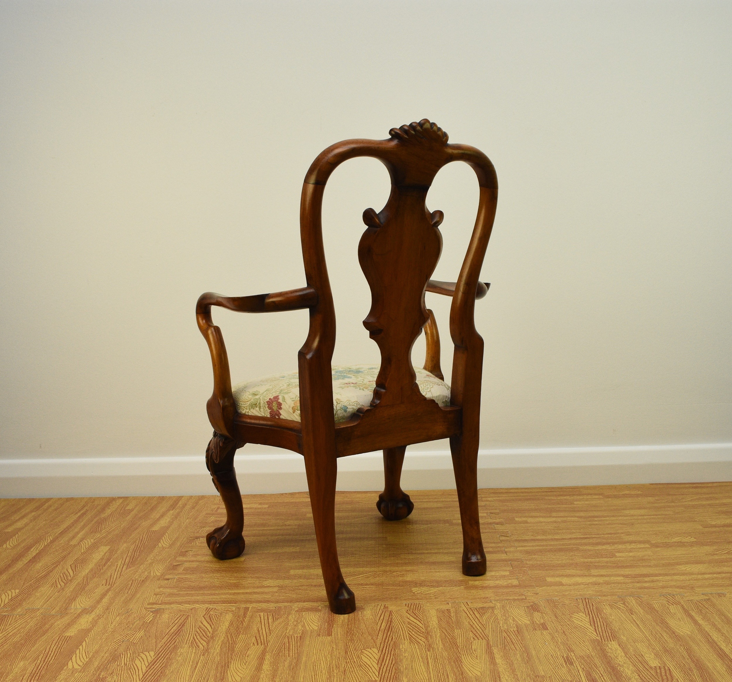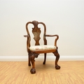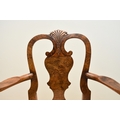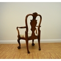 A George I style walnut child's armchair With shaped splat and shell cresting, the shaped arms above a drop-in seat cushion, raised on shell-capped cabriole front supports with claw-and-ball feet. 46cm wide x 41cm deep x 70cm high, seat height 32cm Condition:Good overall. Sturdy. No evidence of worm.