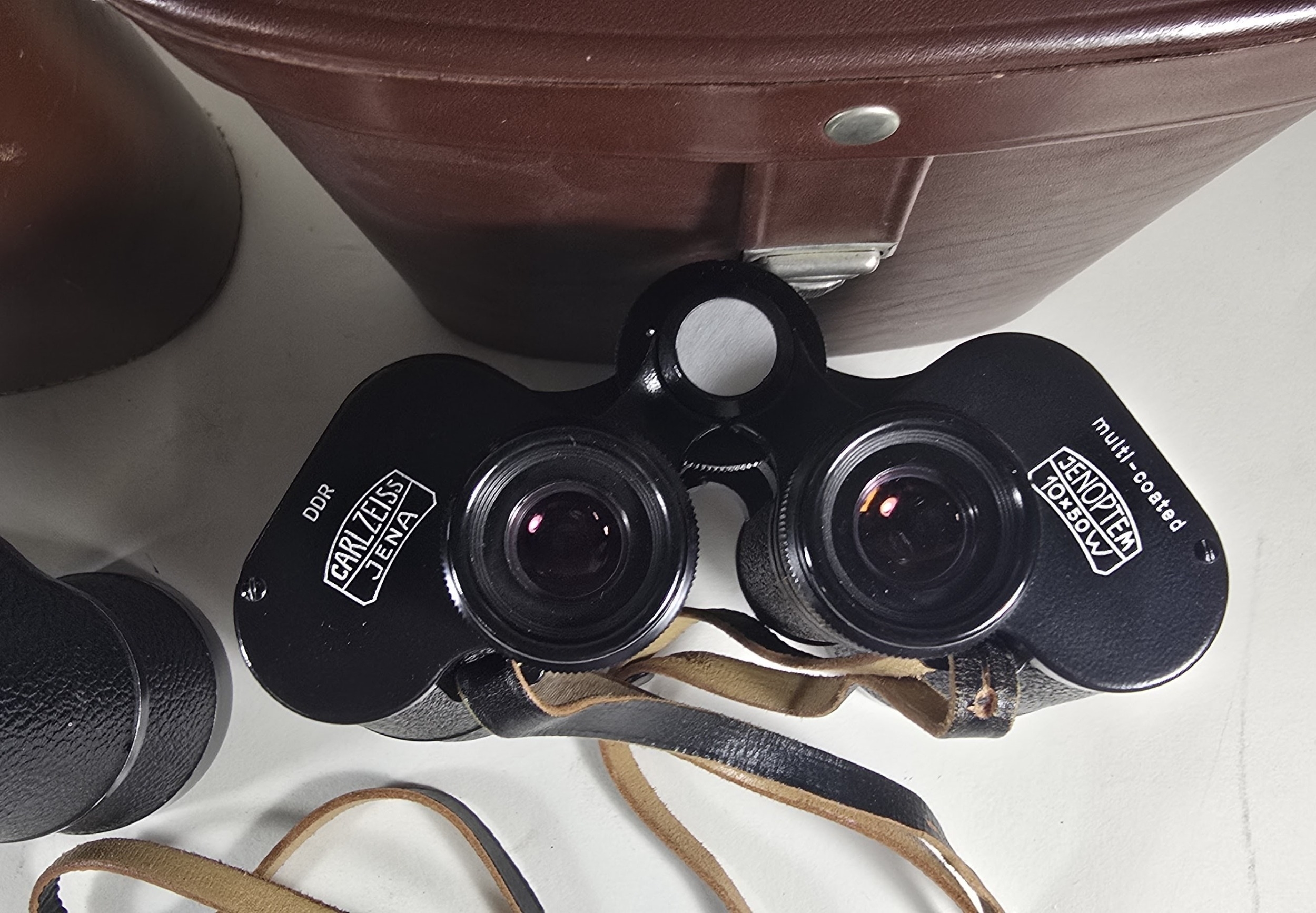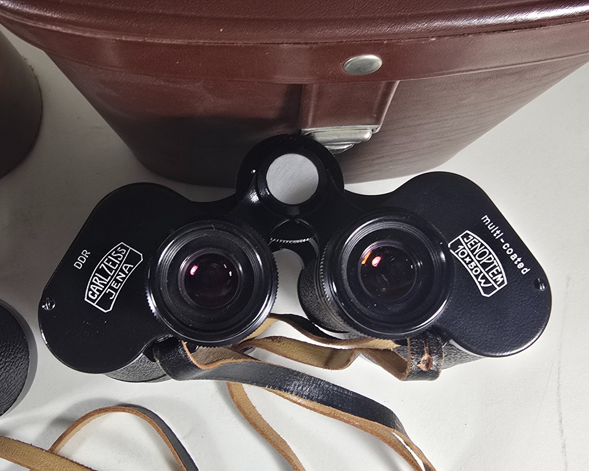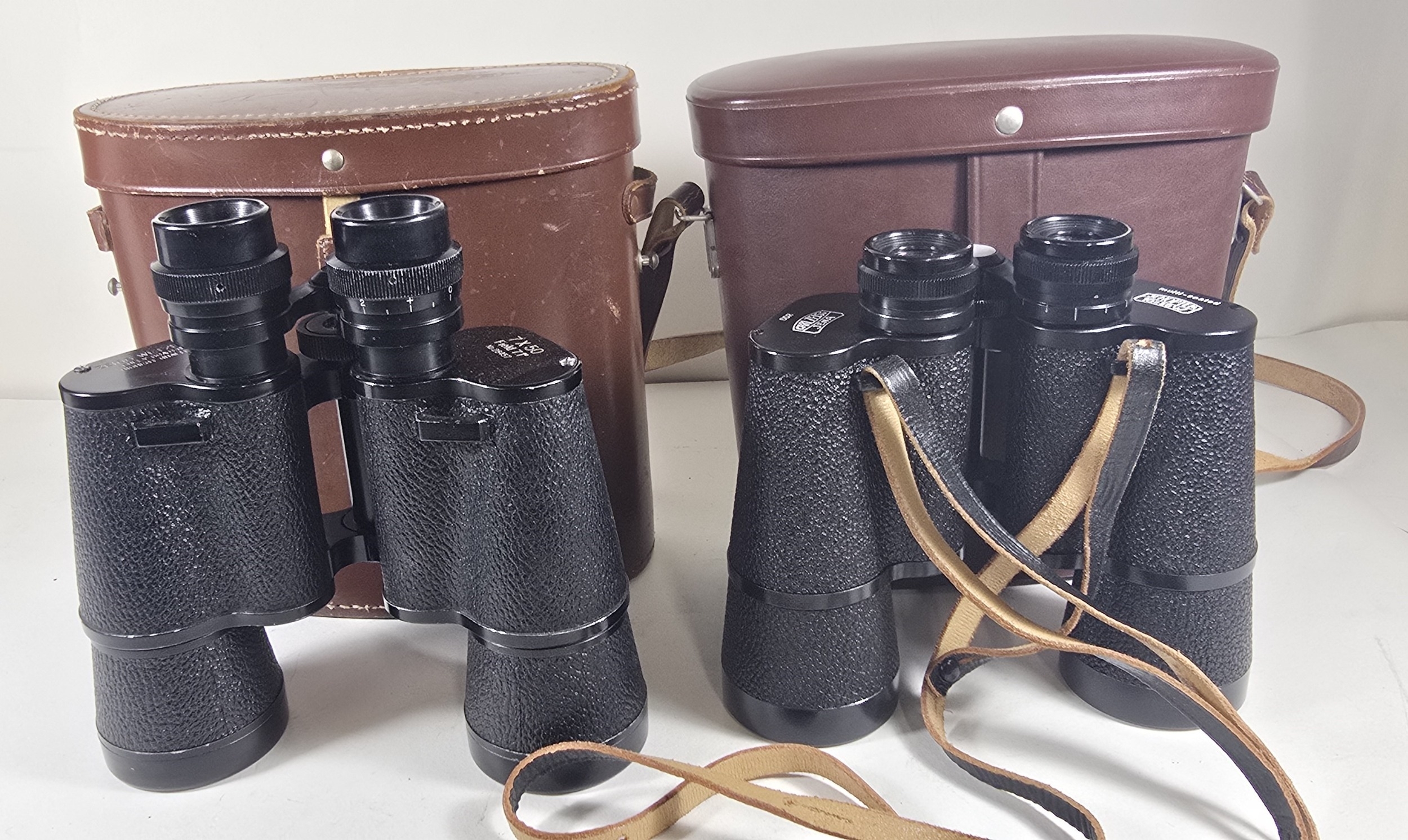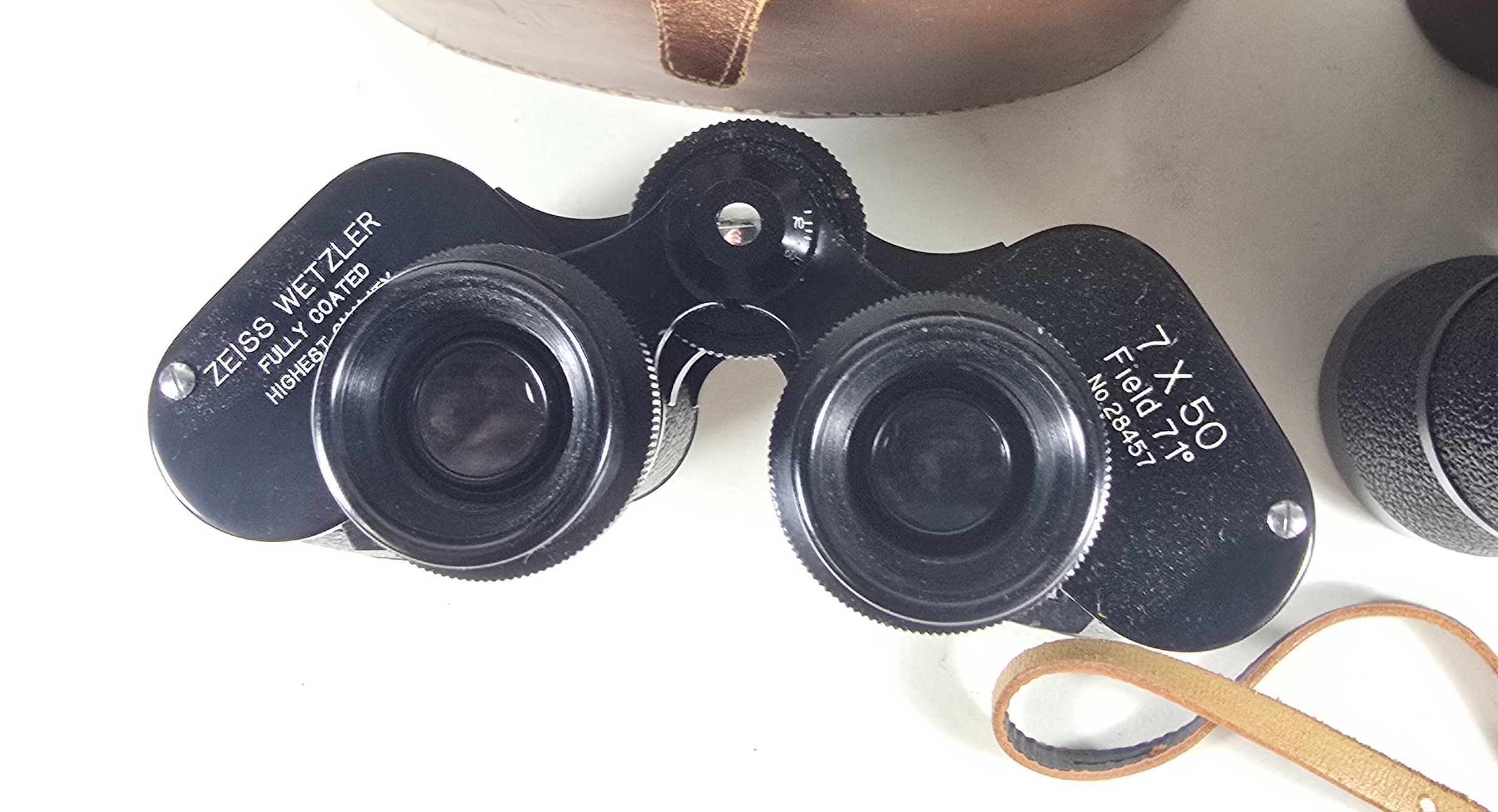 A pair of Zeiss Wetzler 7x50 prismatic binoculars, and a pair of Carl Zeiss Jena 10x50 binoculars, both VGC in their leather carrying cases. (2)
