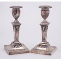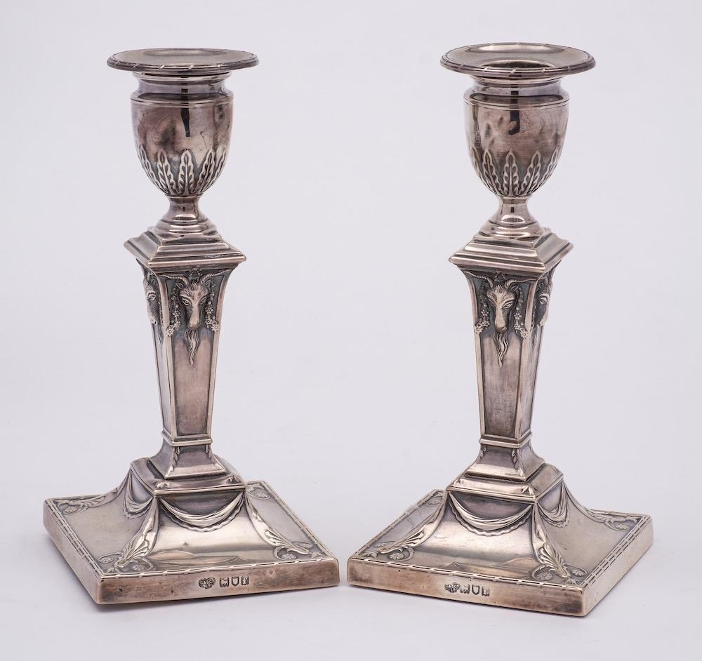 A pair of Edward VII silver candlesticks, maker Goldsmiths & Silversmiths Co Ltd, London, 1901: of neo-classical design, the urn-shaped nozzles with acanthus leaf decoration, raised on square tapering columns with ram's head masks, on square weighted bases, 18.5cm high.