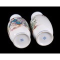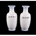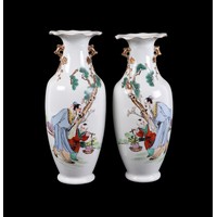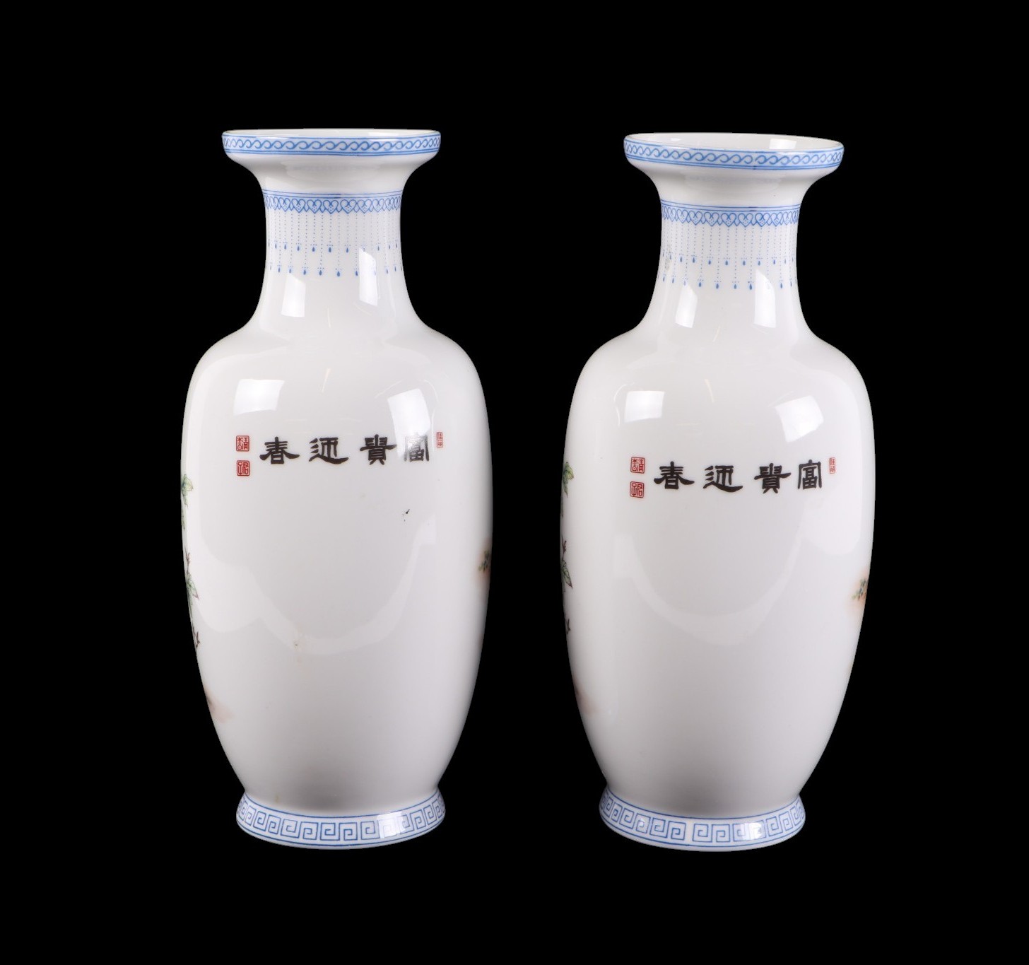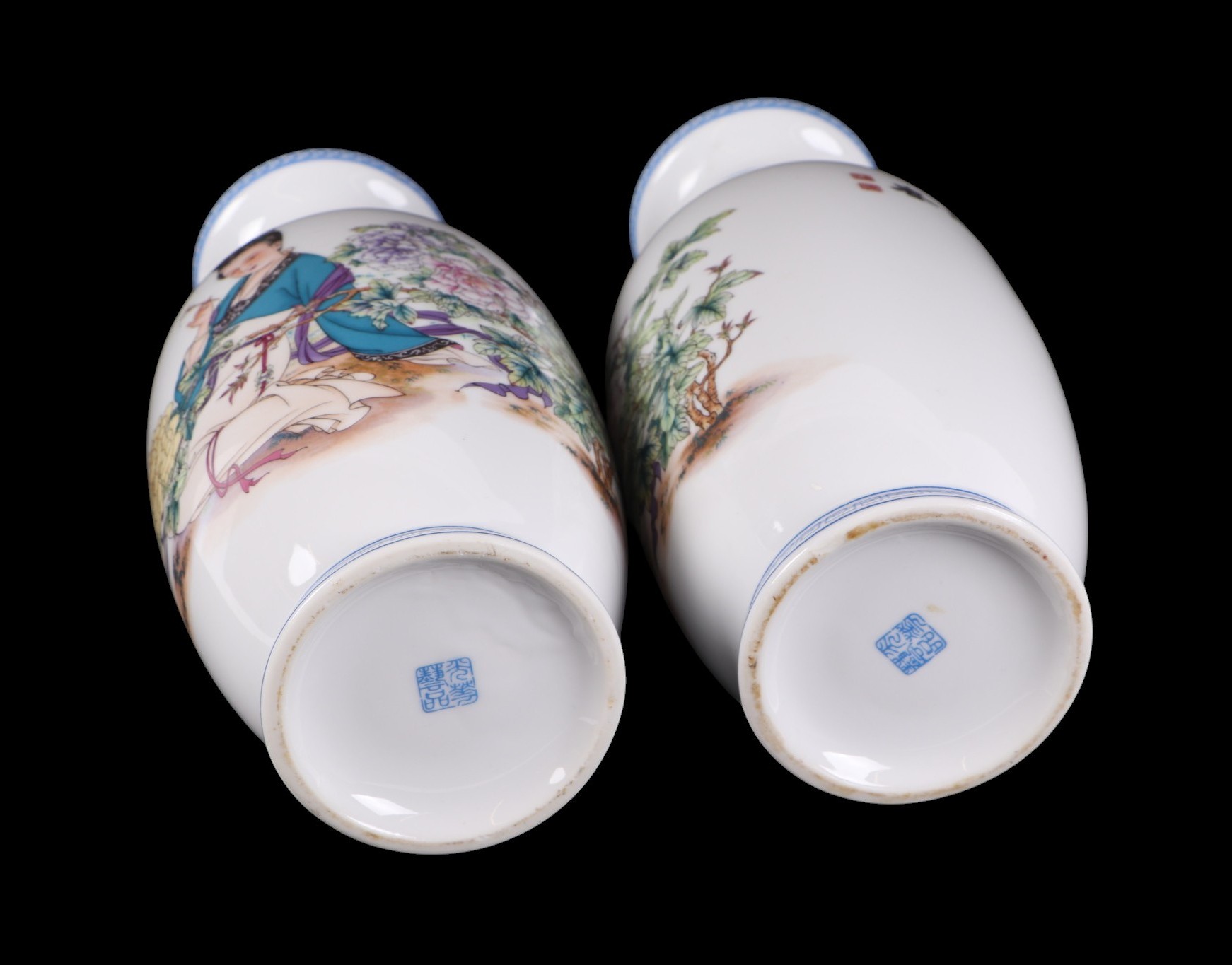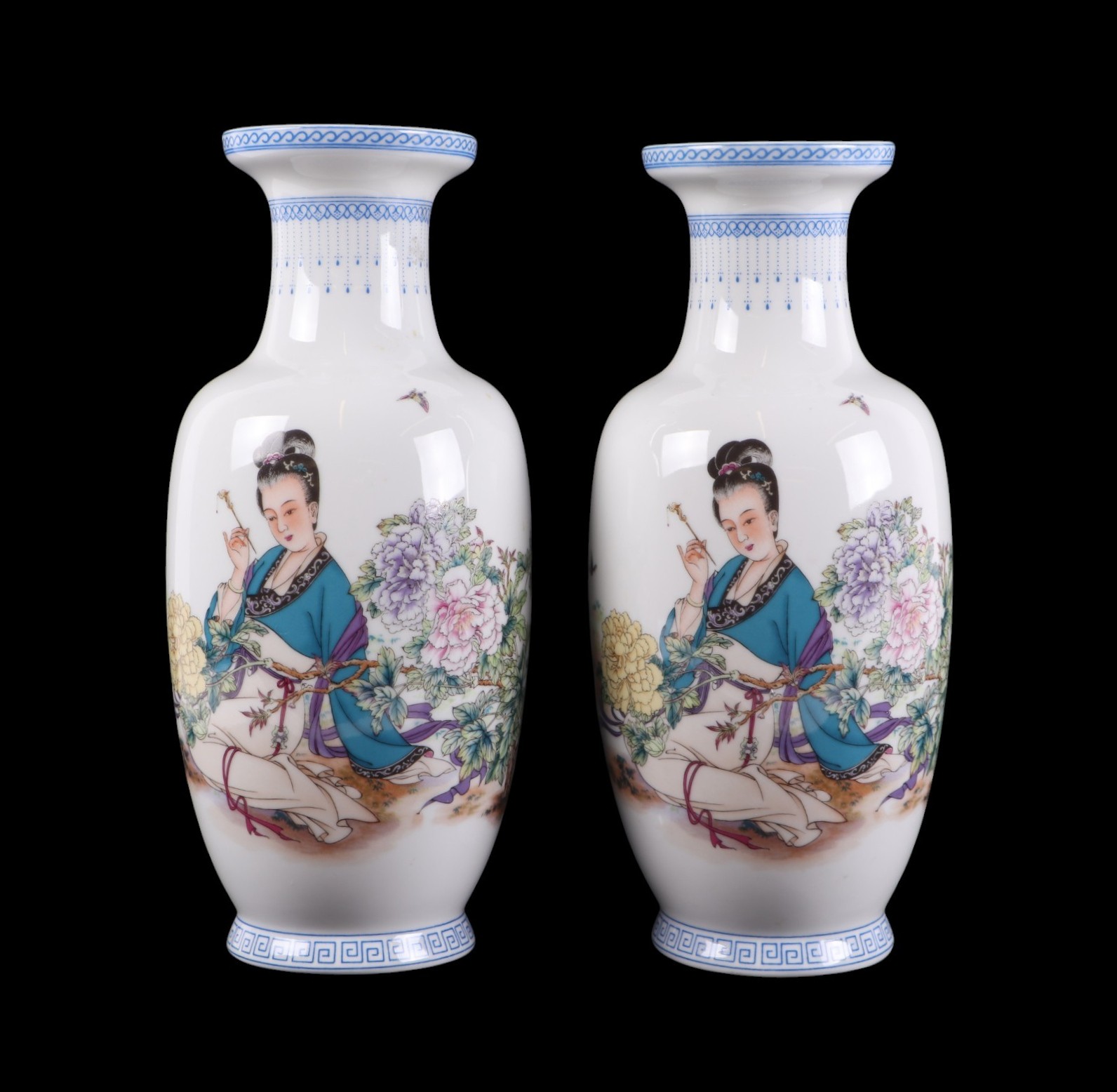 A pair of Chinese Republic style vases decorated with a robed woman amongst flowers and calligraphy, blue seal mark to the underside, 30cms high.