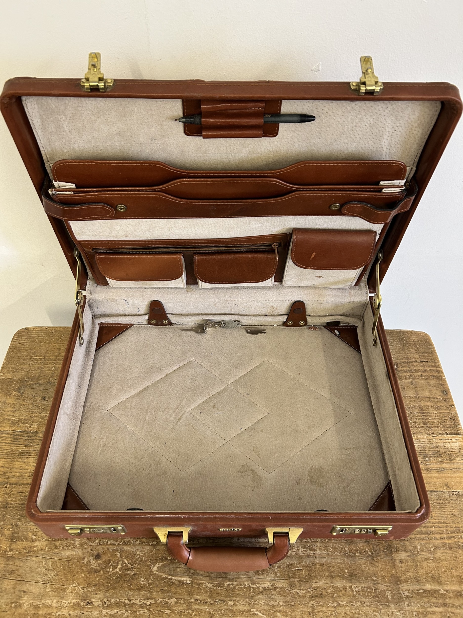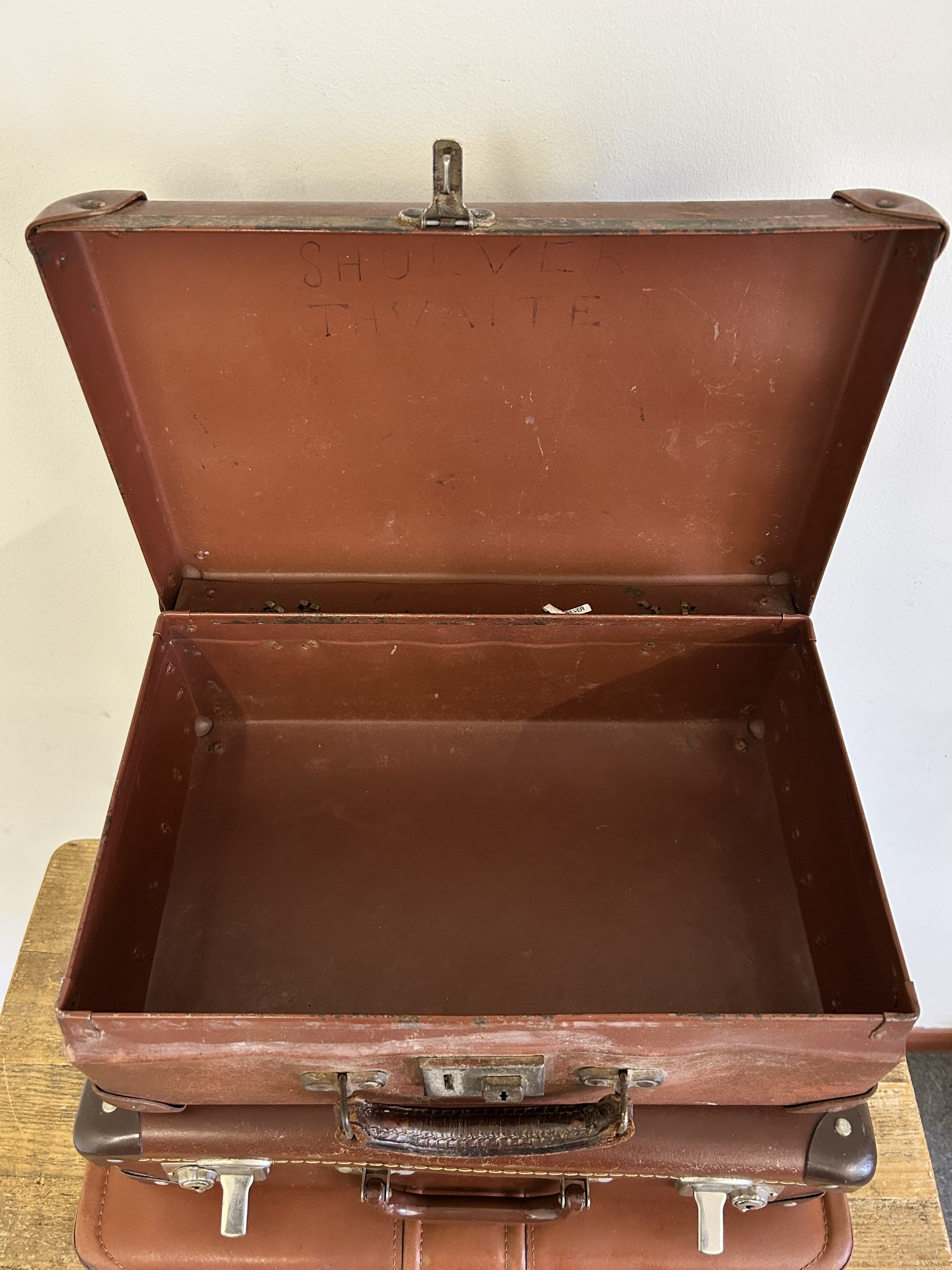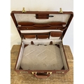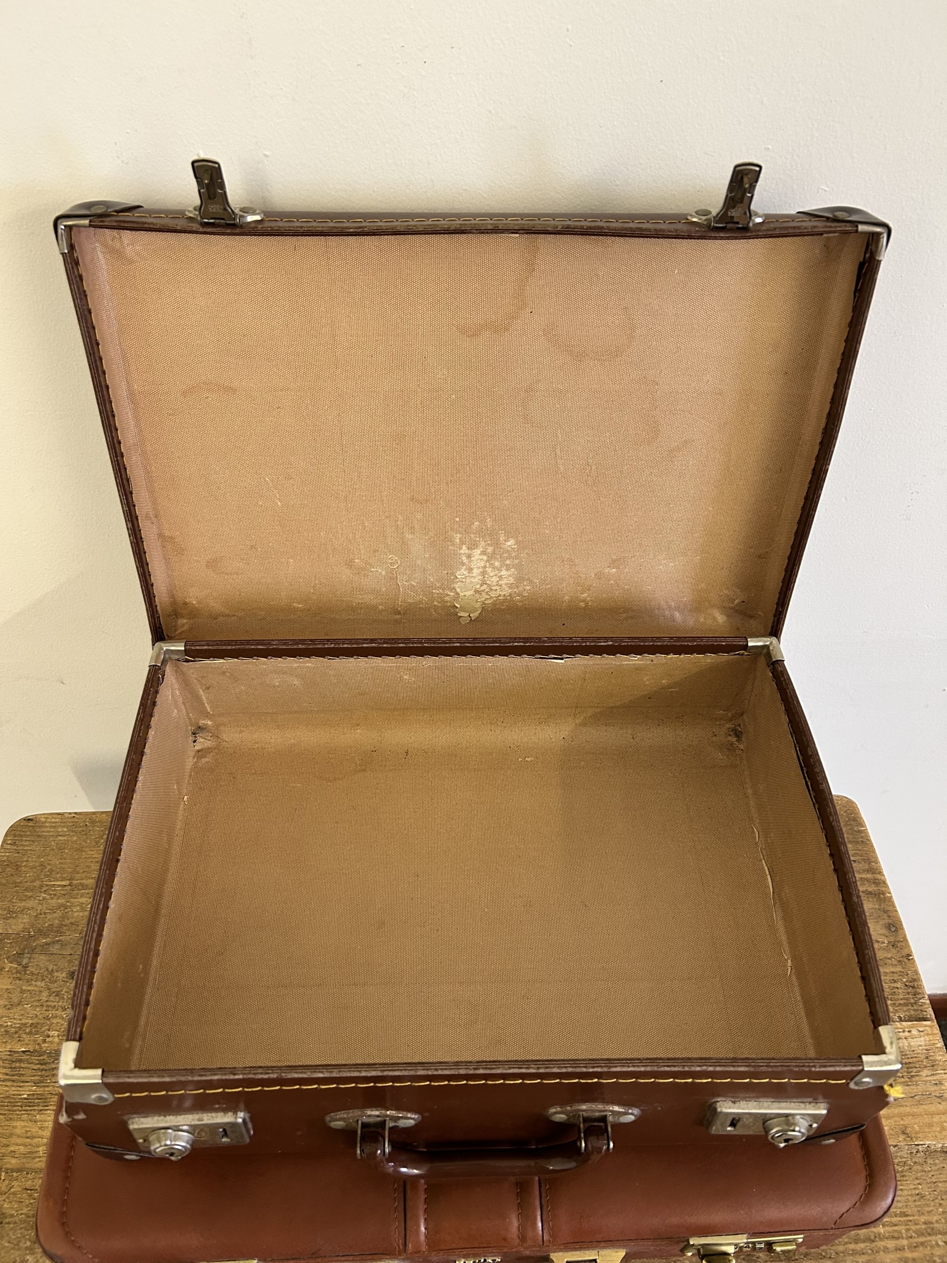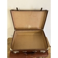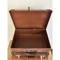 Two vintage leather style small suitcases plus a leather briefcase (with age related wear)