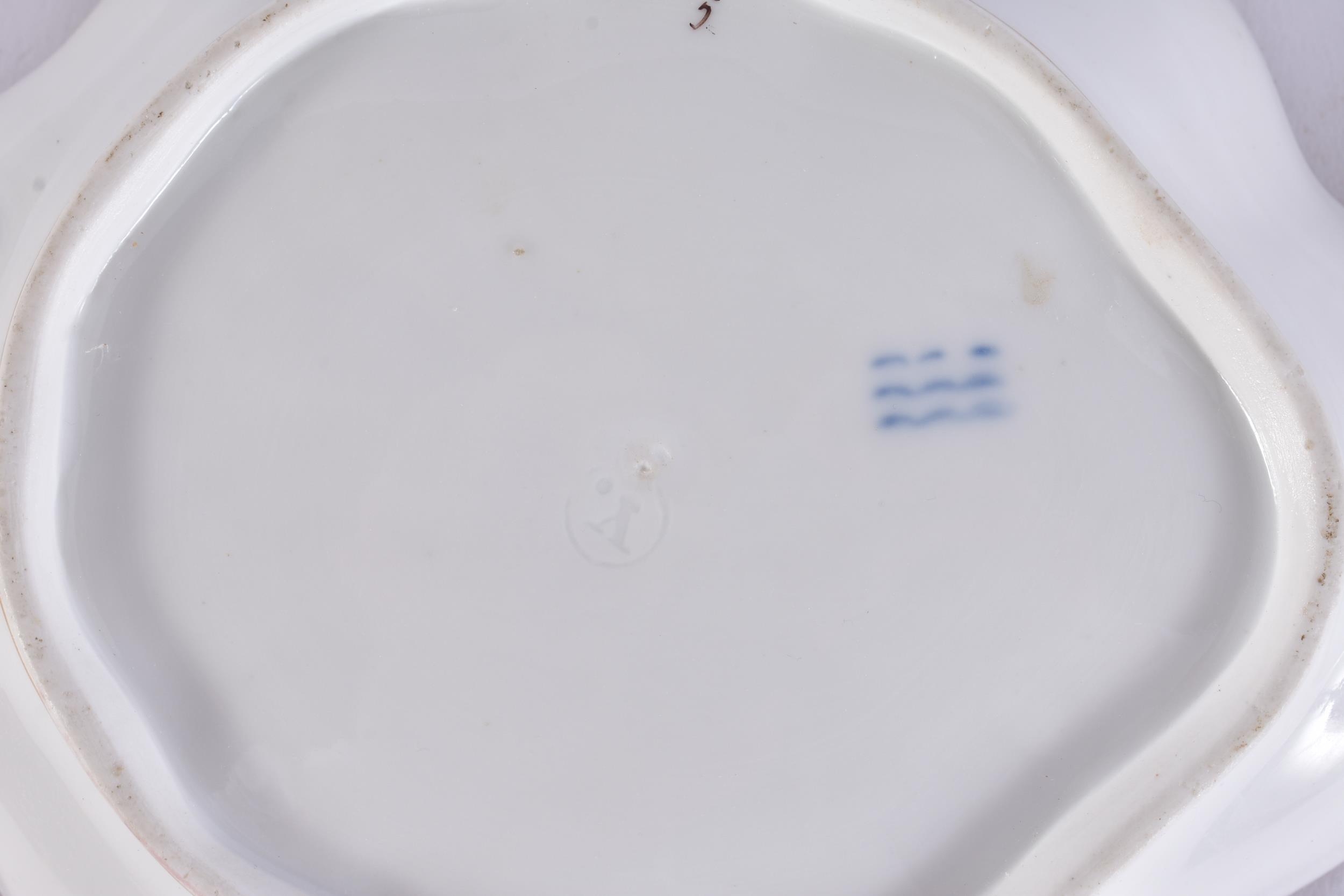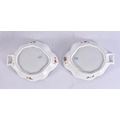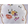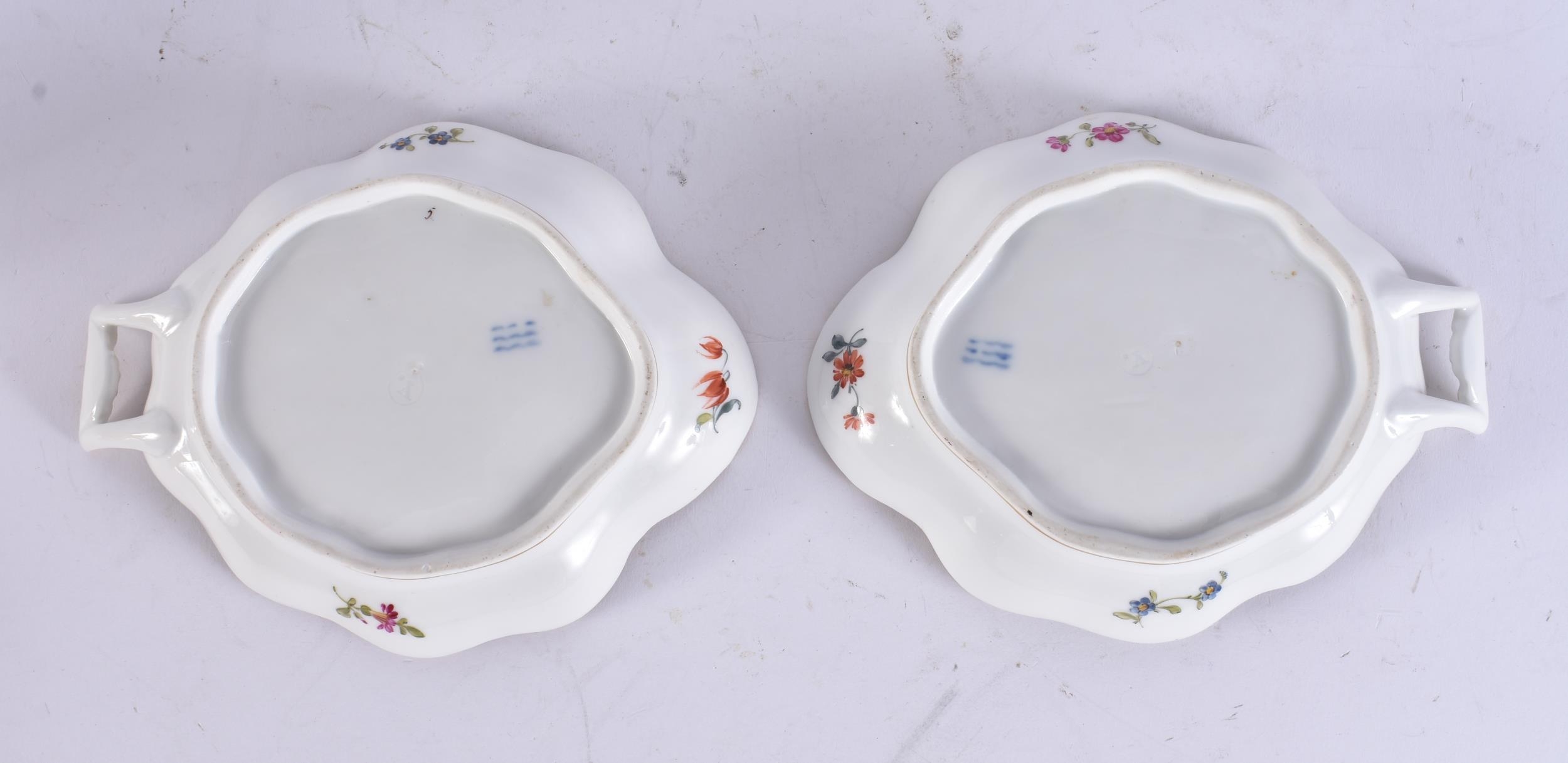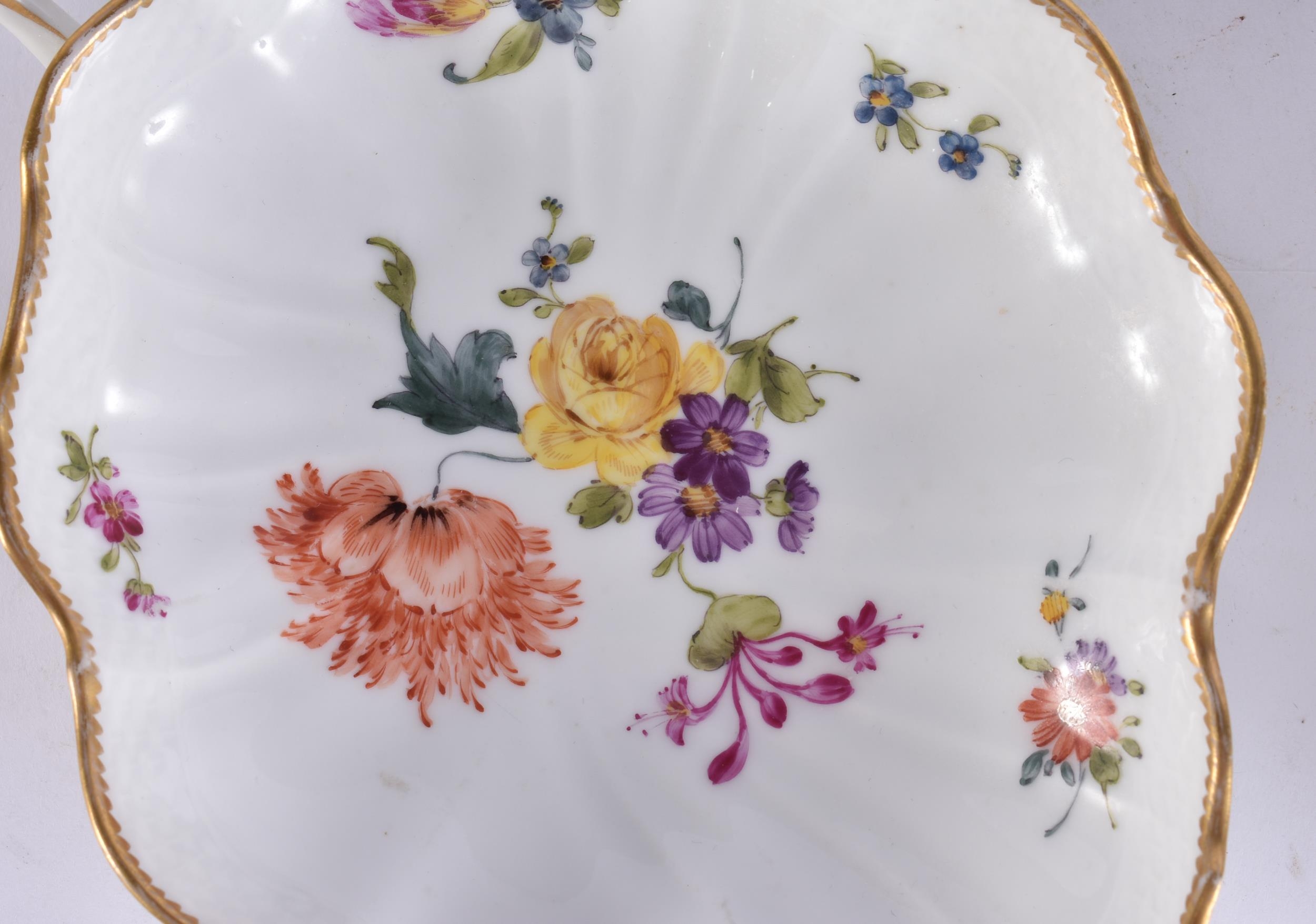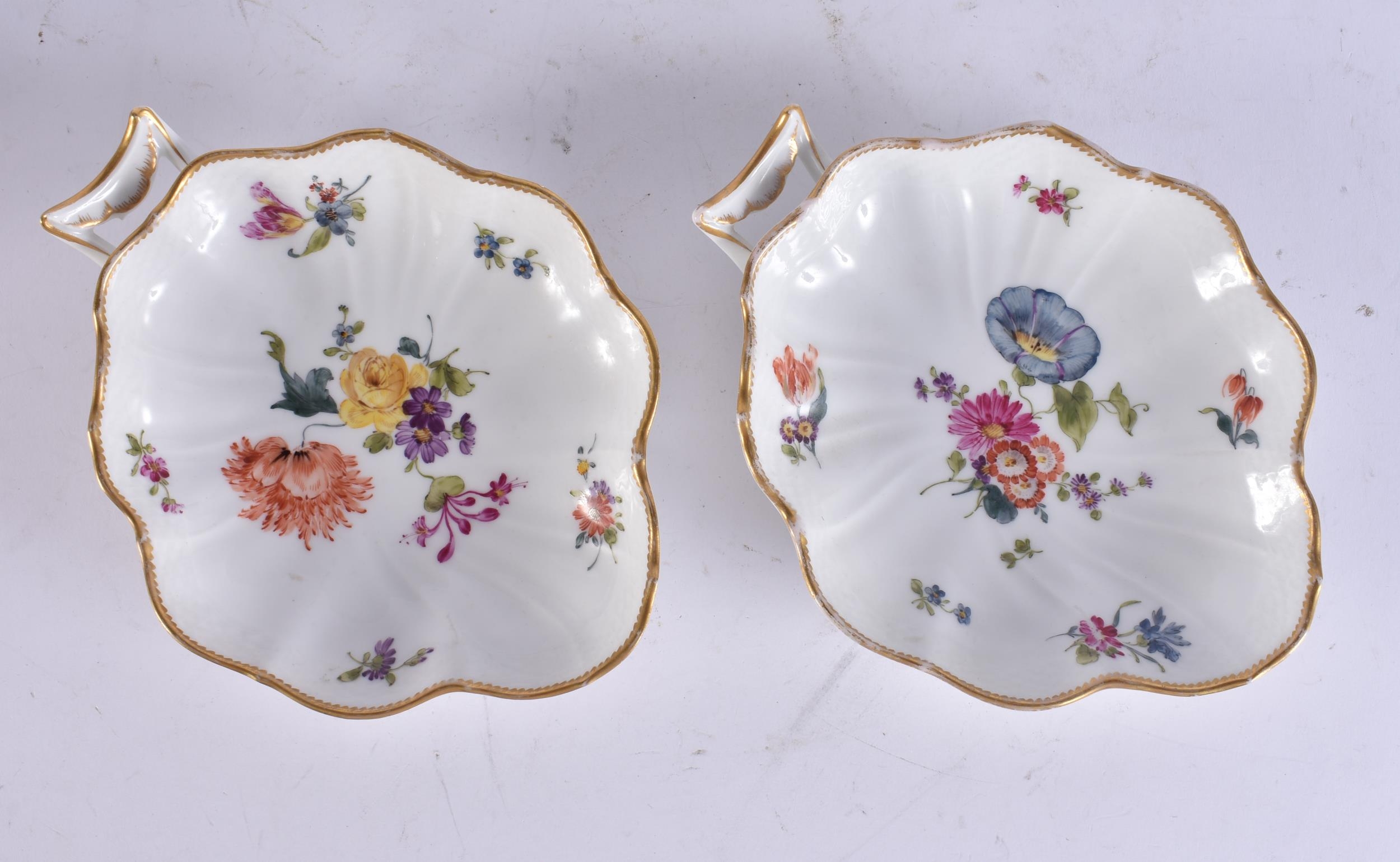 A PAIR OF ANTIQUE DANISH COPENHAGEN PORCELAIN LEAF SHAPED DISHES painted with flowers. 18 cm x 13 cm.