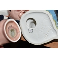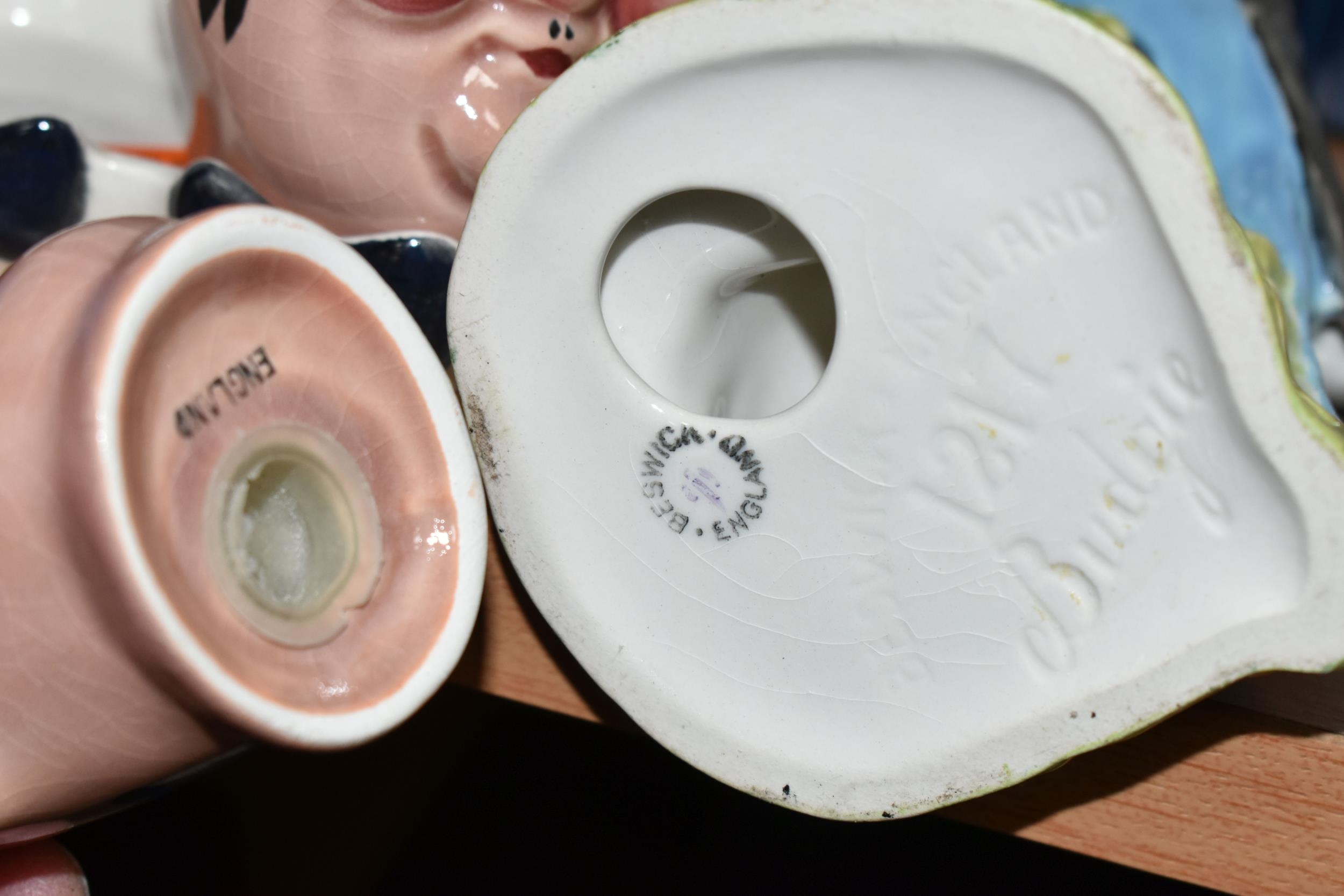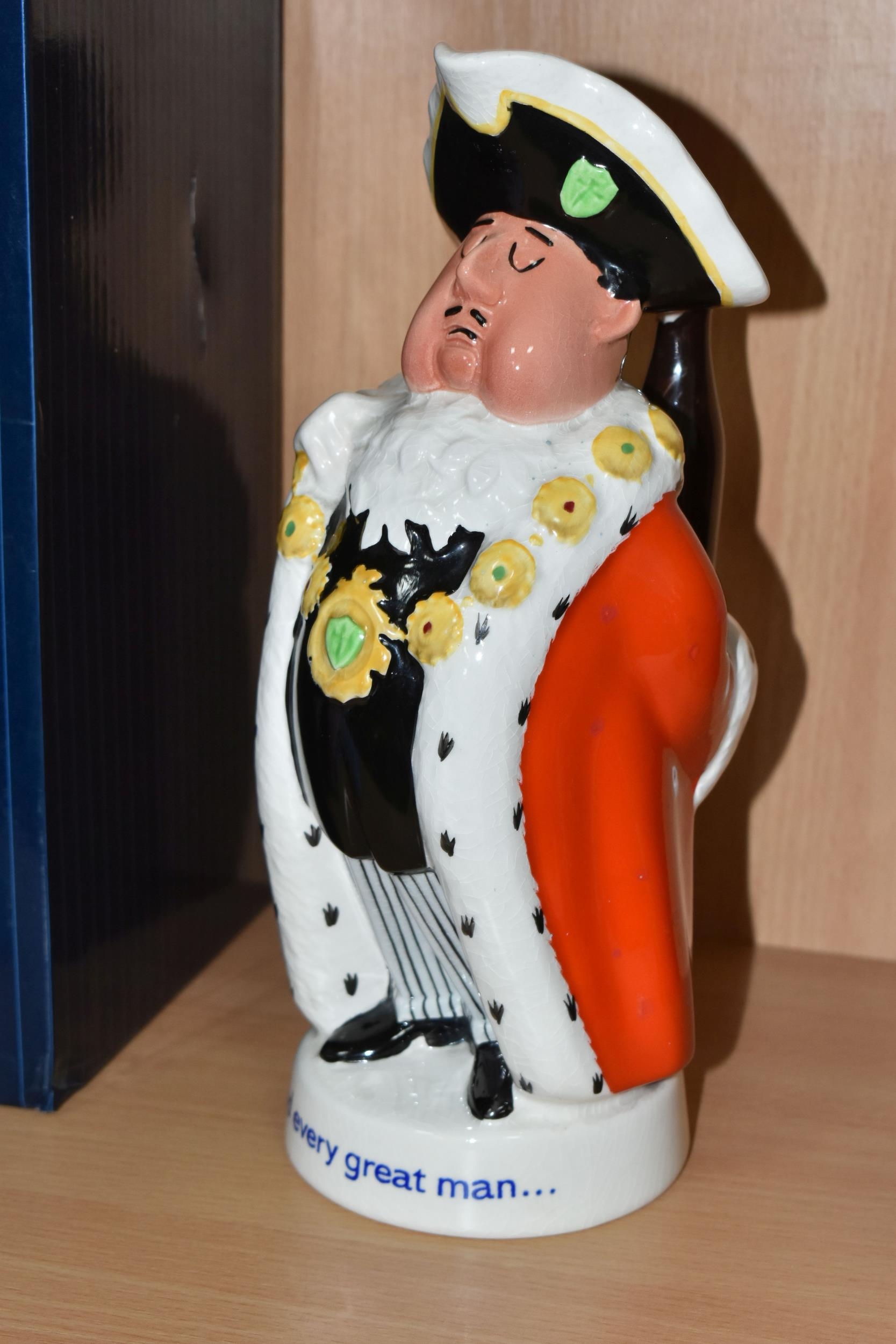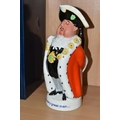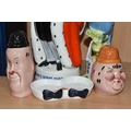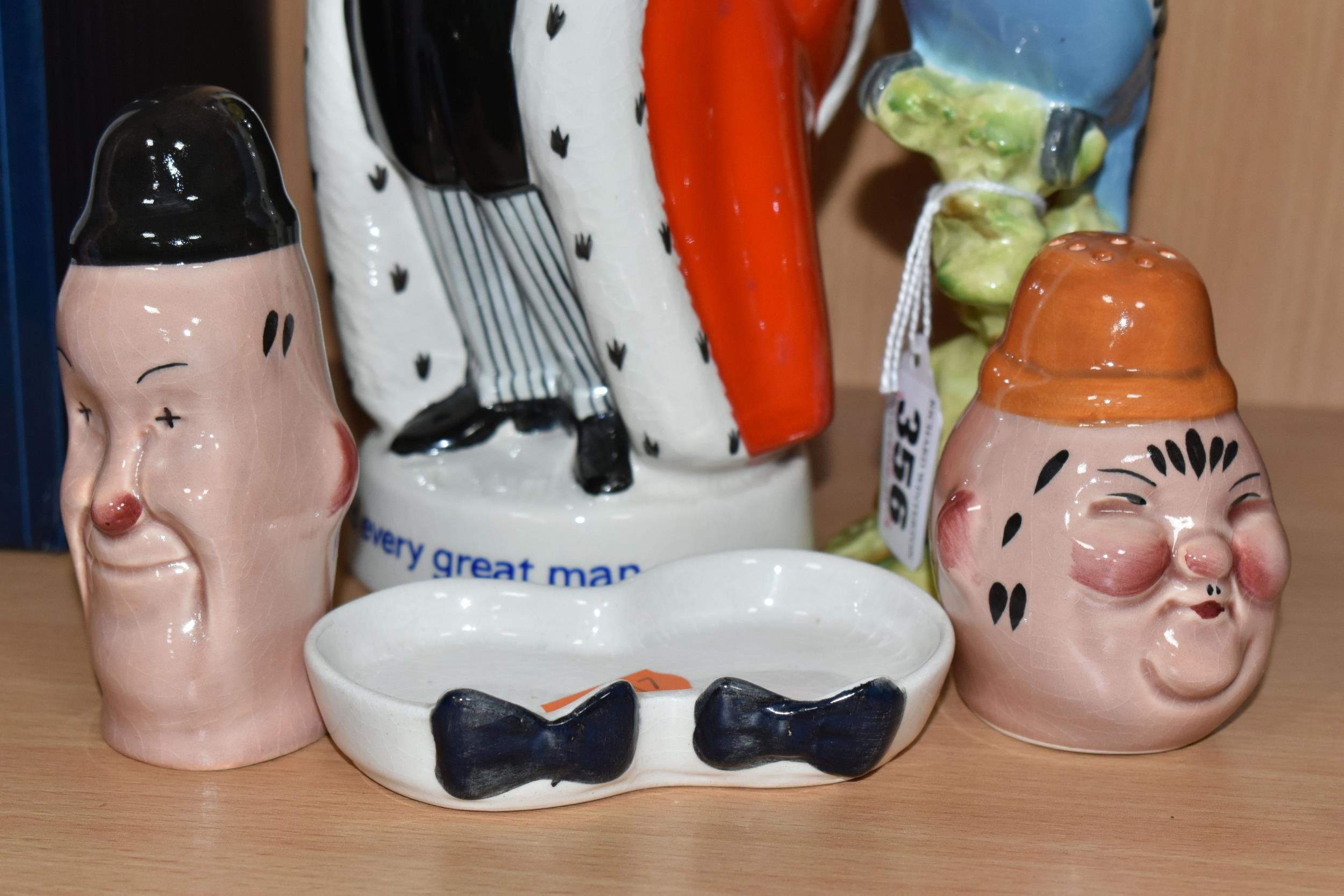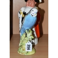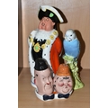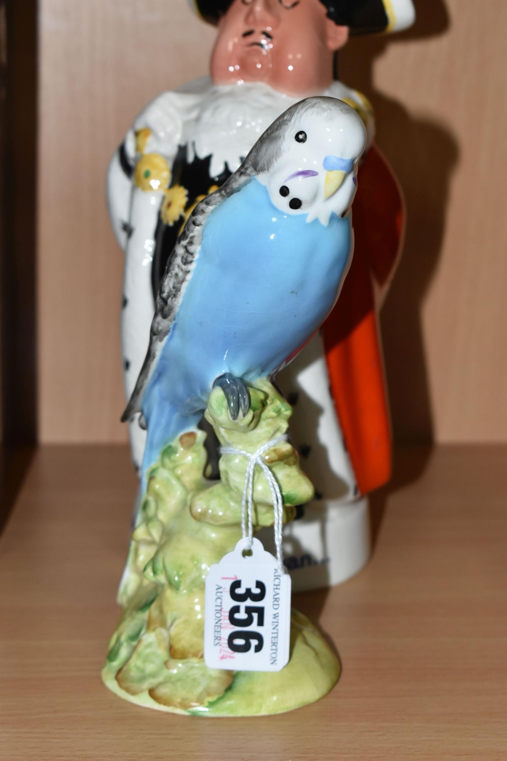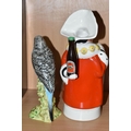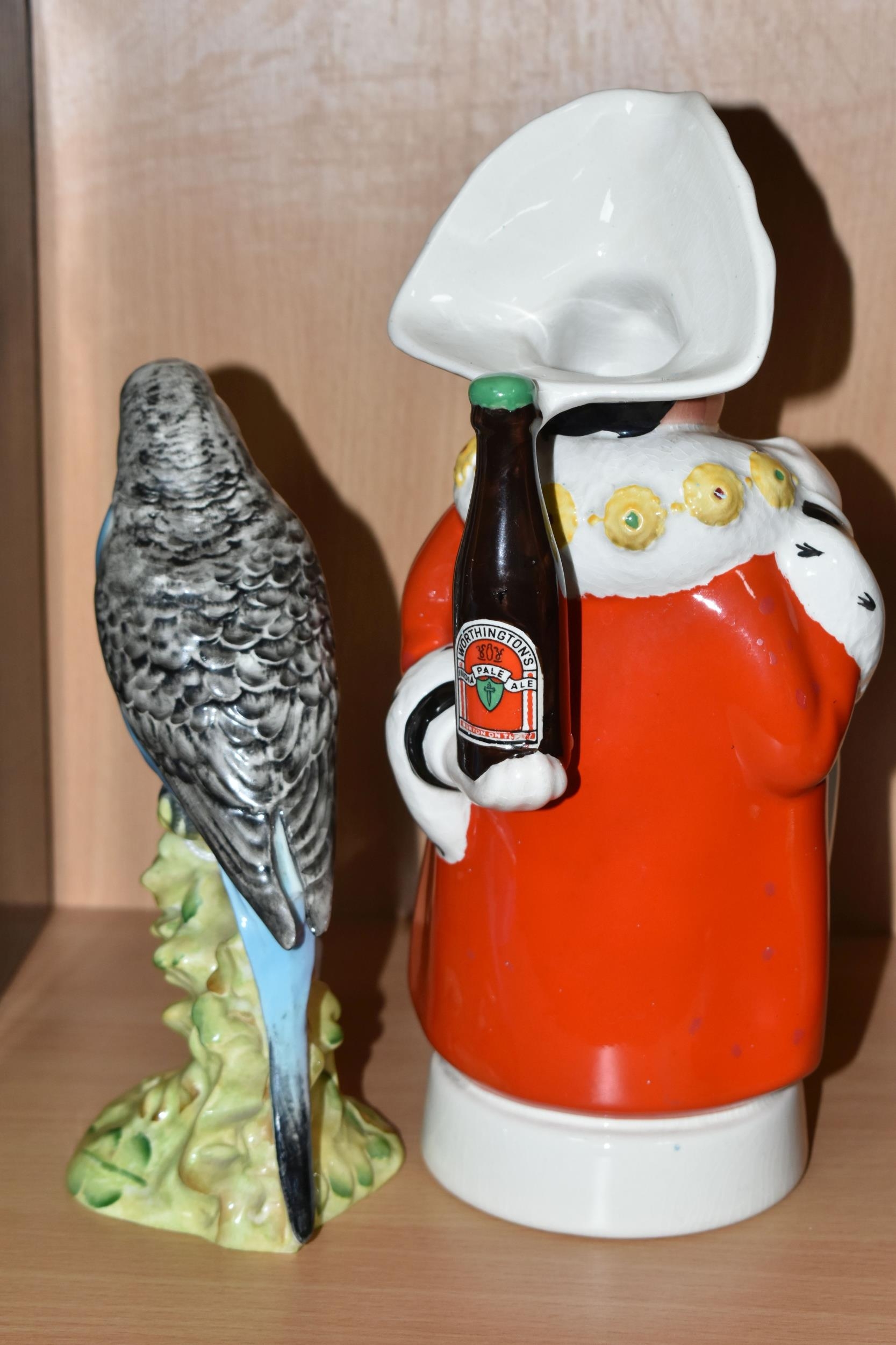 A GROUP OF BESWICK ORNAMENTS, comprising a Worthington's India Pale Ale water jug in the form of a Lord Mayor 'Behind Every Great Man' (crazing and restoration work to flaking paint), a ' Blue Budgie' 1217 and a Laurel and Hardy salt & pepper set (Hardy missing stopper) (3) (Condition Report: all pieces have crazing in varying degrees, other obvious damage is mentioned in description)