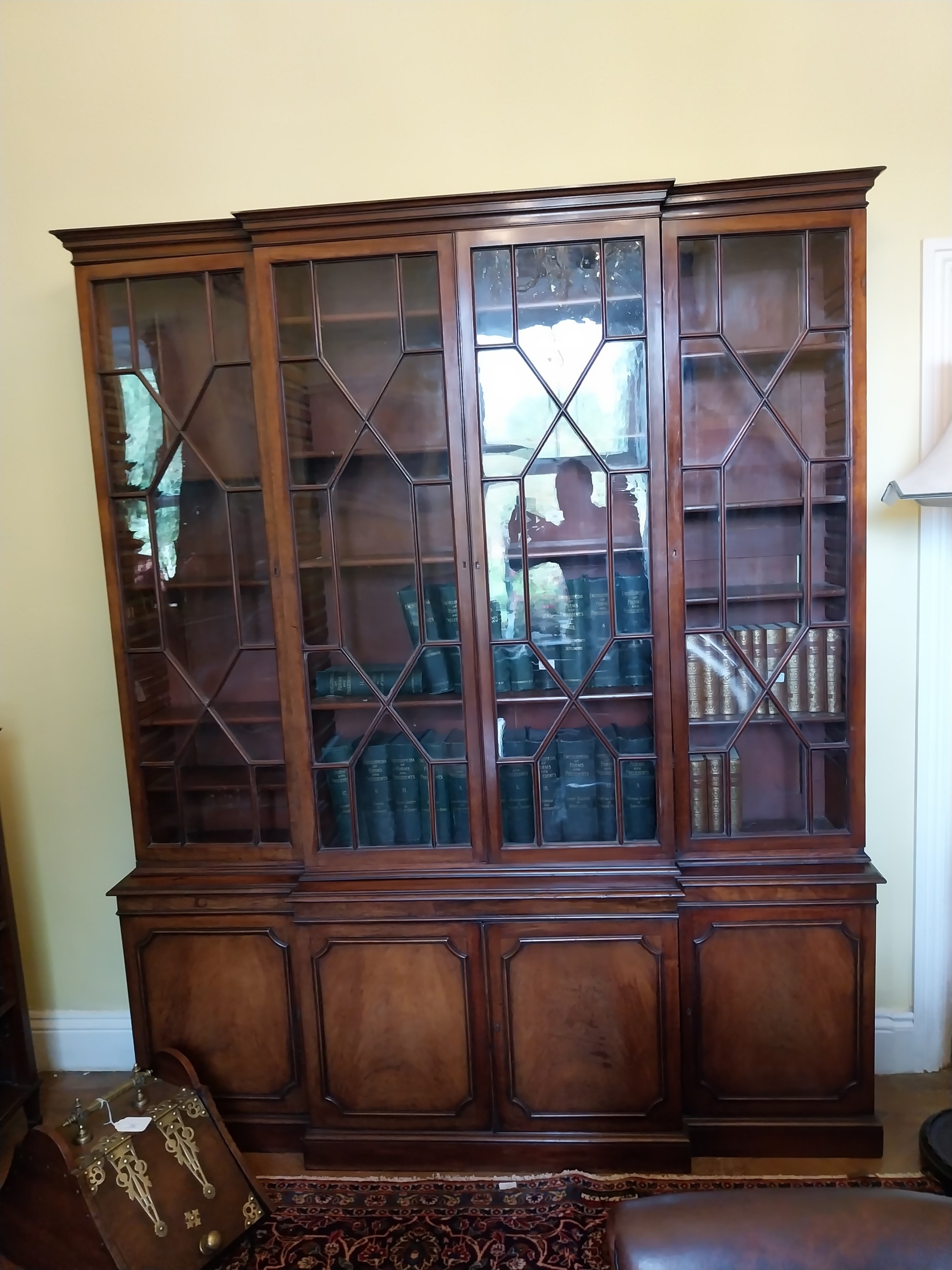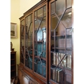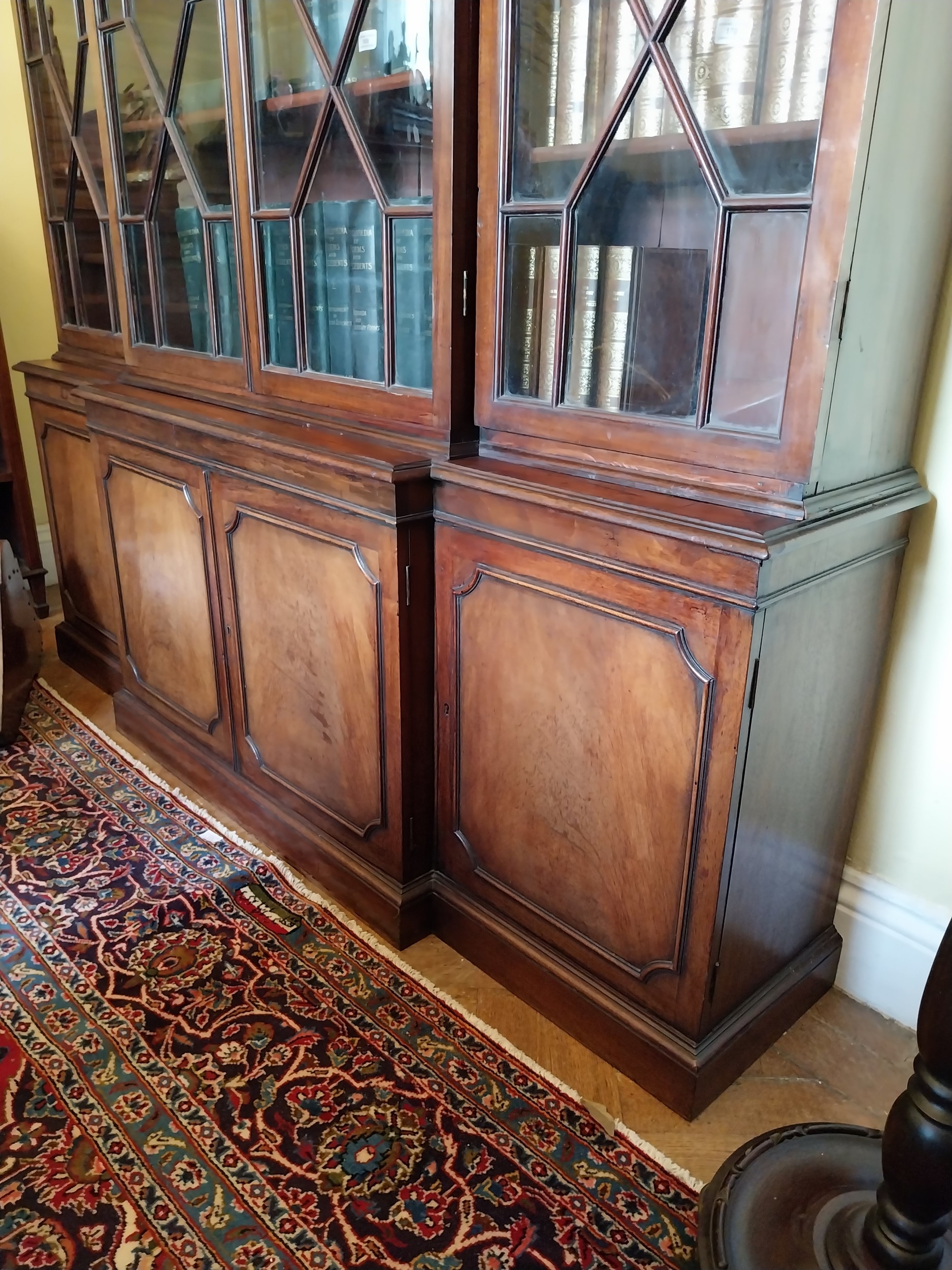Good quality Irish Georgian mahogany bookcase the four astragal glazed doors above four panelled doors, raised on platform base. { 220cm H X 180cm W X 37cm D }.