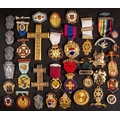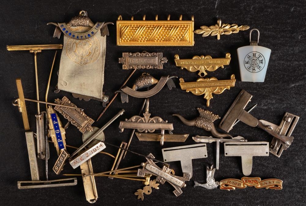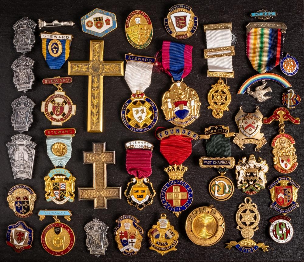 A collection of Masonic jewels: various lodges and makers including Mark Benevolent Fund jewels, a Founder's jewel for Huyshe Chapter RC NO.83, a group of ribbon holders, two crucifixes, stewards badges and others (a lot)