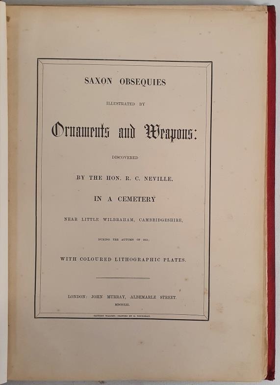 Hon. R.C. Neville. Saxon 0bsequies illustrated by Ornaments and Weapons discovered by Neville in a Cemetery. 1852. 1st Folio. 40 fine coloured lithograph plates. Original red cloth, gilt title