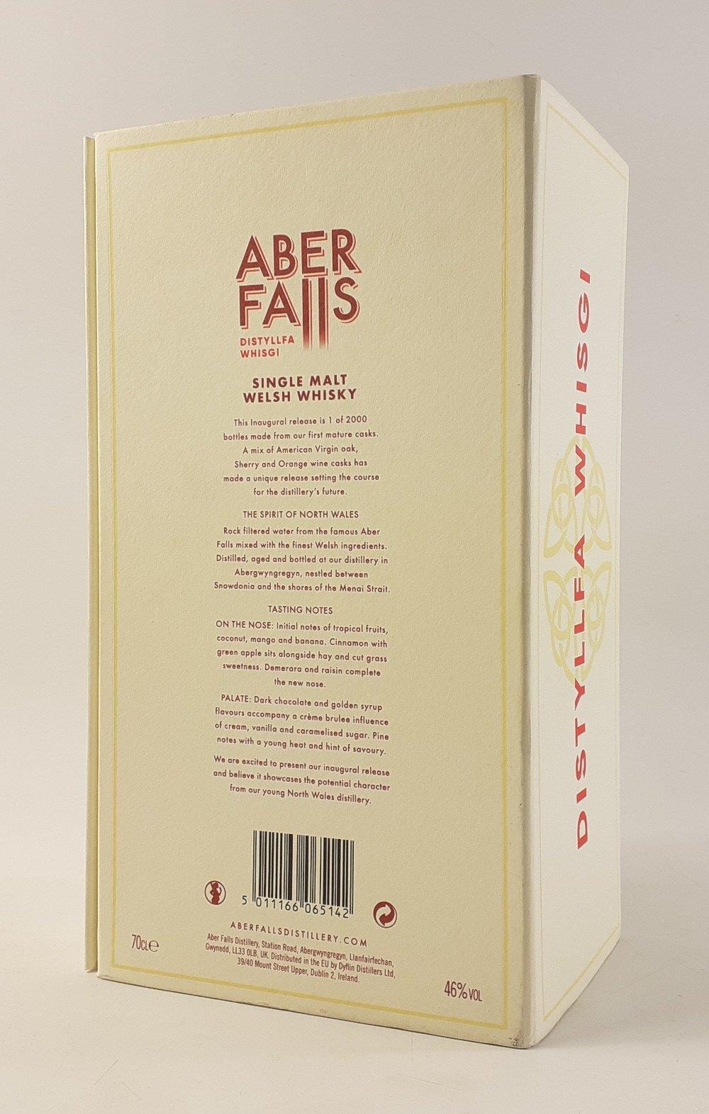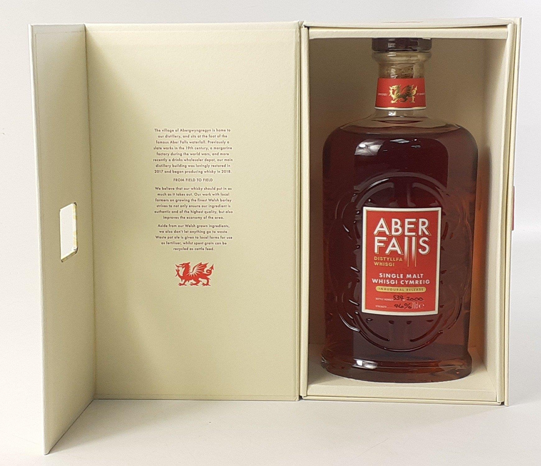 An ABER FALL inaugural release 70cl bottle of Distyllfa Whisgi WELSH single malt whisky, limited edition bottle 534 of 2000, in presentation box