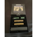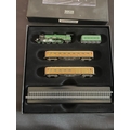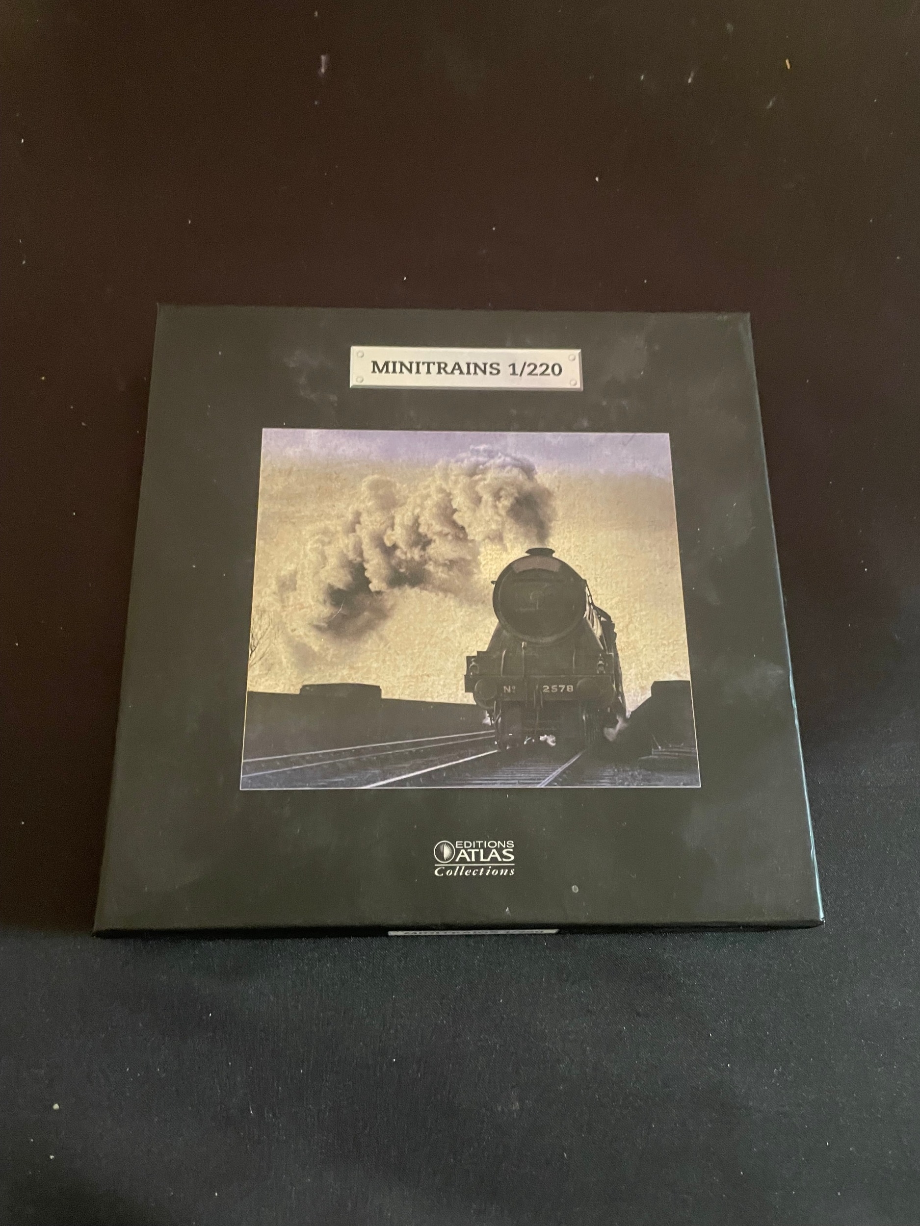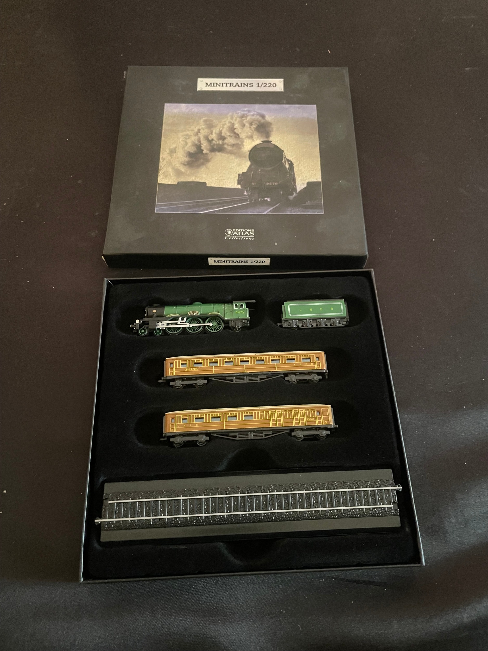 An Atlas Editions Minitrains 1/220 Z Scale model railway set. This lot comprises 1 set, which includes a green LNER steam locomotive numbered '2578', a matching green LNER tender, two brown and tan LNER passenger coaches numbered '24105' and '42082', and a segment of straight model railway track. The components are housed within their original dark rectangular box, which features an image of a steam locomotive '2578' on the lid. A fitted, flocked insert securely holds the models. The models appear to be constructed from a combination of plastic and metal, designed for static display.