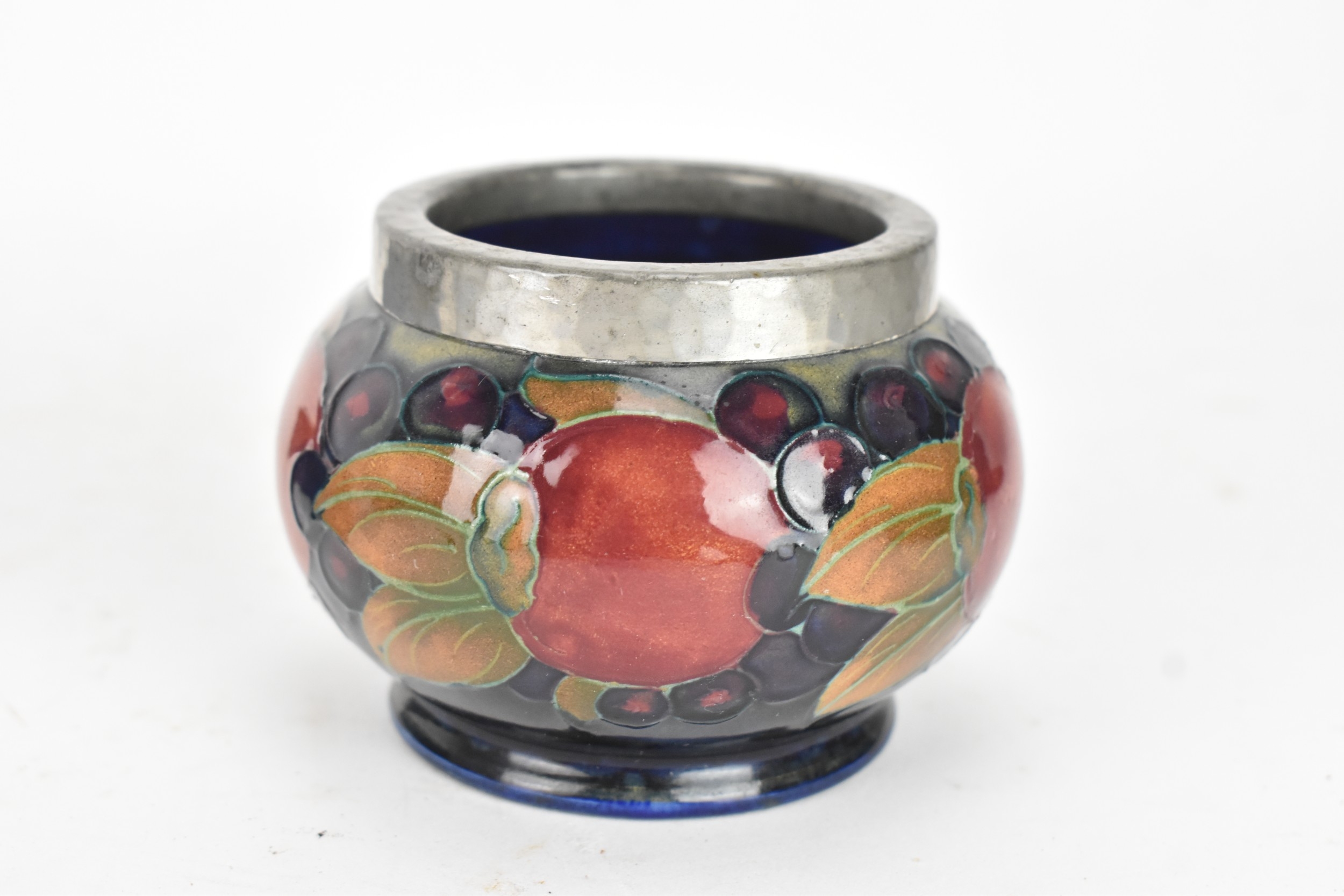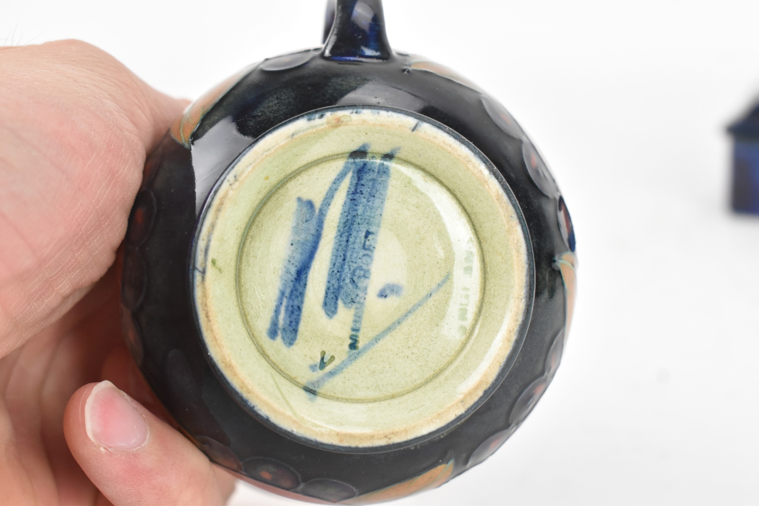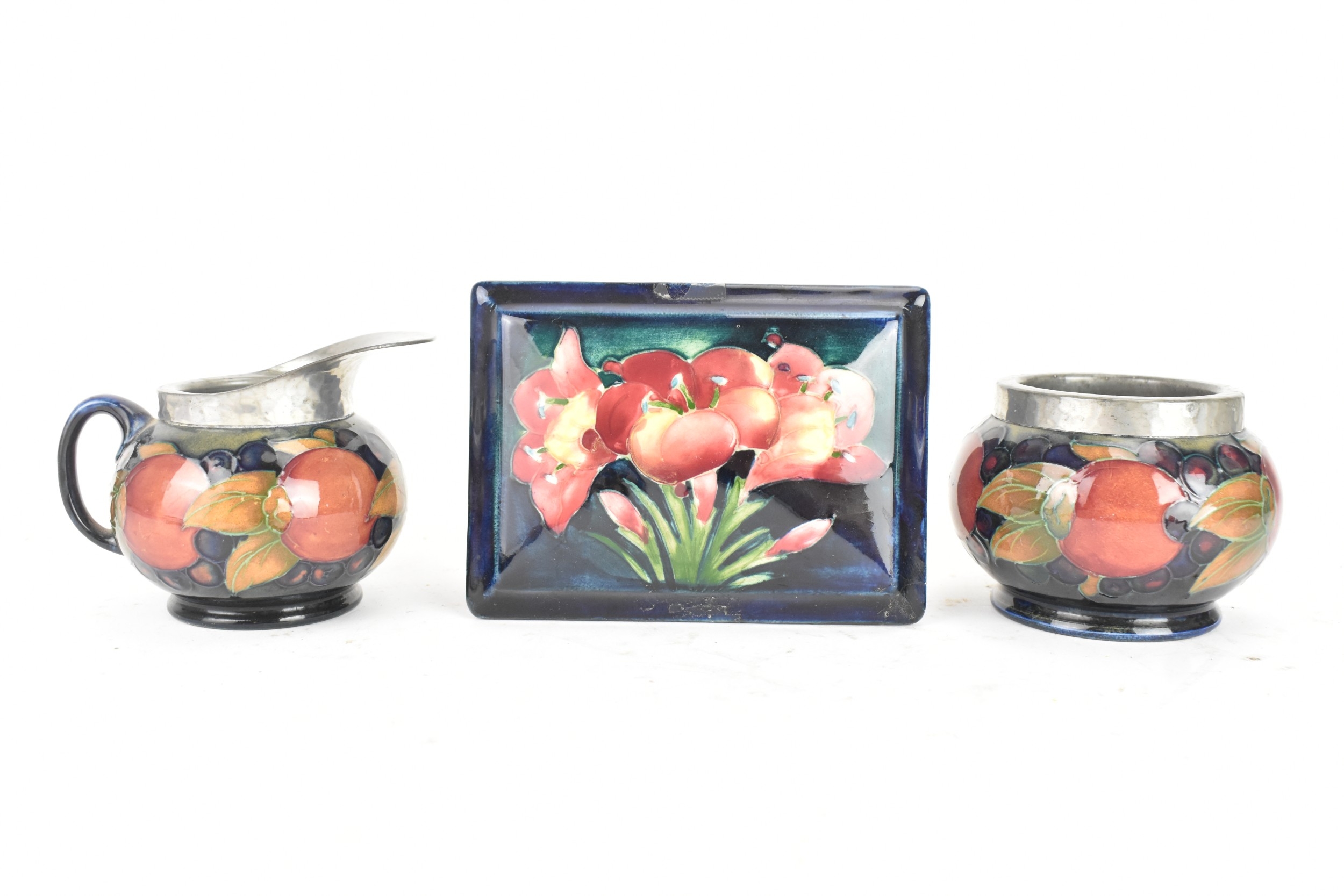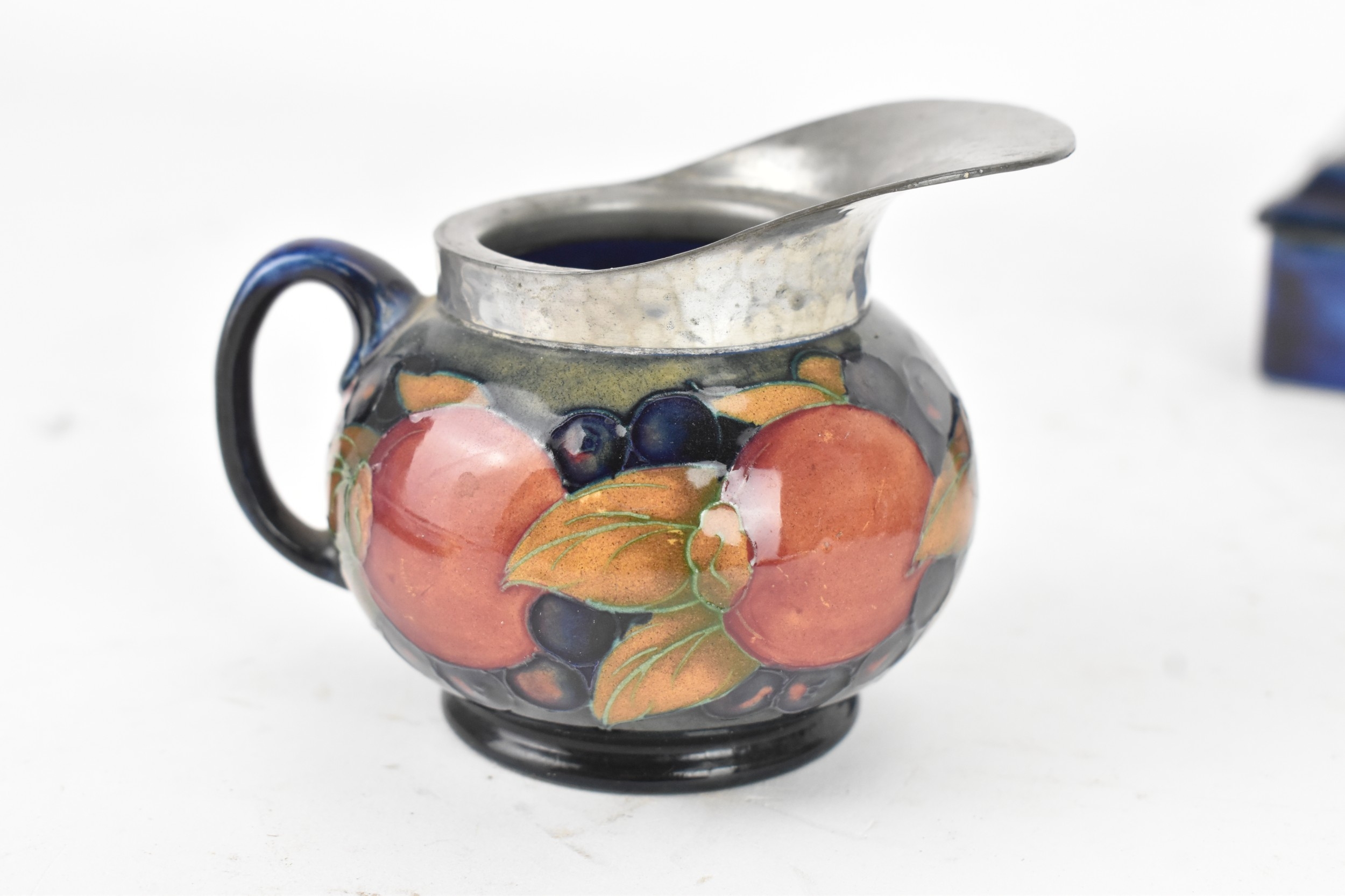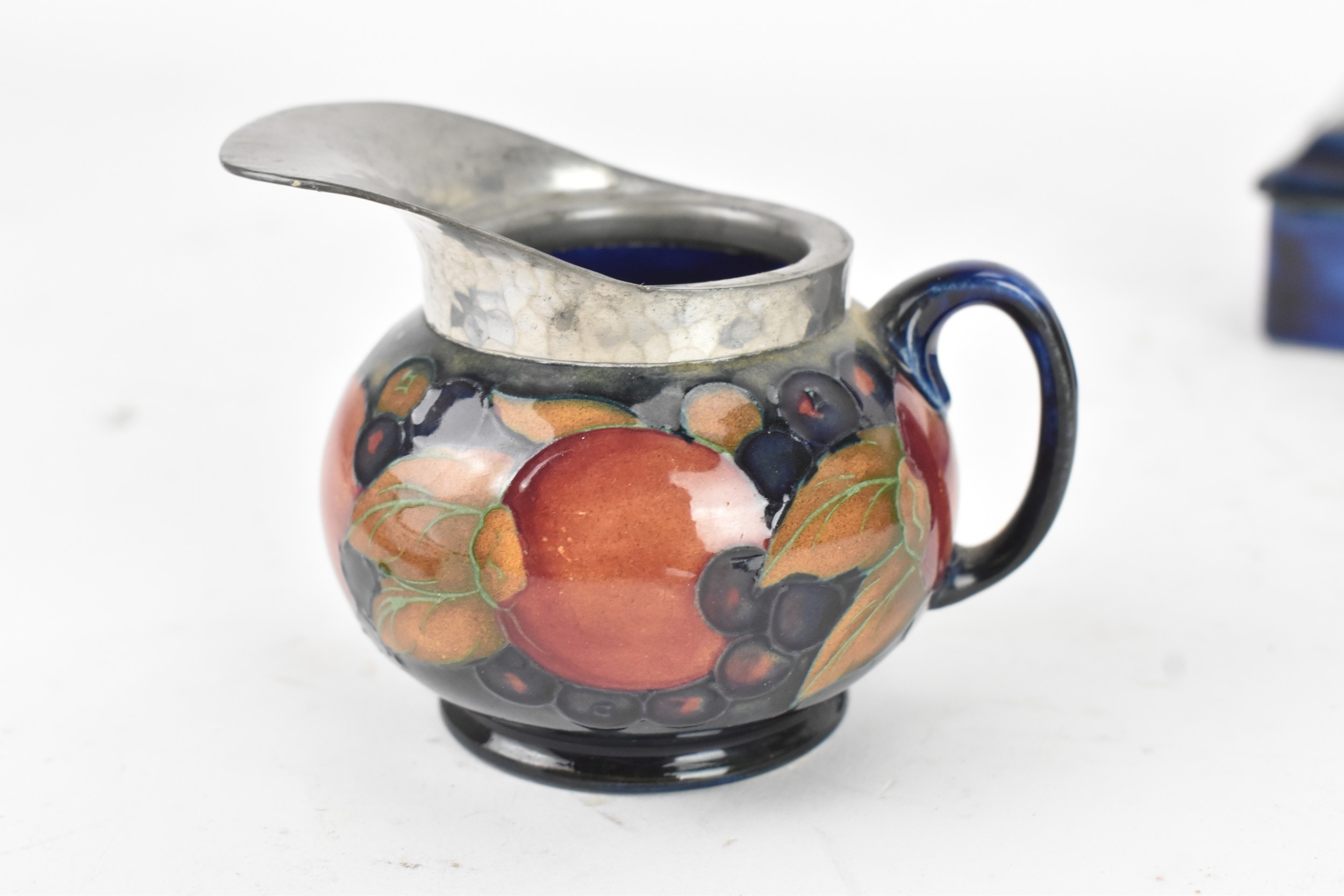 A group of early/mid 20th century Moorcroft pottery to include a 'pomegranate' patter pewter mounted milk jug 7.2cm high, and a sugar bowl 6.5cm high, together with a lidded box 5cm high x 12cm wide, each tubelined with fruit and floral motifs on cobalt blue grounds, impressed and painted Moorcroft marks to bases